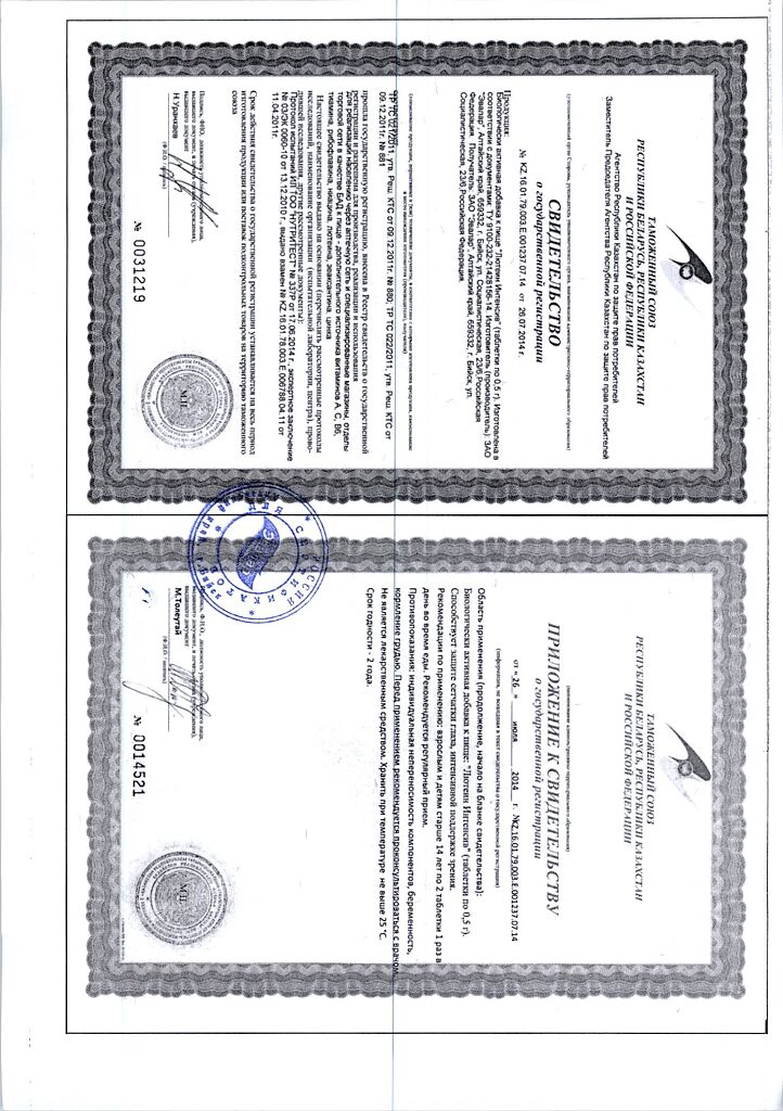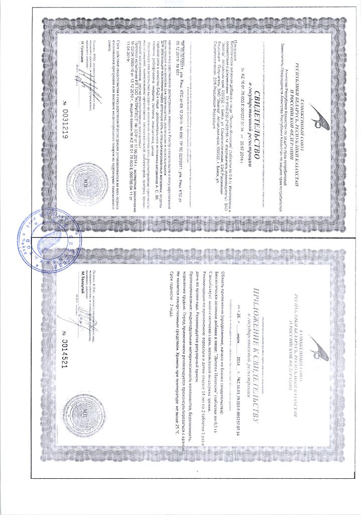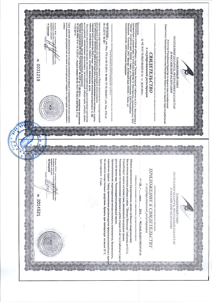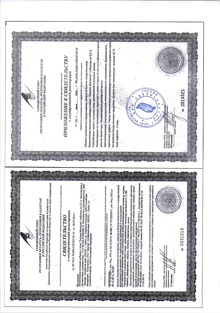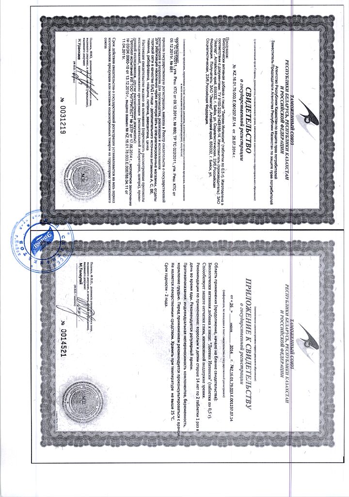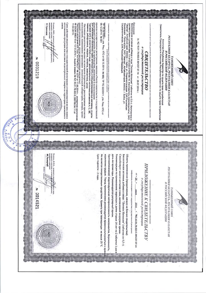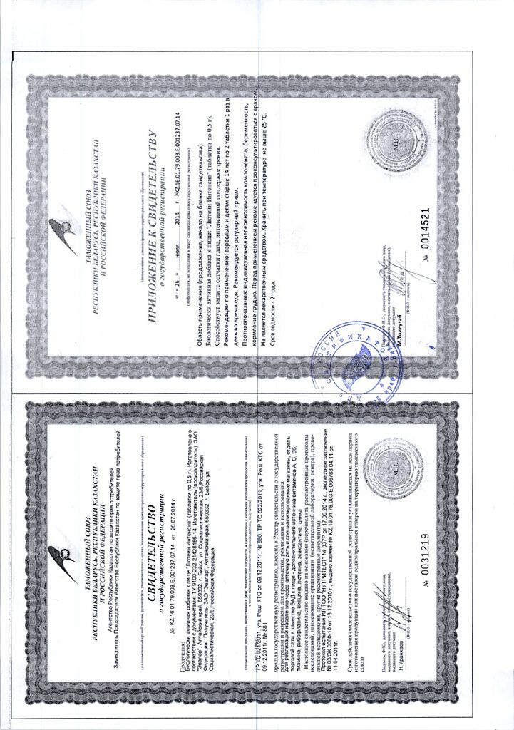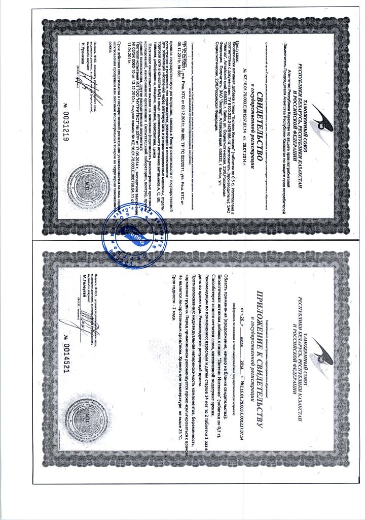 • Прием двух таблеток удовлетворяет суточную физиологическую потребность организма в витаминах А, В 1 , В 2 , В 6 , С, РР, микроэлементе ценке на 100%.