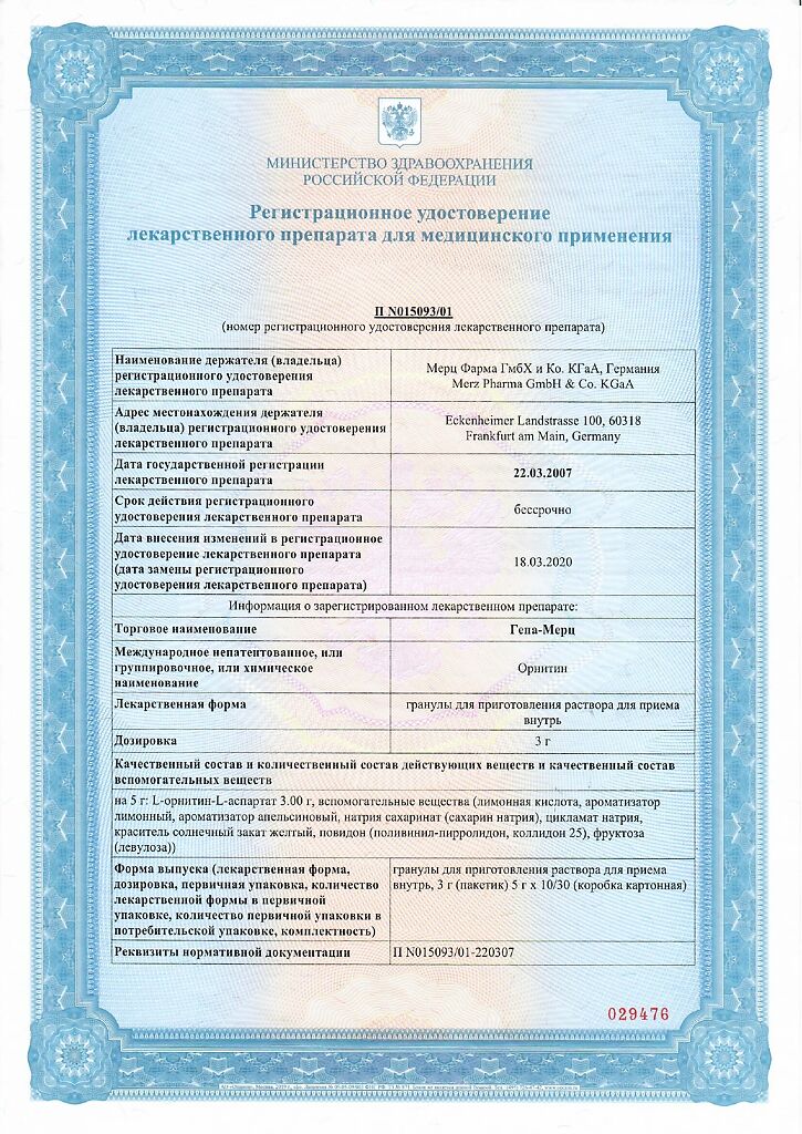 Диссоциирует на орнитин и аспартат, которые всасываются в тонкой кишке путем активного транспорта через кишечный эпителий. Выводится с мочой через цикл мочевинообразования.