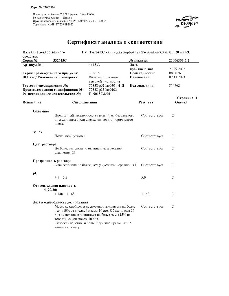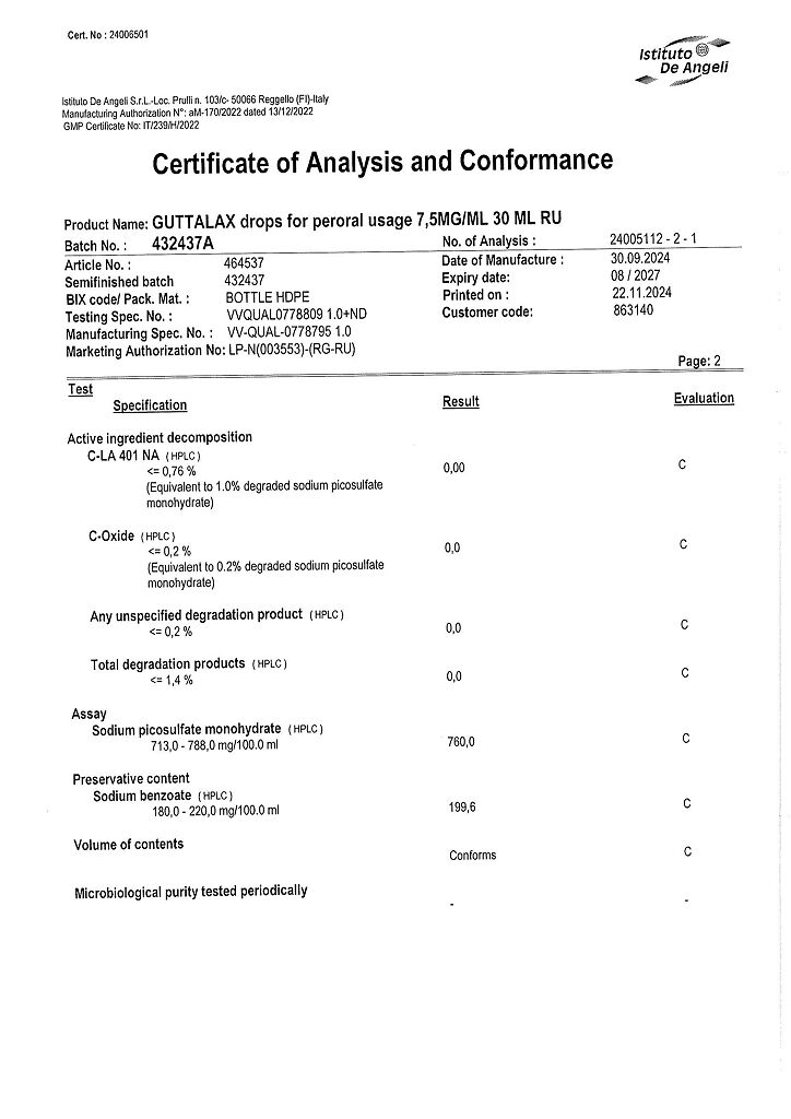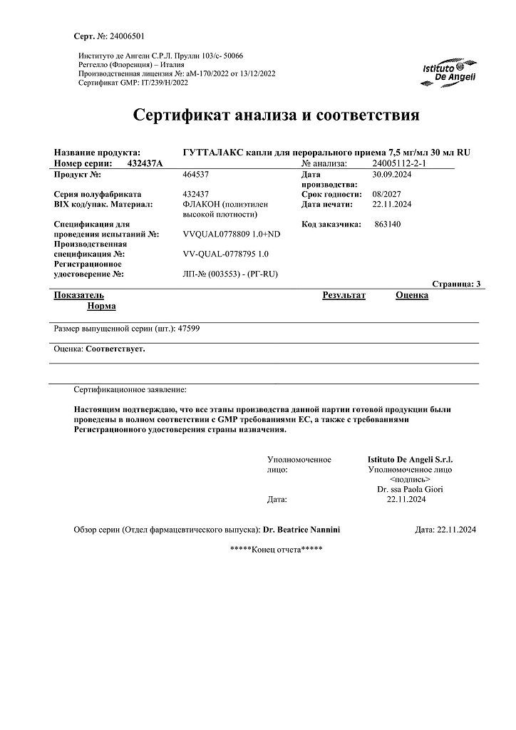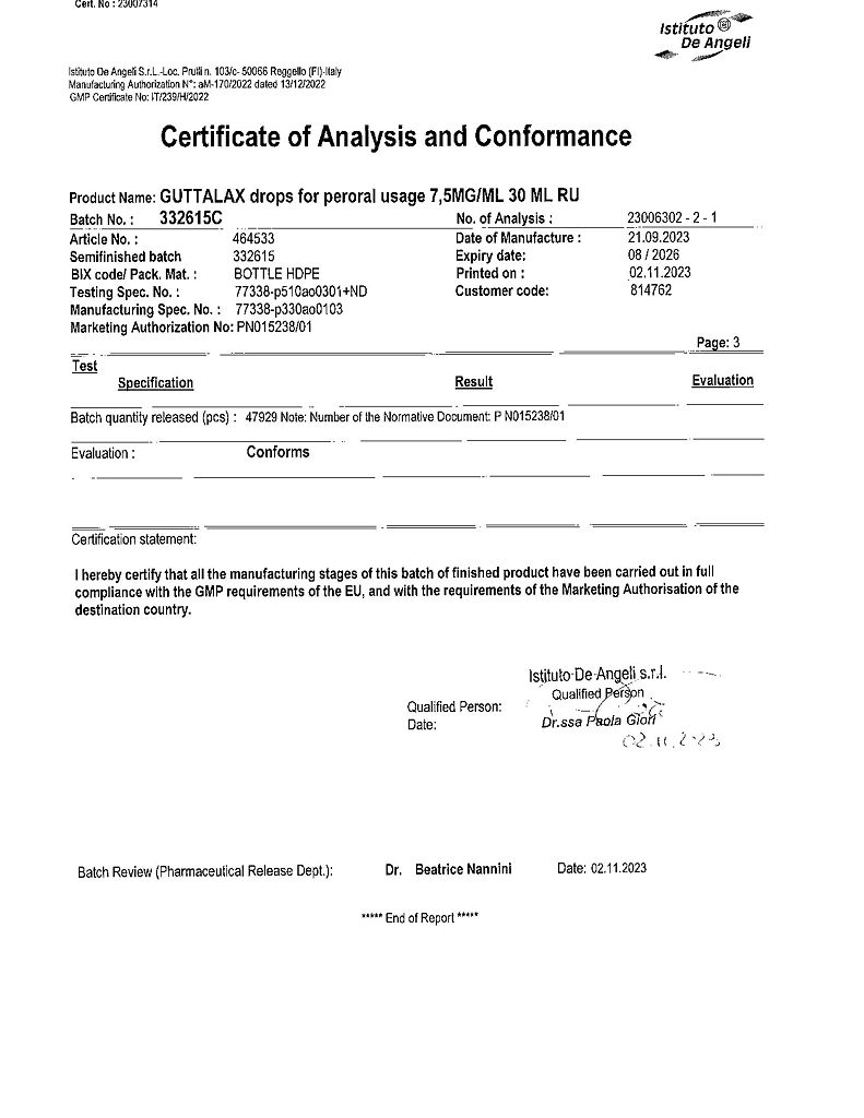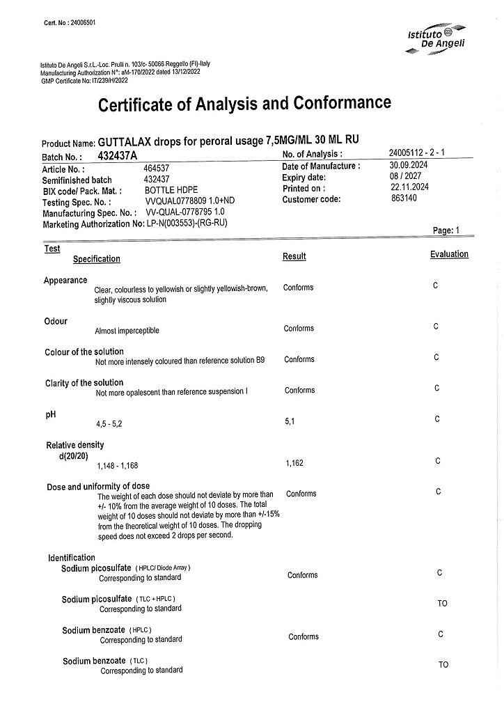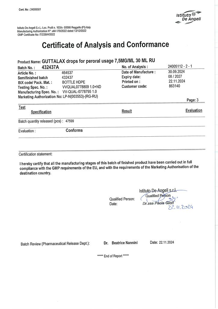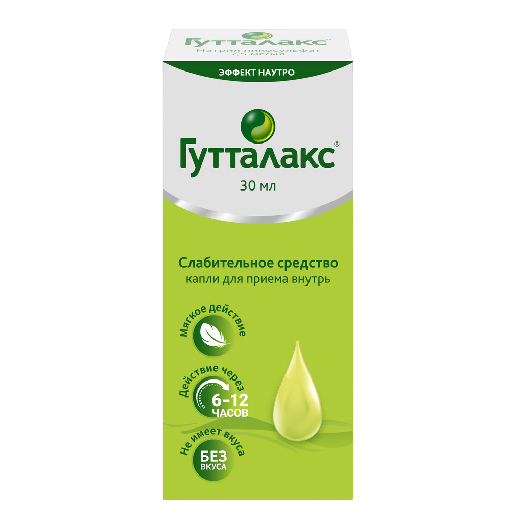 Гутталакс - слабительный препарат. Действующее вещество - натрия пикосульфат - представляет собой слабительное триарилметановой группы.