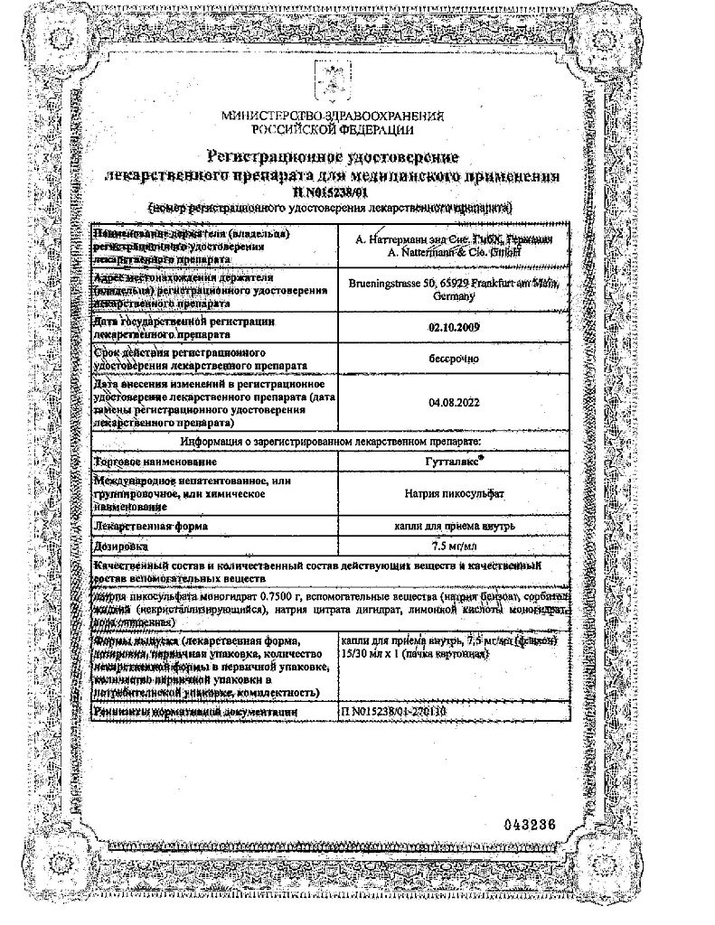 Гутталакс принимают внутрь, перед сном. Взрослым ,начальная доза — 10 капель, при тяжелых и стойких запорах — до 30 капель. Детям старше 4 лет начальная доза — 5-10 капель. В зависимости от полученного эффекта дозу при последующих приемах увеличивают или уменьшают.