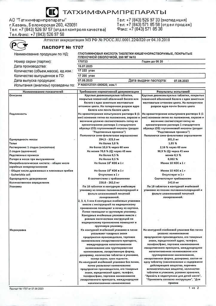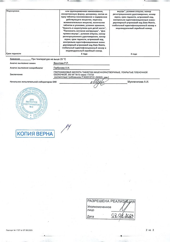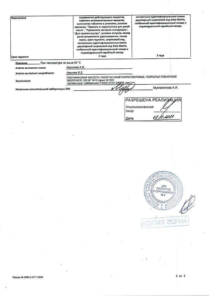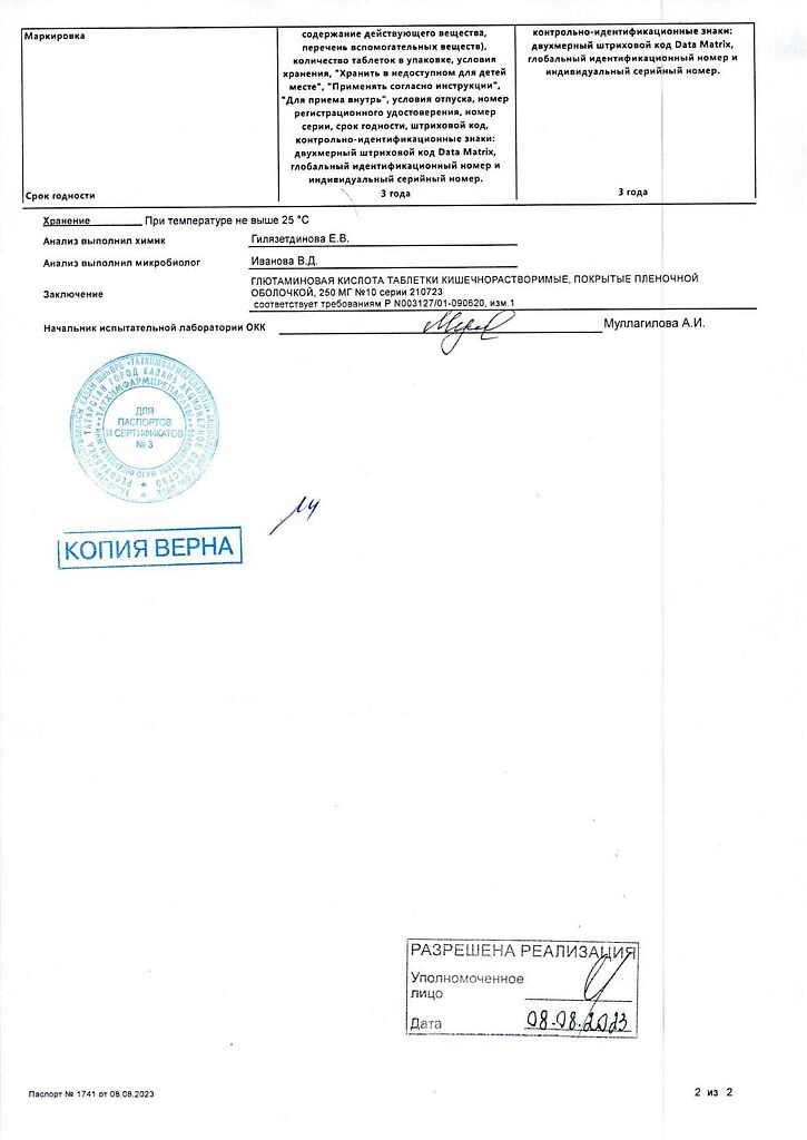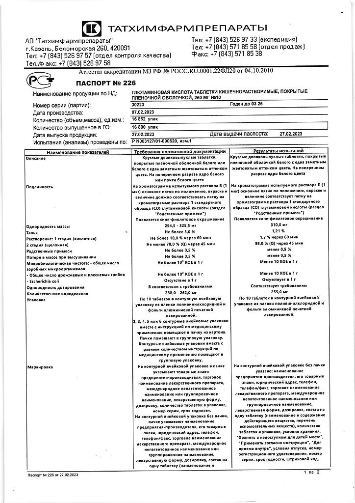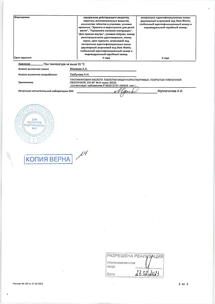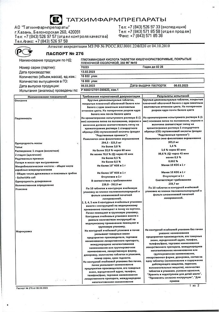 глутаминовой кислоты (L-Глютаминовой кислоты) - 250 мг.