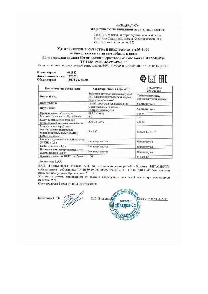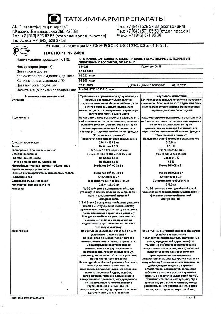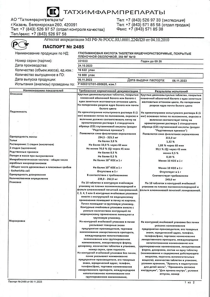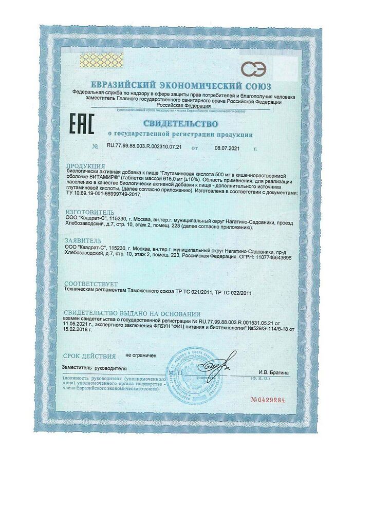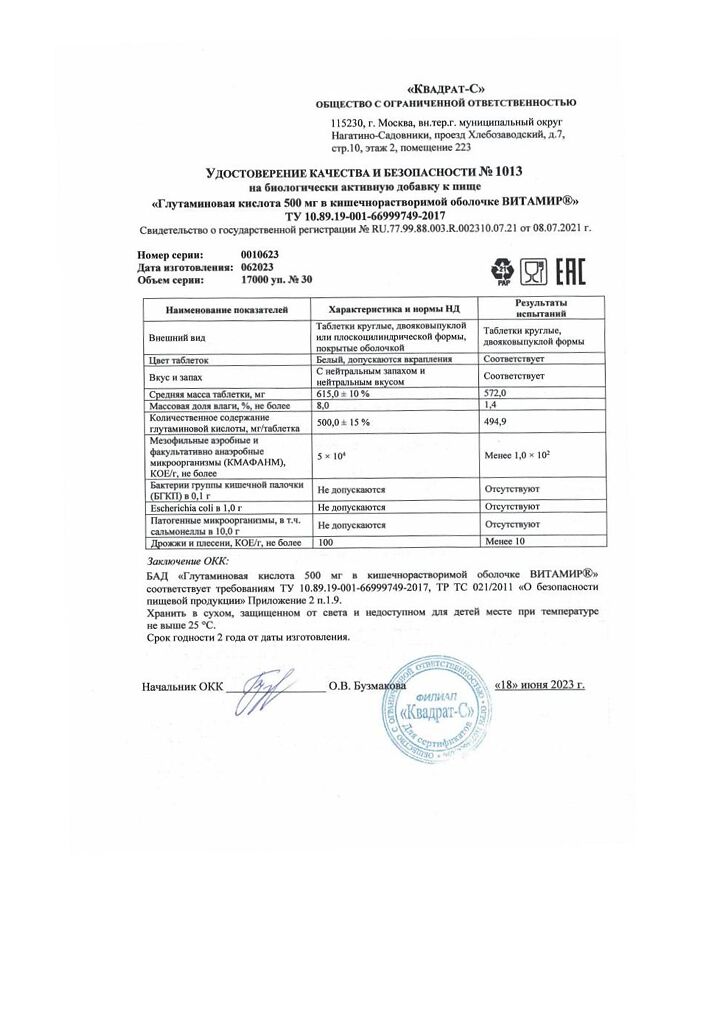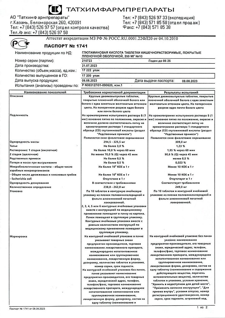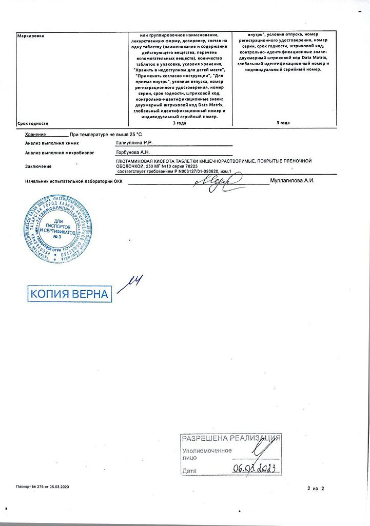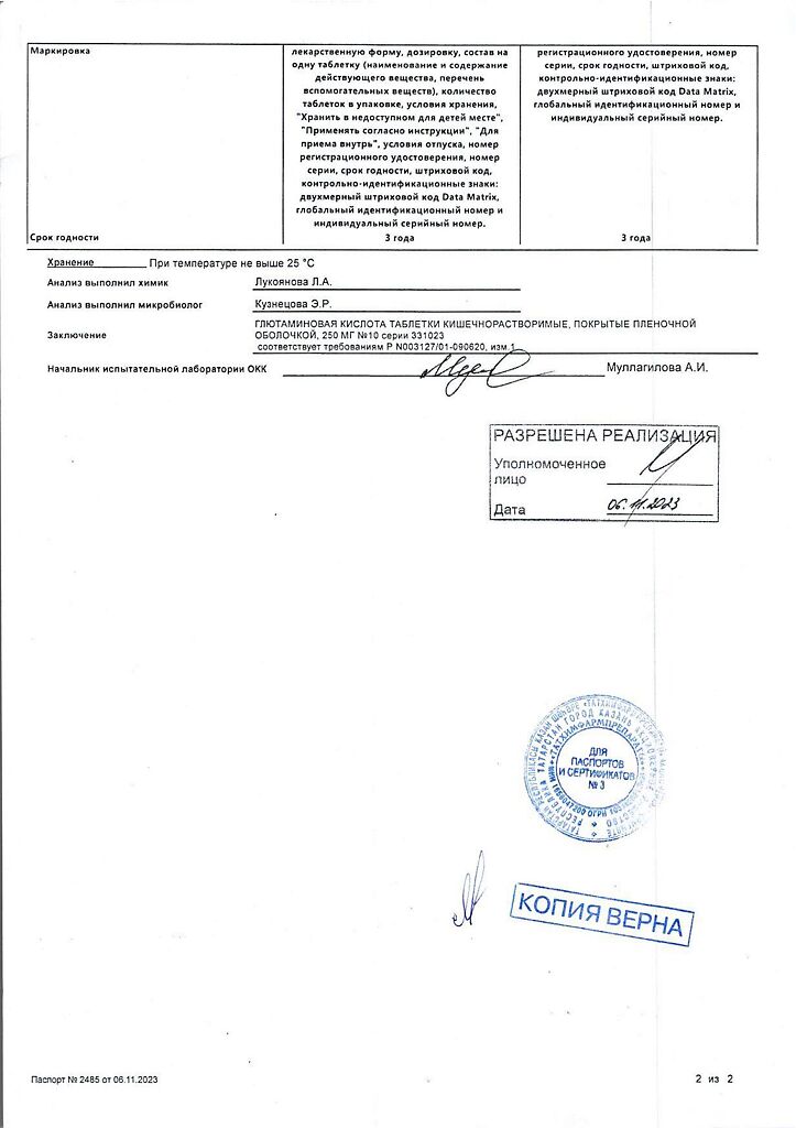 глутаминовой кислоты (L-Глютаминовой кислоты) - 250 мг.