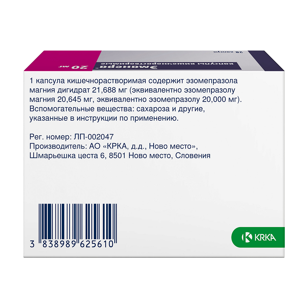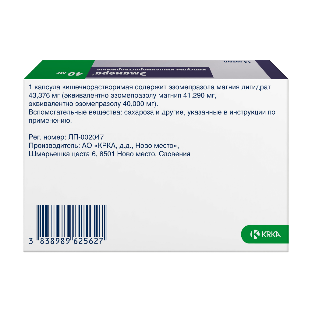 Эзомепразола магния дигидрат 21,688 мг/43,376 мг (эквивалентно эзомепразолу магния 20,645 мг/41,290 мг, эквивалентно эзомепразолу 20,000 мг/40,000 мг)