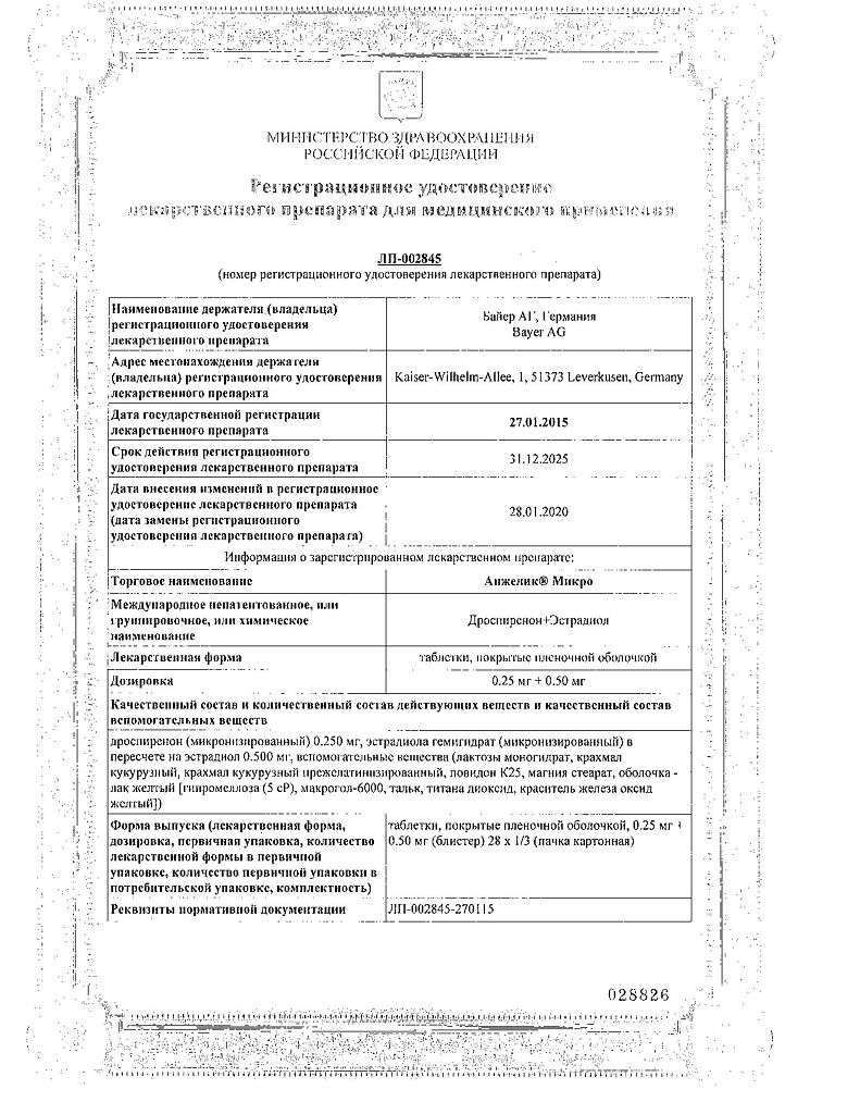 Терапия препаратом Анжелик® Микро в течение 2 лет приводила к увеличению МПКТ приблизительно на 3–5%, в то время как при приеме плацебо МПКТ снижалась примерно на 0,5%. Была обнаружена значительная статистическая разница между показателями МПКТ в костях таза у пациенток в группах активного лечения (с остеопенией и без остеопении) по сравнению с плацебо. Также отмечалось увеличение МПКТ во всем теле и в поясничном отделе позвоночника у пациенток из группы активного лечения.