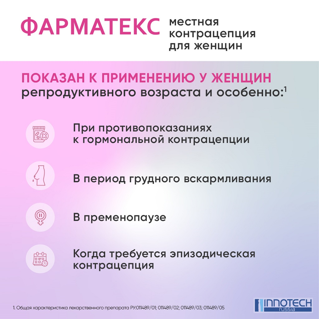 – невозможность правильного применения Фарматекса у лиц с нарушениями психики или лиц, не допускающих любые вмешательства на половых органах, и которые препятствуют использованию контрацептива;