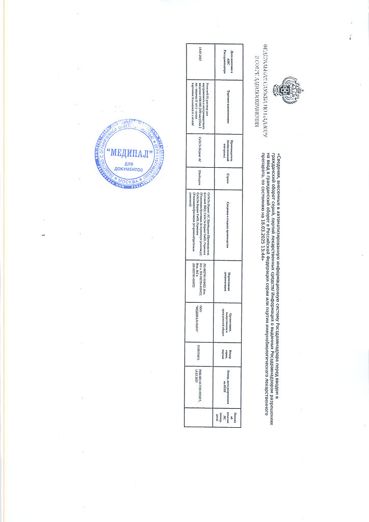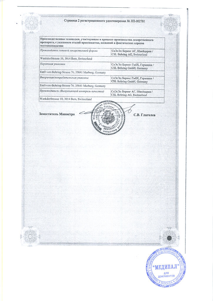 Стандартные меры по предотвращению передачи инфекций вследствие применения лекарственных препаратов изготовленных из крови или плазмы человека включают отбор доноров проверку индивидуальных донаций и пулов плазмы на наличие специфических маркеров инфекции и включение эффективных этапов производства направленных на инактивацию и/или удаление вирусов. Несмотря на это при применении препаратов полученных из крови или плазмы человека нельзя полностью исключить возможность передачи инфекционных агентов. Это положение также применимо в отношении неизвестных или новых вирусов и других инфекционных агентов. Предпринимаемые меры считаются эффективными против вирусов имеющих оболочку таких как ВИЧ вирусы гепатита В и С. Они могут быть частично эффективными против вирусов без оболочки таких как вирус гепатита А и парвовирус В 19.