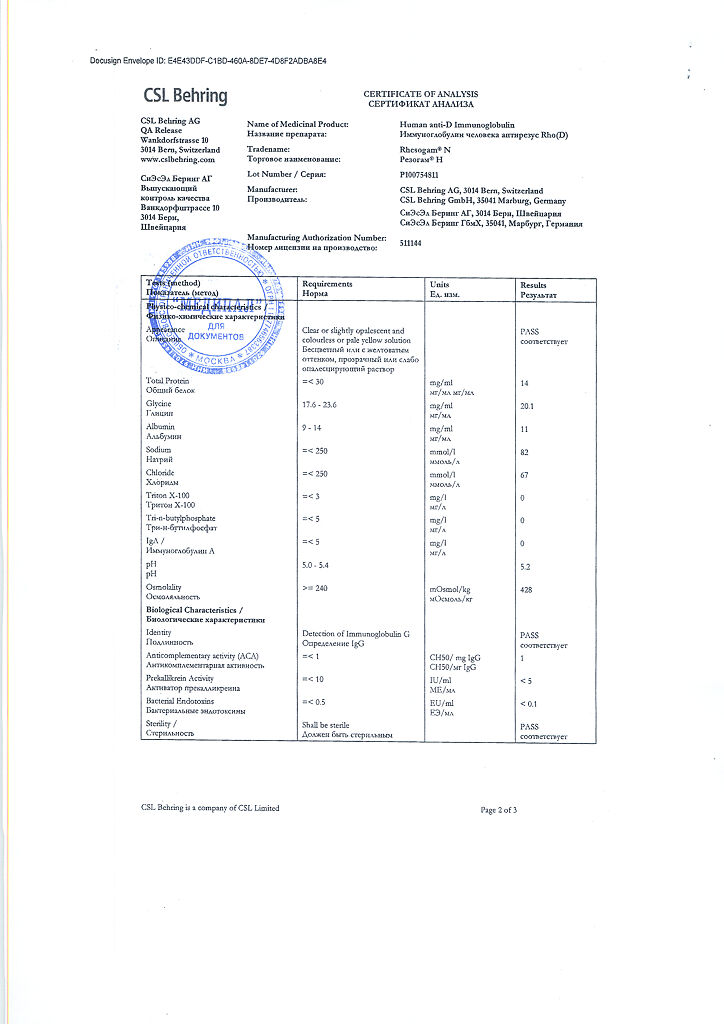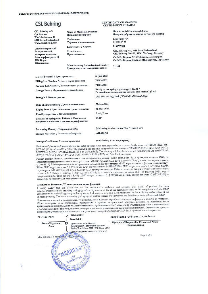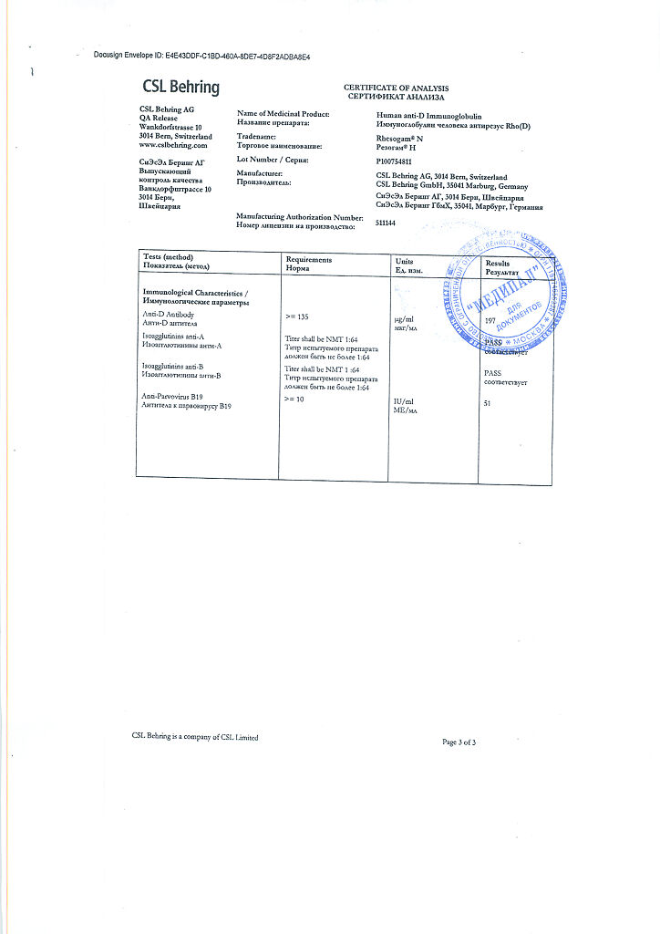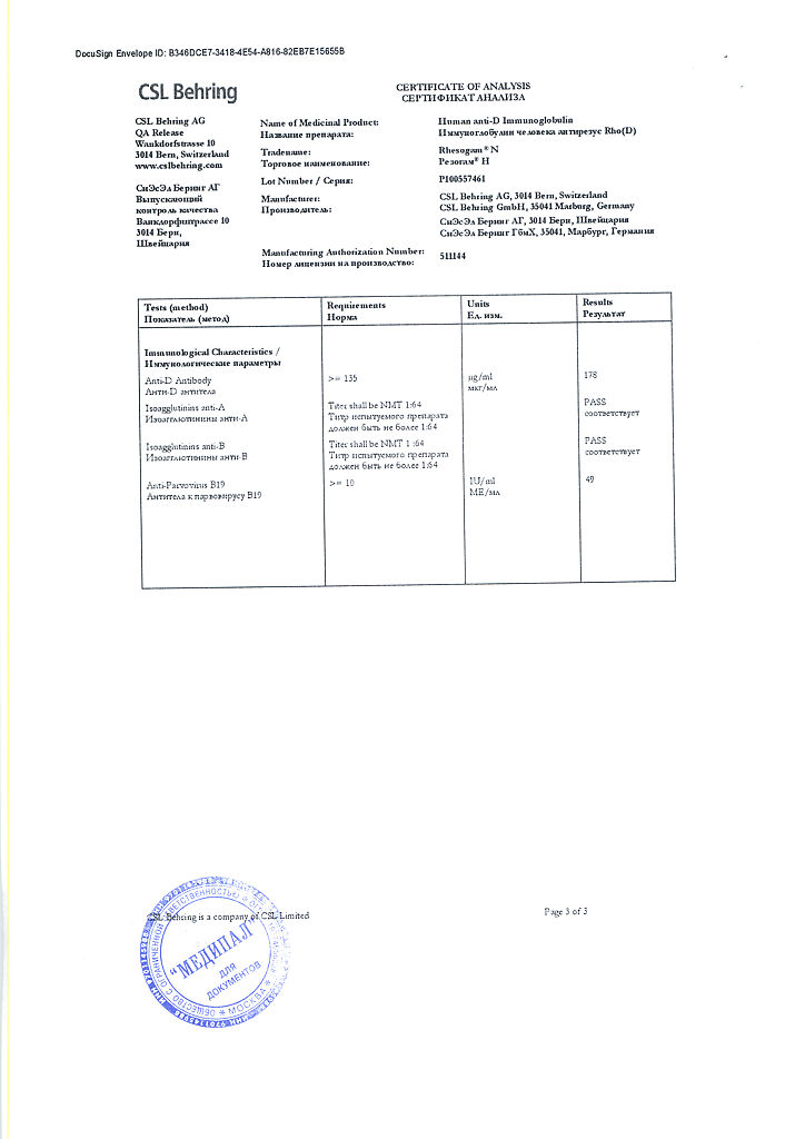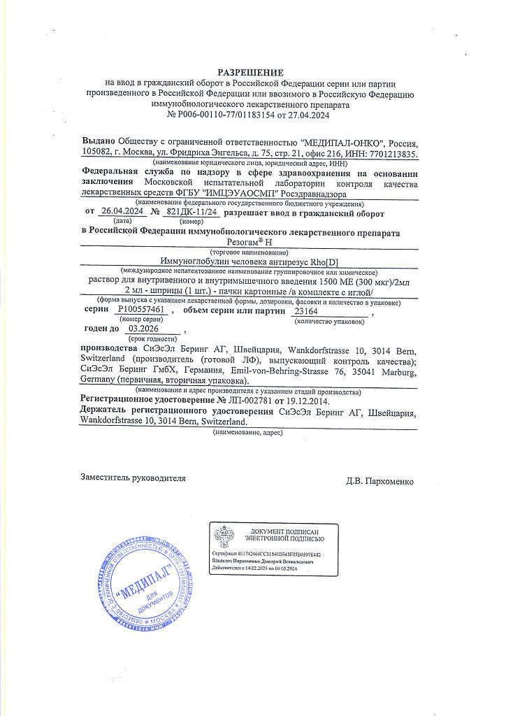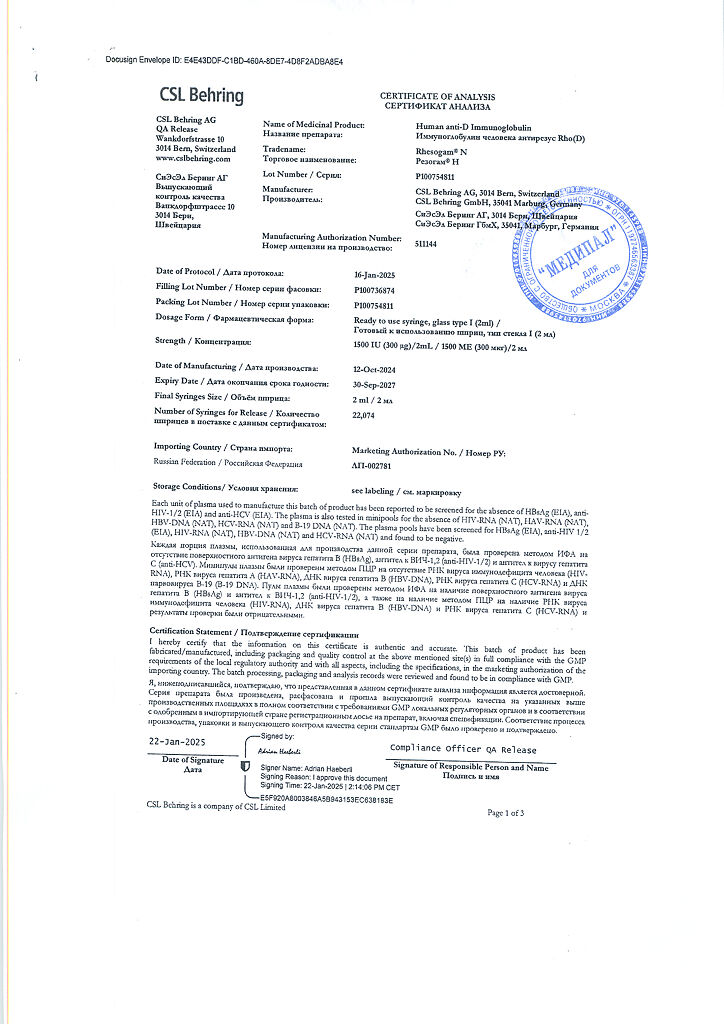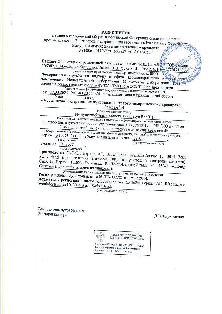 Настоятельно рекомендуется каждый раз при введении препарата Резогам® Н пациенту записывать наименование и номер серии препарата чтобы сохранить связь между пациентом и серией препарата.