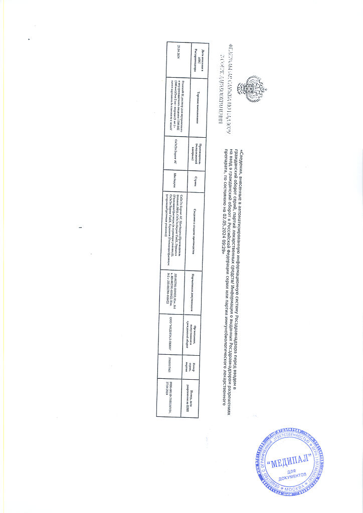 Поддающиеся измерению показатели содержания антител можно получить приблизительно через 4 часа после внутримышечного введения. Максимальная концентрация в сыворотке крови обычно достигается через 5 дней. После внутривенного введения поддающиеся измерению показатели содержания антител определяются сразу же после инъекции.
