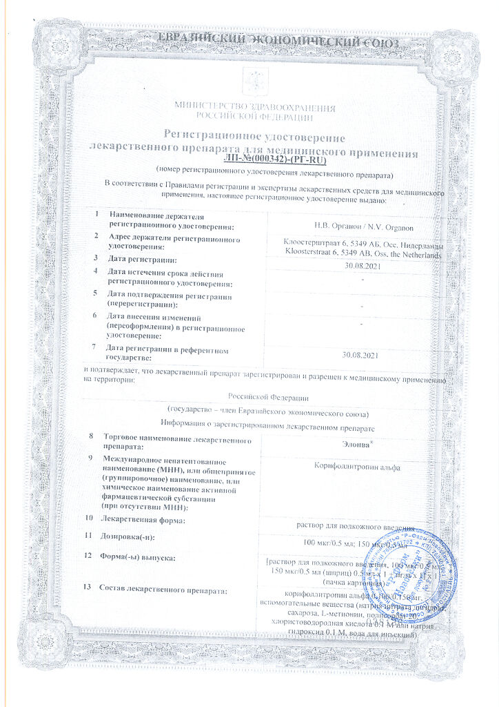 действующее вещество :корифоллитропин альфа 100 и 150 мкг;