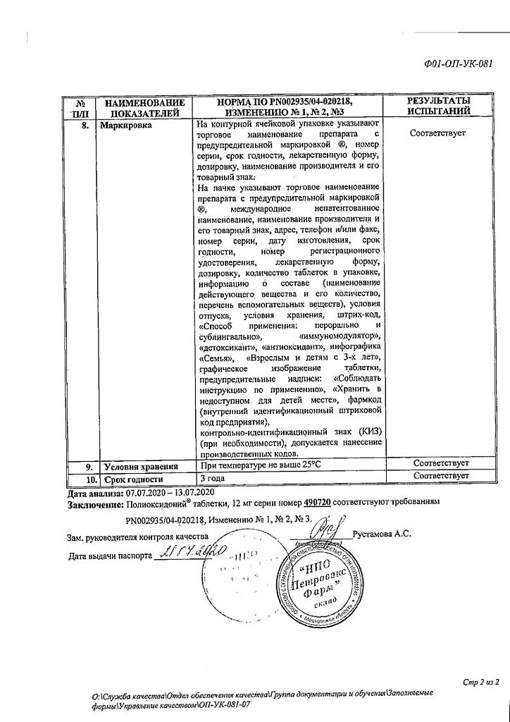 Наряду с иммуномодулирующим действием обладает выраженной дезинтоксикационной и антиоксидантной активностью, обладает способностью выводить из организма токсины, соли тяжелых металлов, ингибирует перекисное окисление липидов. Указанные свойства определяются структурой и высокомолекулярной природой Полиоксидония.