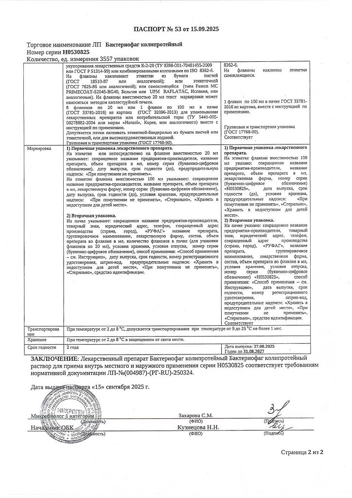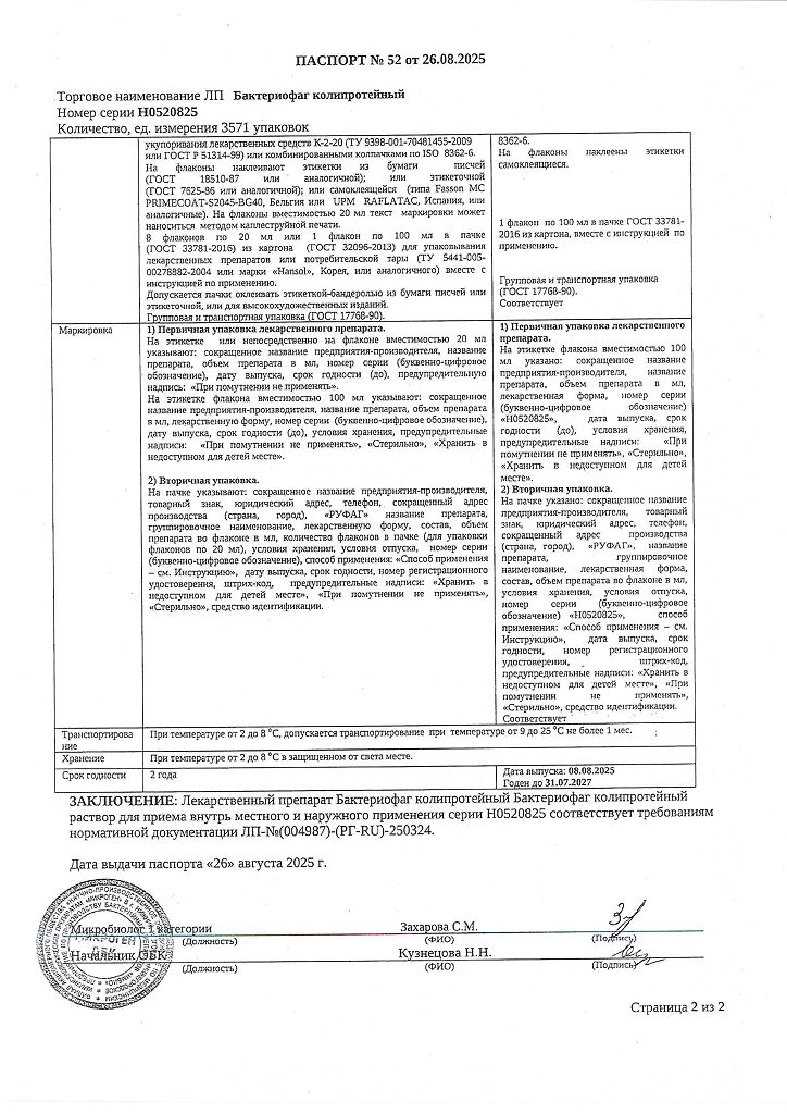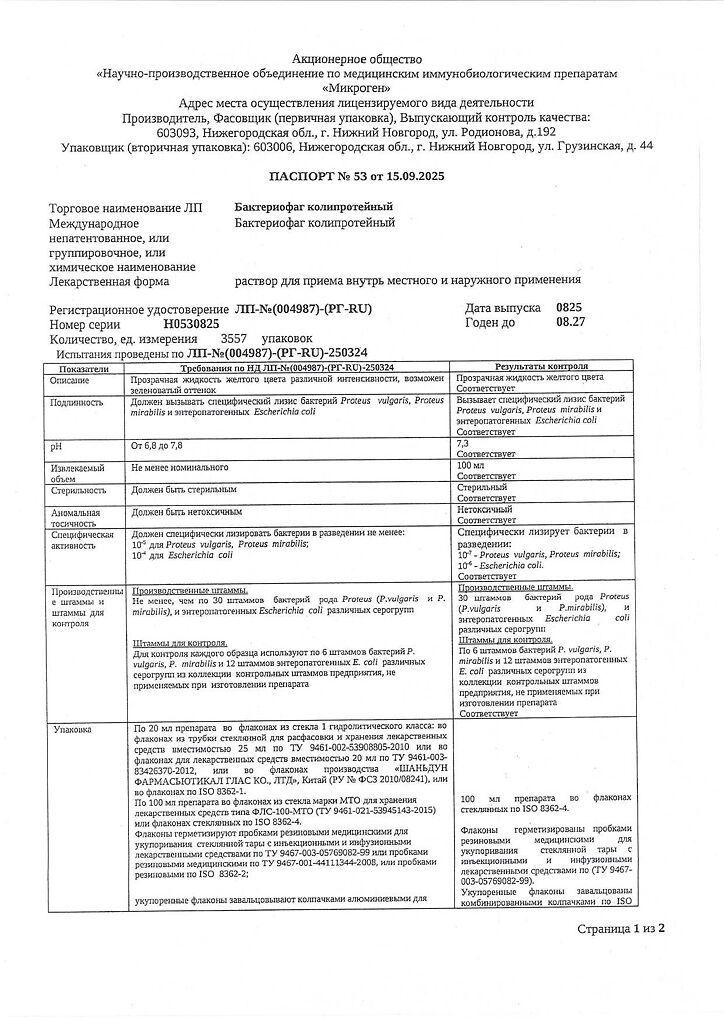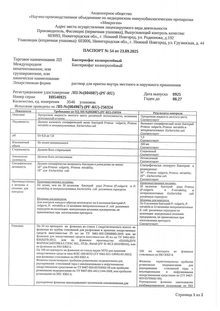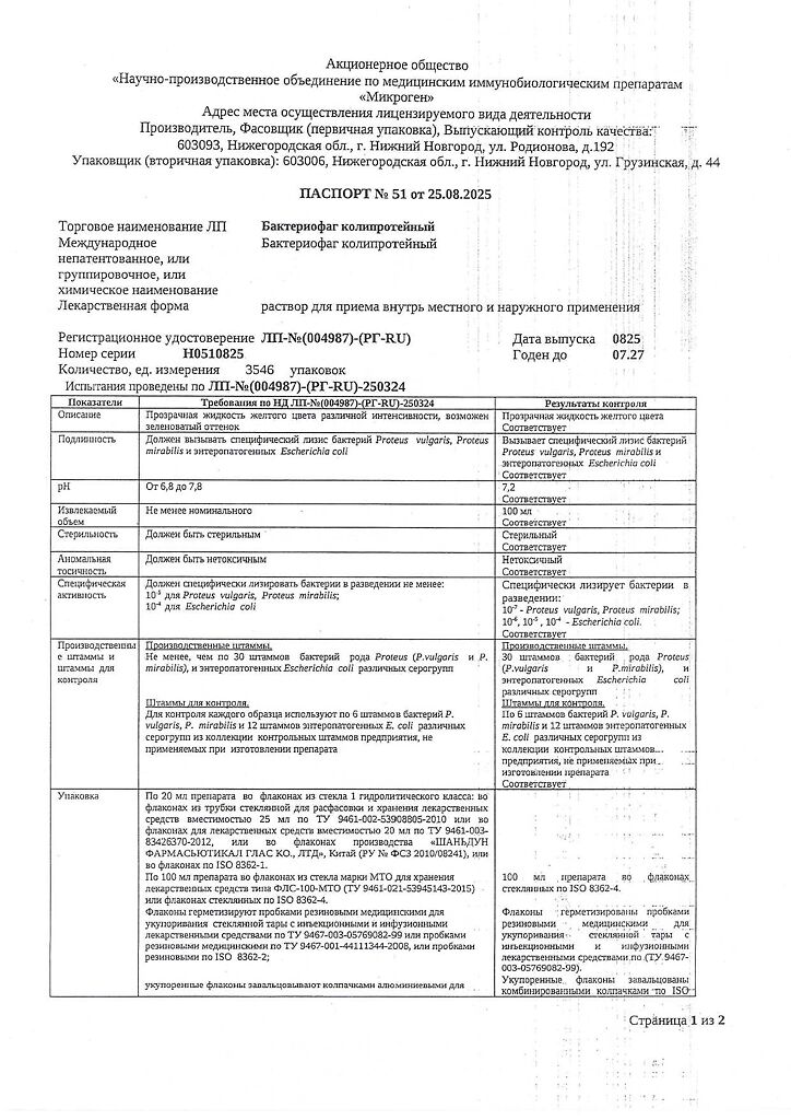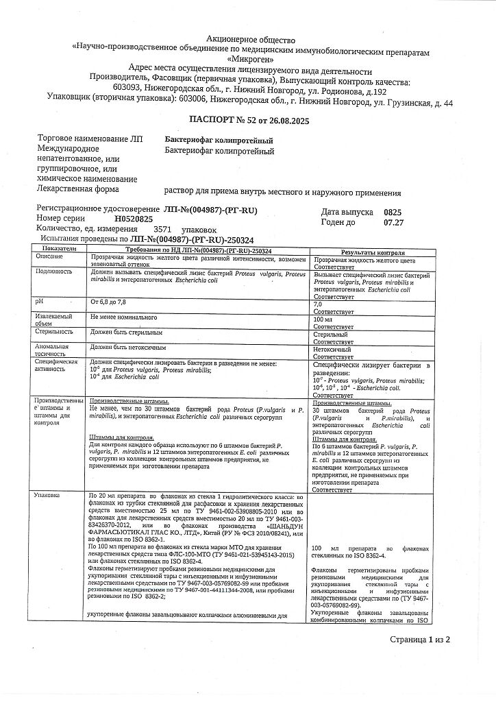 Бактериофаг колипротейный должен вызывать специфический лизис эшерихий (Escherichia), мирабильного и вульгарного протея (Pr.mirabilis и Pr.vulgaris).
