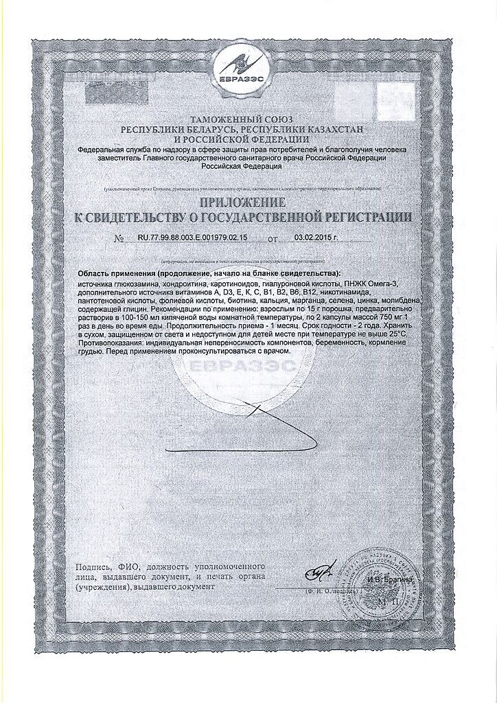 1 порция порошка содержит: D - биотин, никотинамид, кальция - D - пантотенат, сульфат магния, экстракт томатов, рыбий жир, Витамин А - ацетат, обогащенный ликопином, регулятор влажности глицерин, бета-каротин, лактат кальция, D - глюкозаминсульфат (из ракообразных), глюконат цинка, модифицированный крахмал, Витамин К1, стабилизаторгумми - арабикум, Витамин В2, гидролизат коллагена, молибдат натрия, экстракт цитрусовых, Витамин D3, желатин, карбонат кальция, подкислитель лимонная кислота, эмульгатор соевый лецитин, лютеин, сульфат меди, краситель диоксид титана и оксид железа, эмульгатор сложный эфир сахарозы пищевых жирных кислот, Витамин В6 - гидрохлорид, Витамин В1 - мононитрат, гиалуроновая кислота, Декстроза, Витамин В12, Витамин E, хондроитинсульфат (из рыбы), фолиевая кислота, селенат натрия, ароматизатор, мальтодекстрин, N - ацетилцистеин, сахарин ацесульфам К.