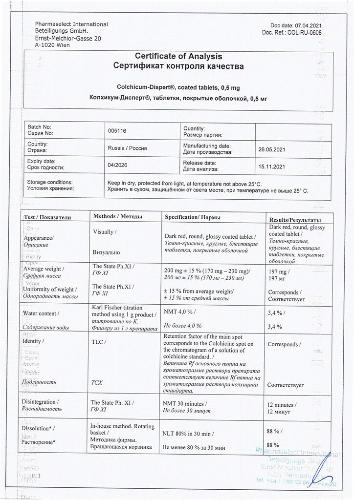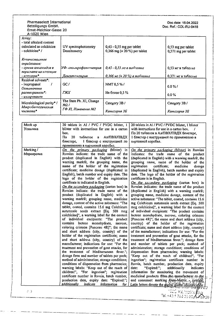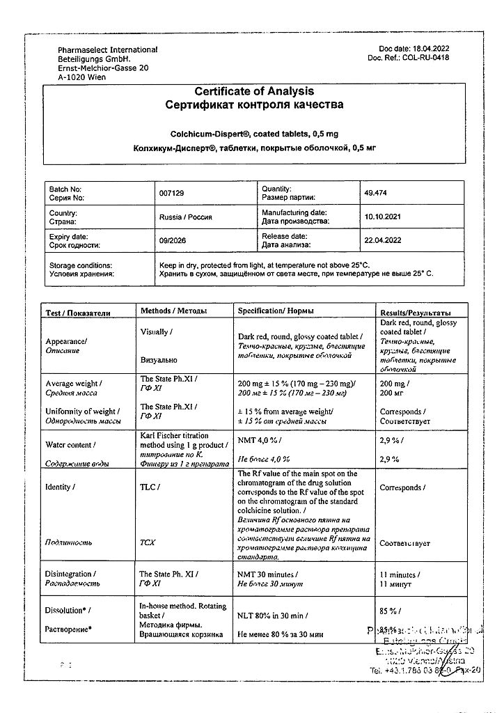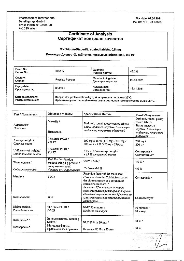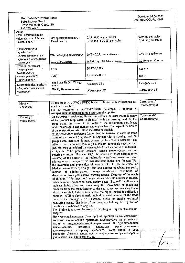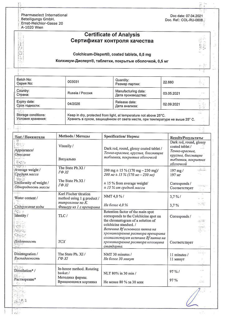 Активное вещество: Безвременника осеннего семян экстракт [экв. 500 мкг колхицина] [ в составе экстракта 57-64 % лактозы, 28-32 % целлюлозы микрокристаллической] 15,6 мг;