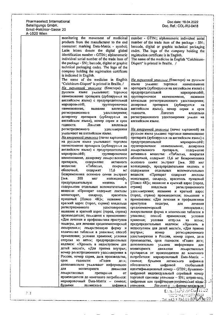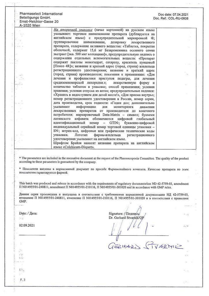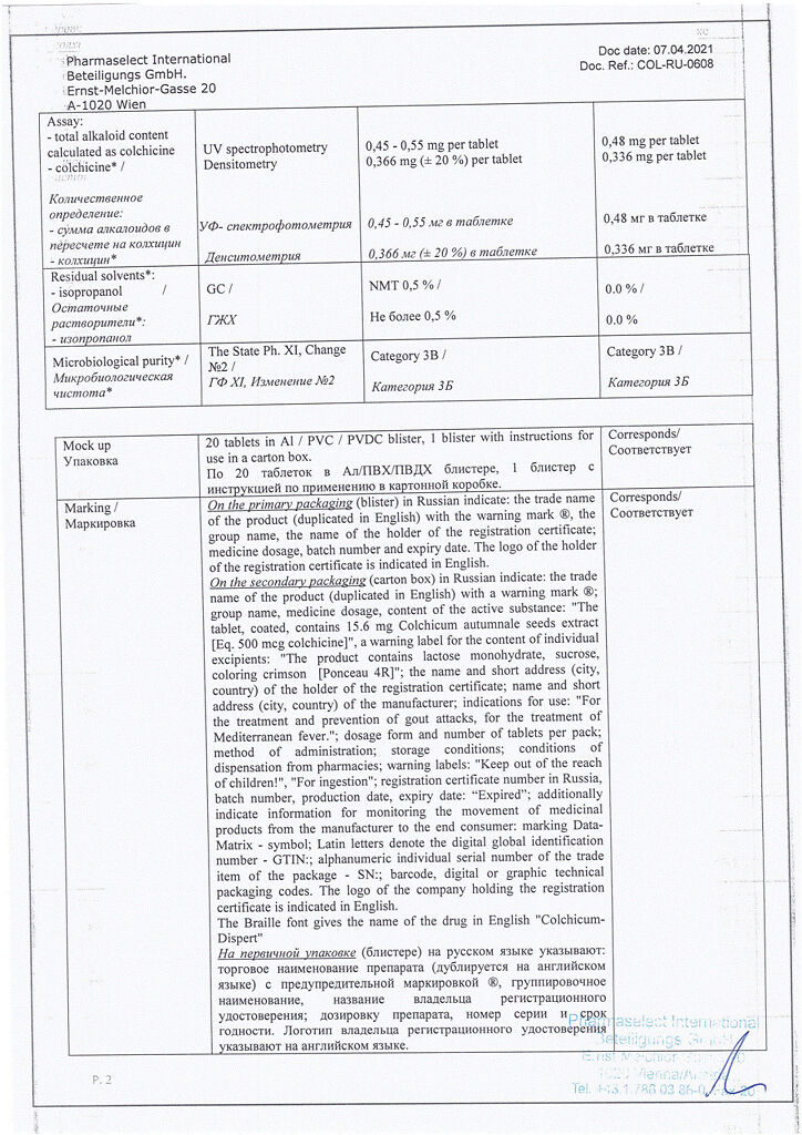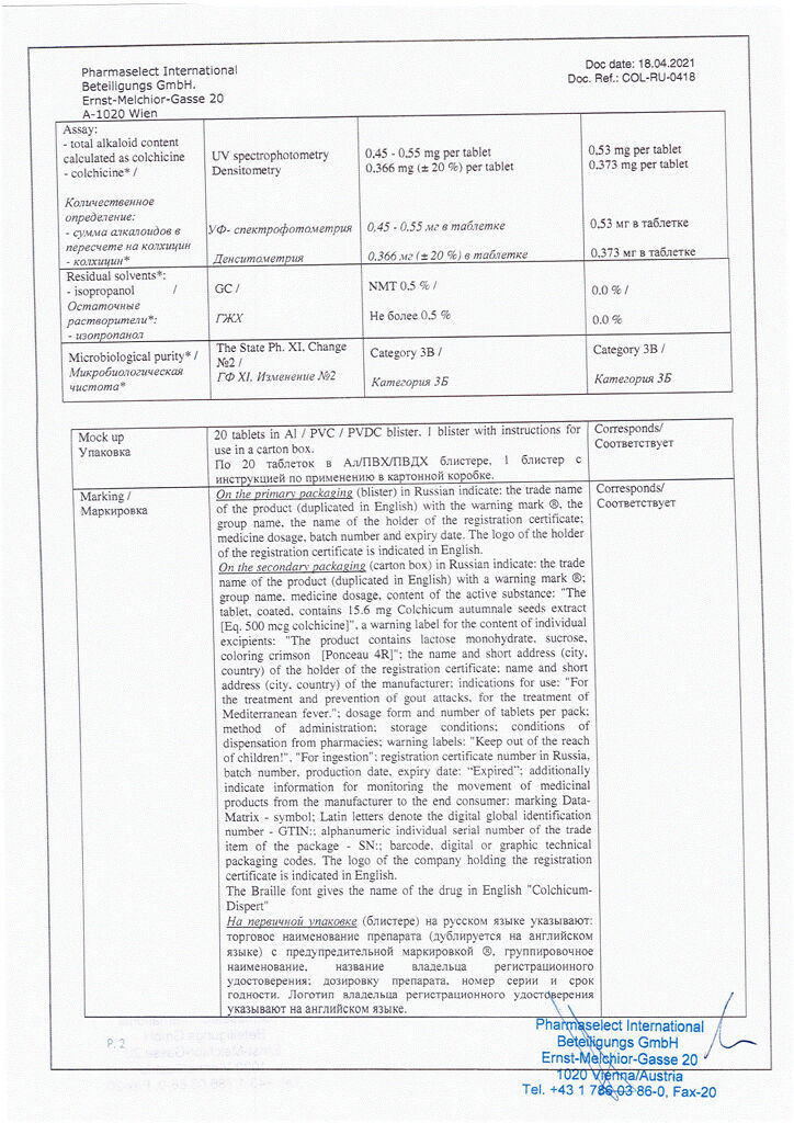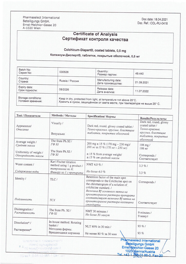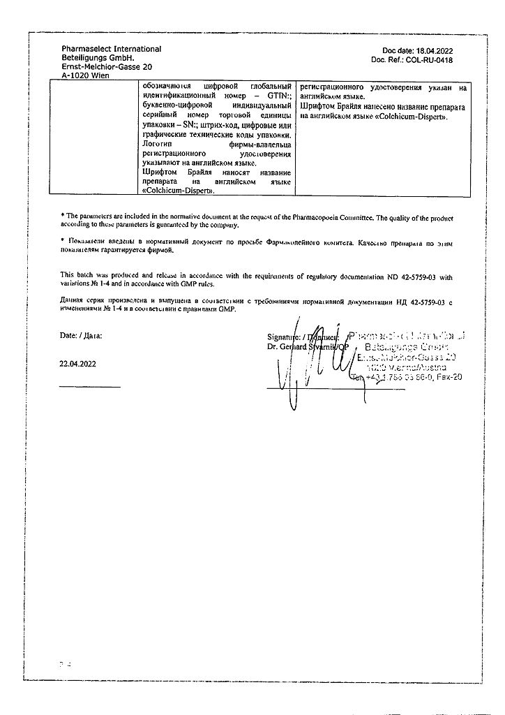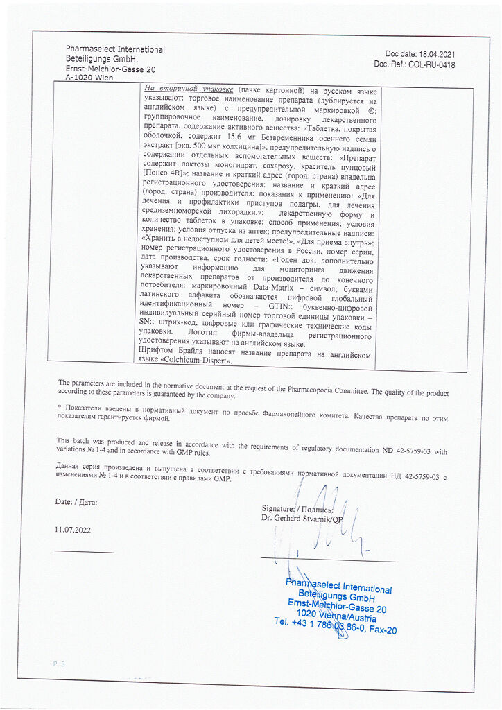 Активное вещество: Безвременника осеннего семян экстракт [экв. 500 мкг колхицина] [ в составе экстракта 57-64 % лактозы, 28-32 % целлюлозы микрокристаллической] 15,6 мг;