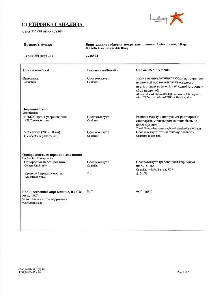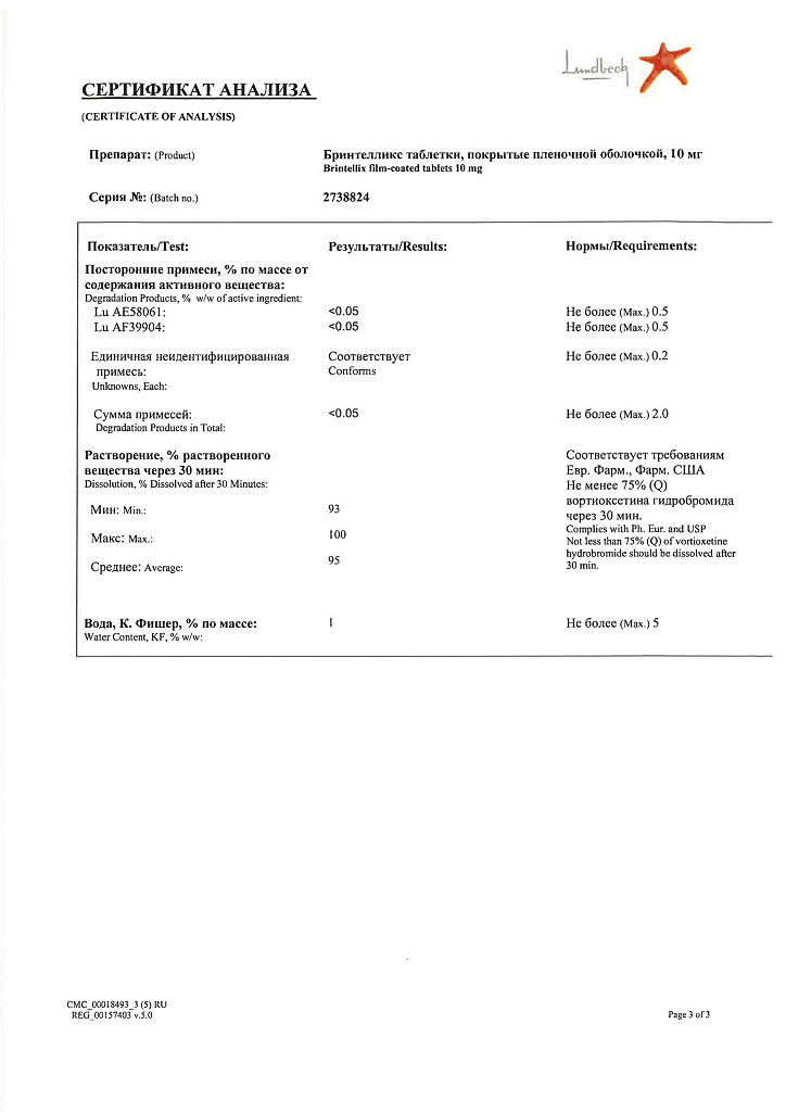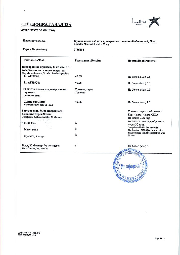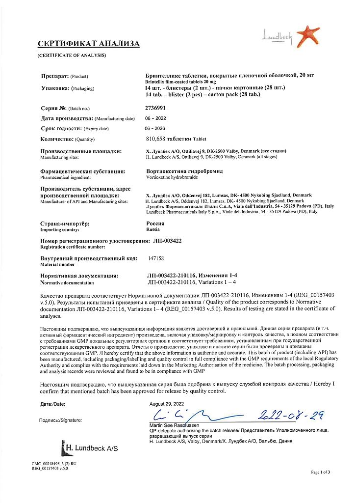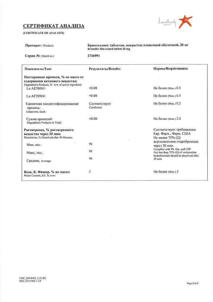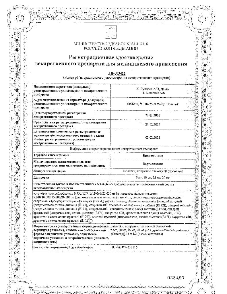 Начальная и рекомендуемая доза Бринтелликса у взрослых пациентов младше 65 лет составляет 10 мг однократно в сутки. В зависимости от индивидуальной реакции пациента суточная доза может быть увеличена до максимальной дозы 20 мг вортиоксетина один раз в сутки или снижена до минимальной дозы 5 мг вортиоксетина один раз в сутки.