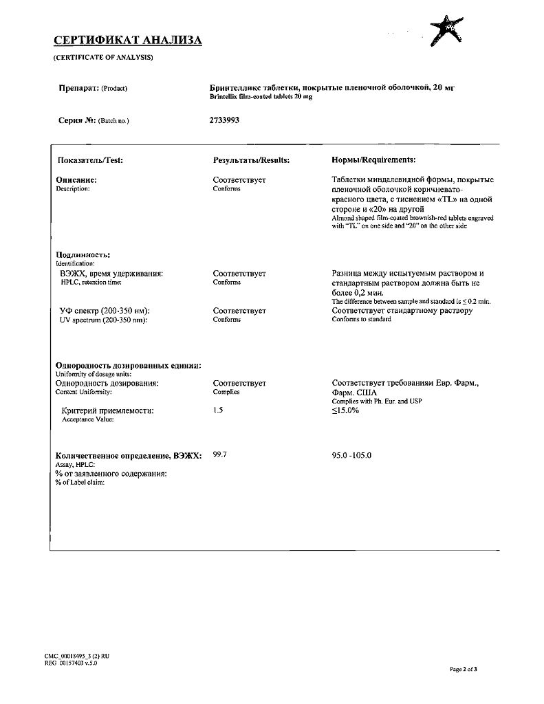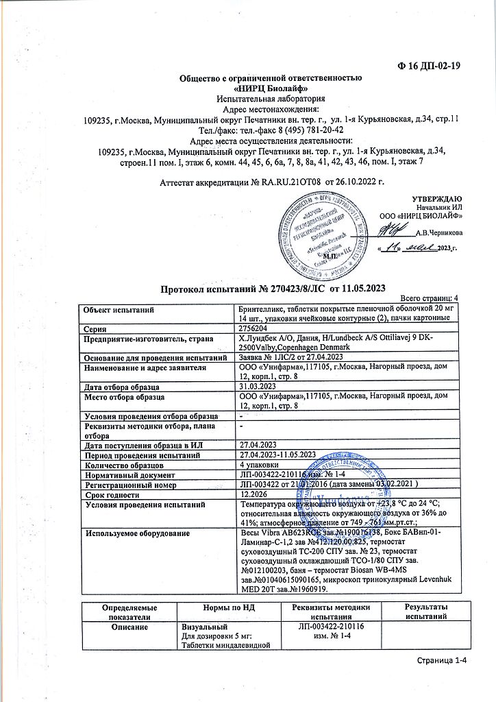Серотониновый синдром (СС) или злокачественный нейролептический синдром (ЗНС) являются потенциально опасными для жизни состояниями и могут возникнуть на фоне применения препарата Бринтелликс.