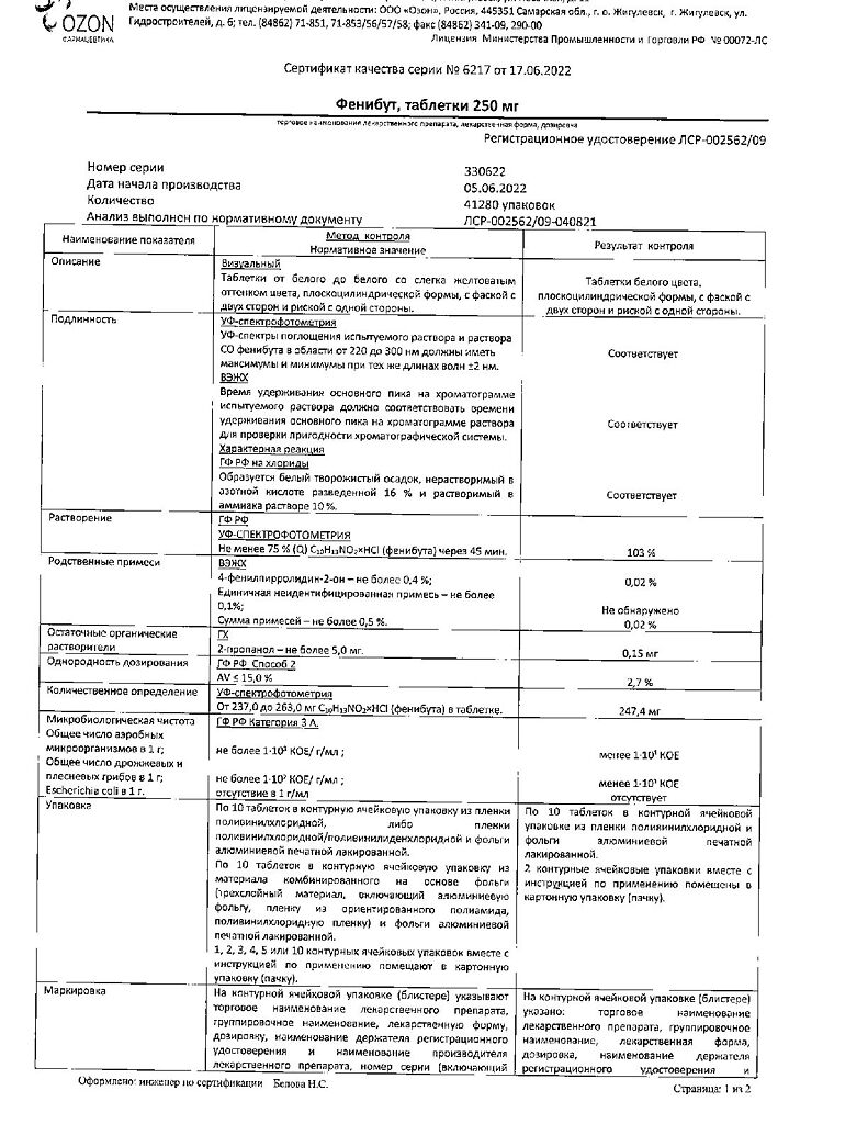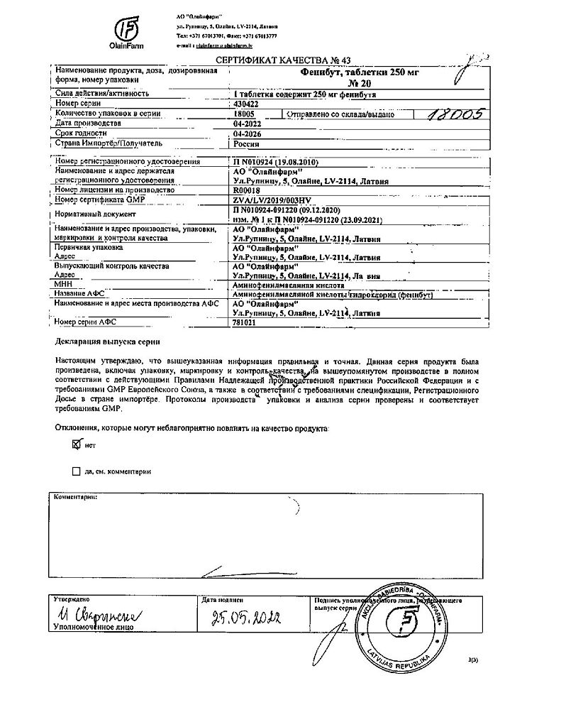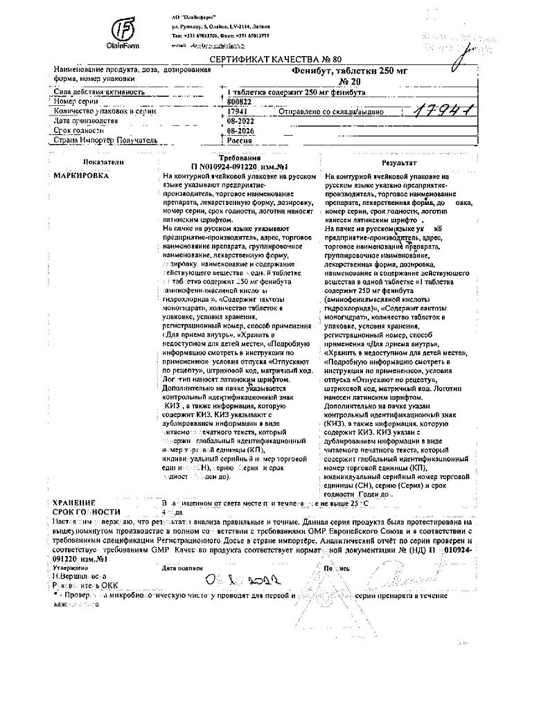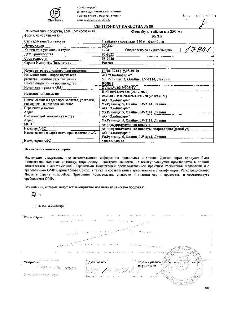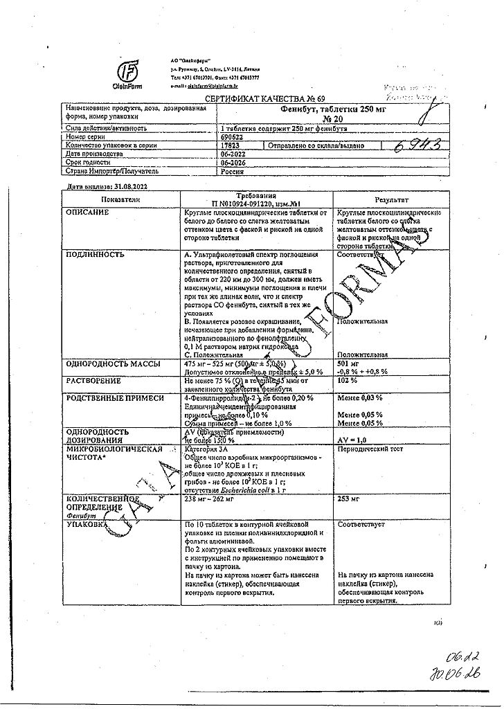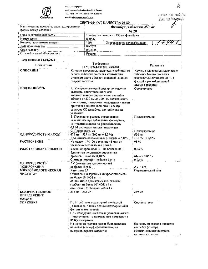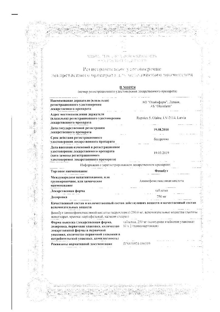 действующее вещество: γ-амино-β-фенилбутировой кислоты гидрохлорид 250 мг;