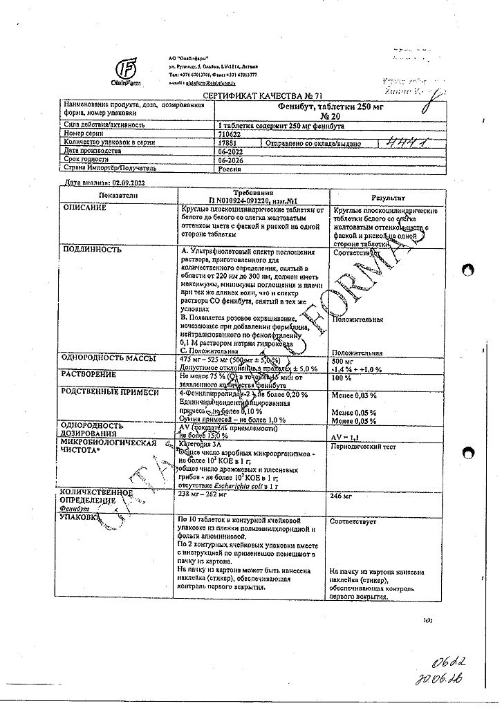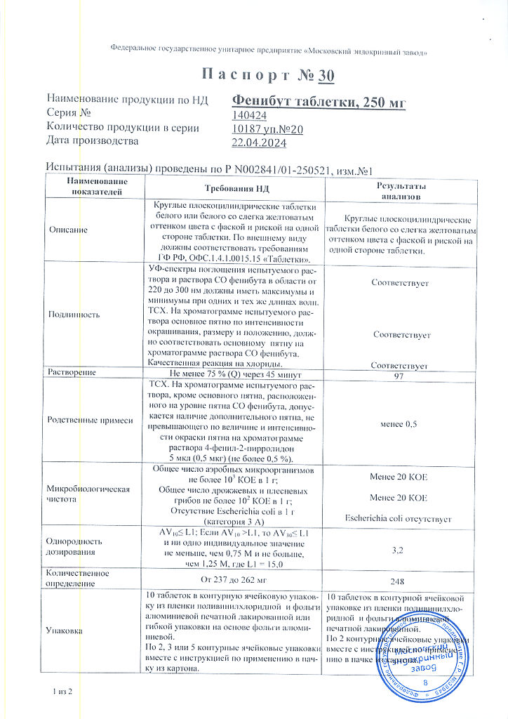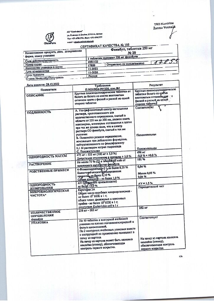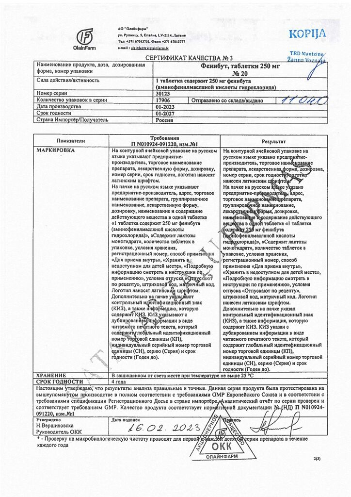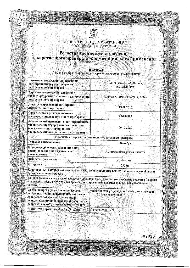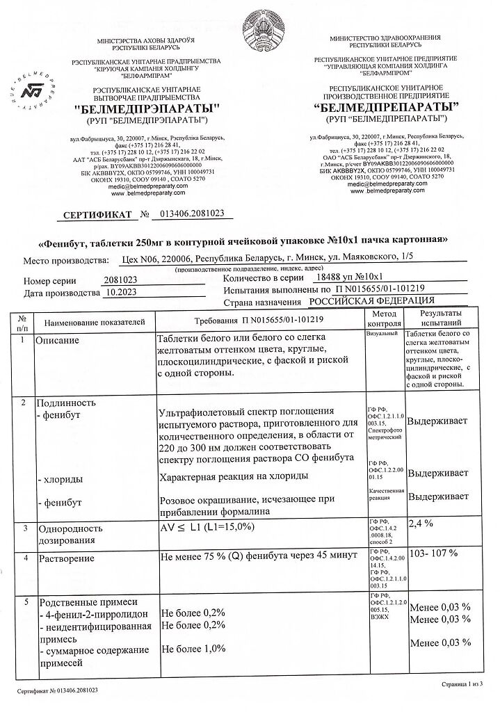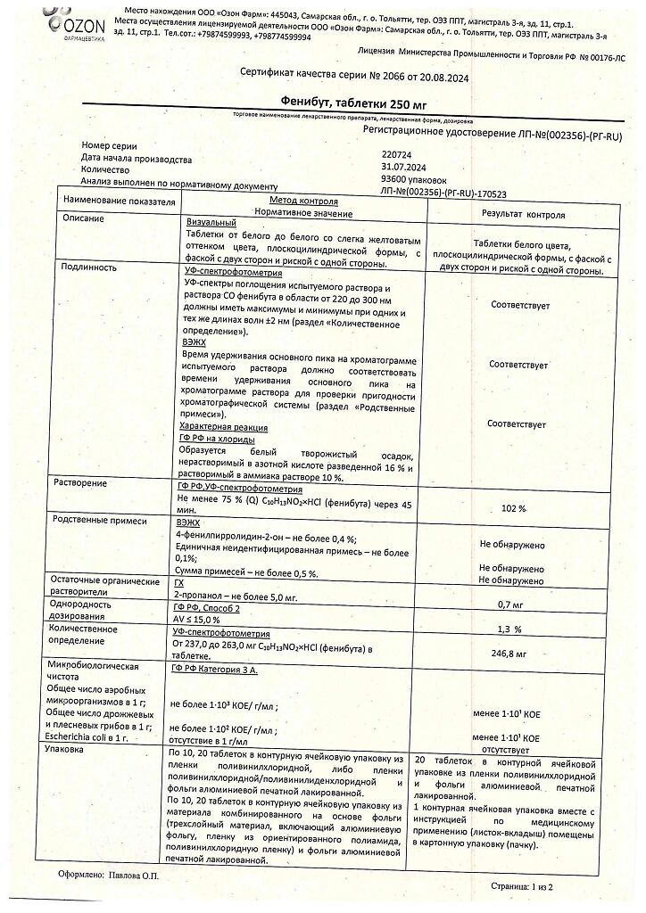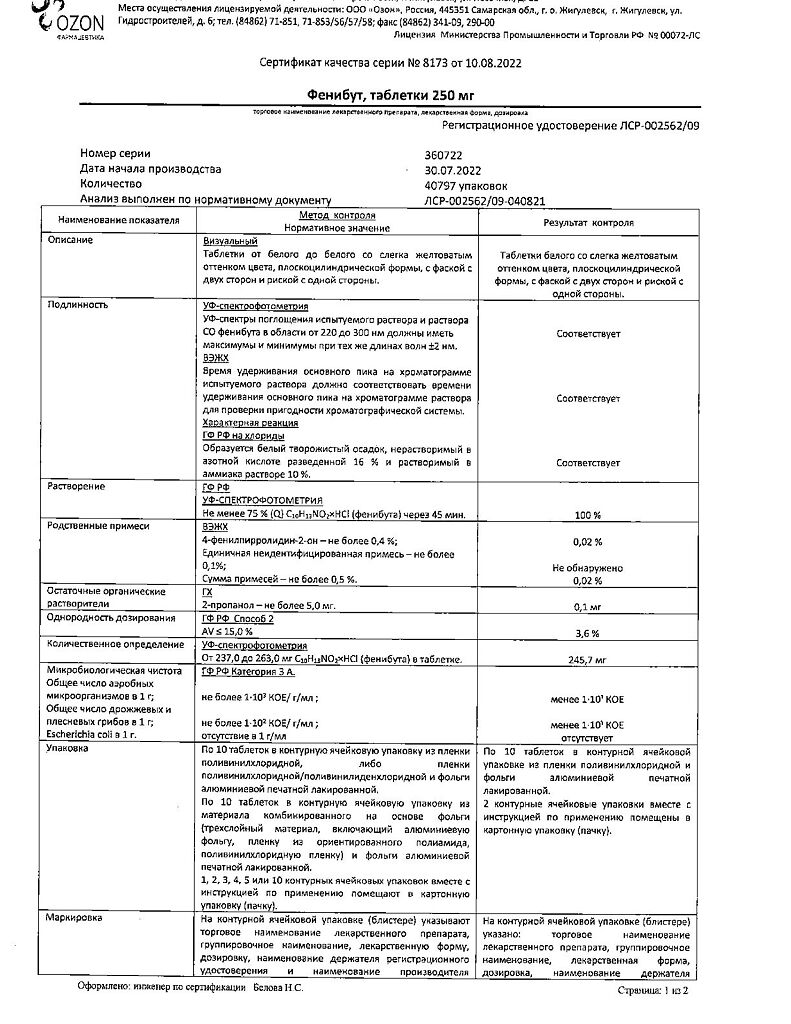 действующее вещество: γ-амино-β-фенилбутировой кислоты гидрохлорид 250 мг;