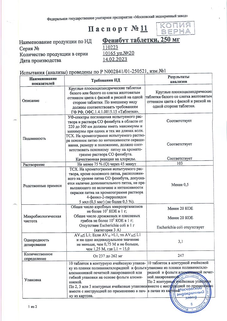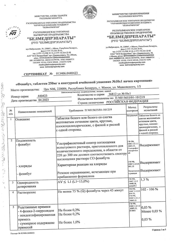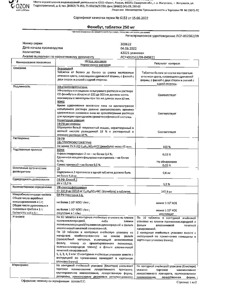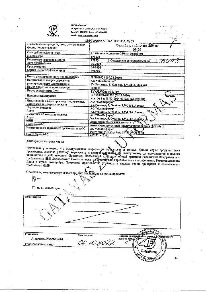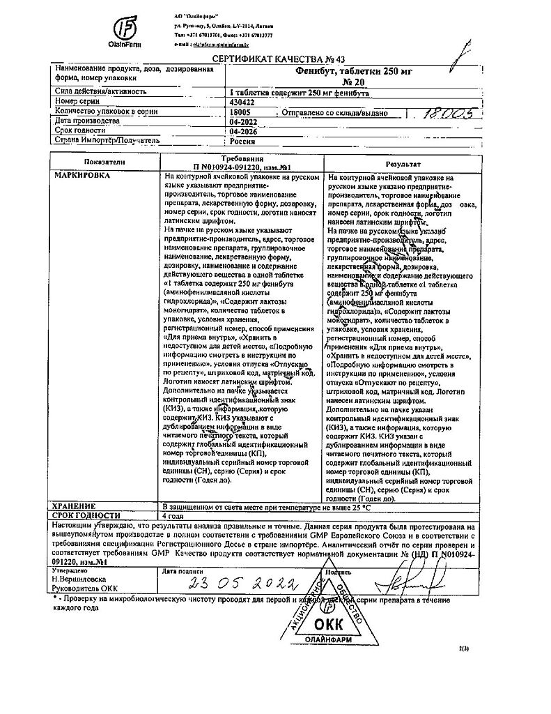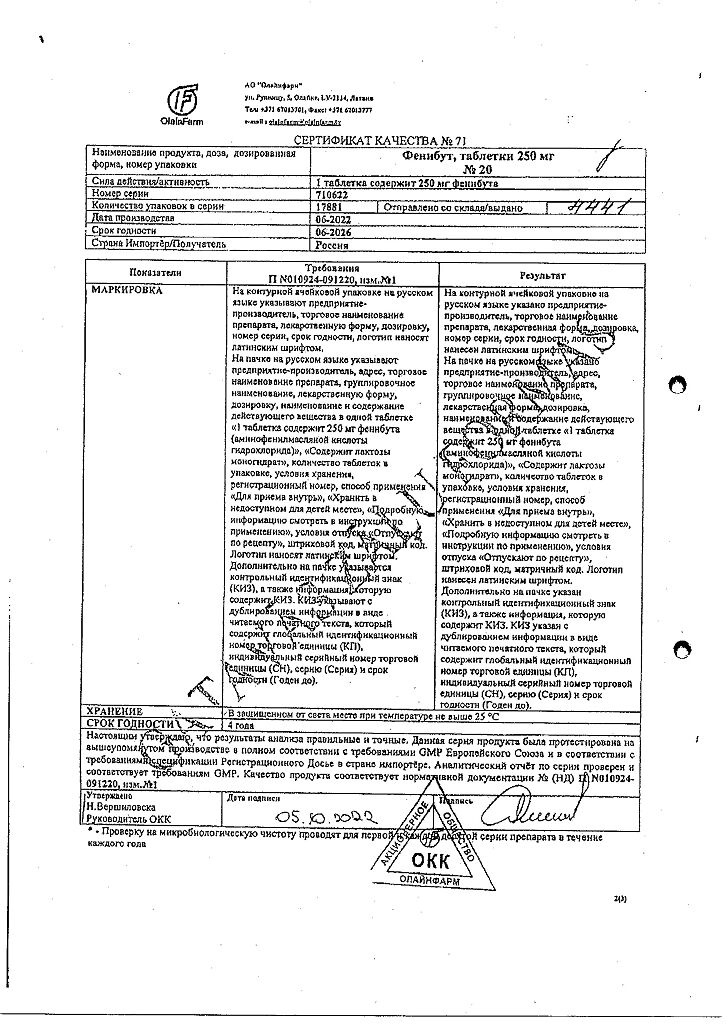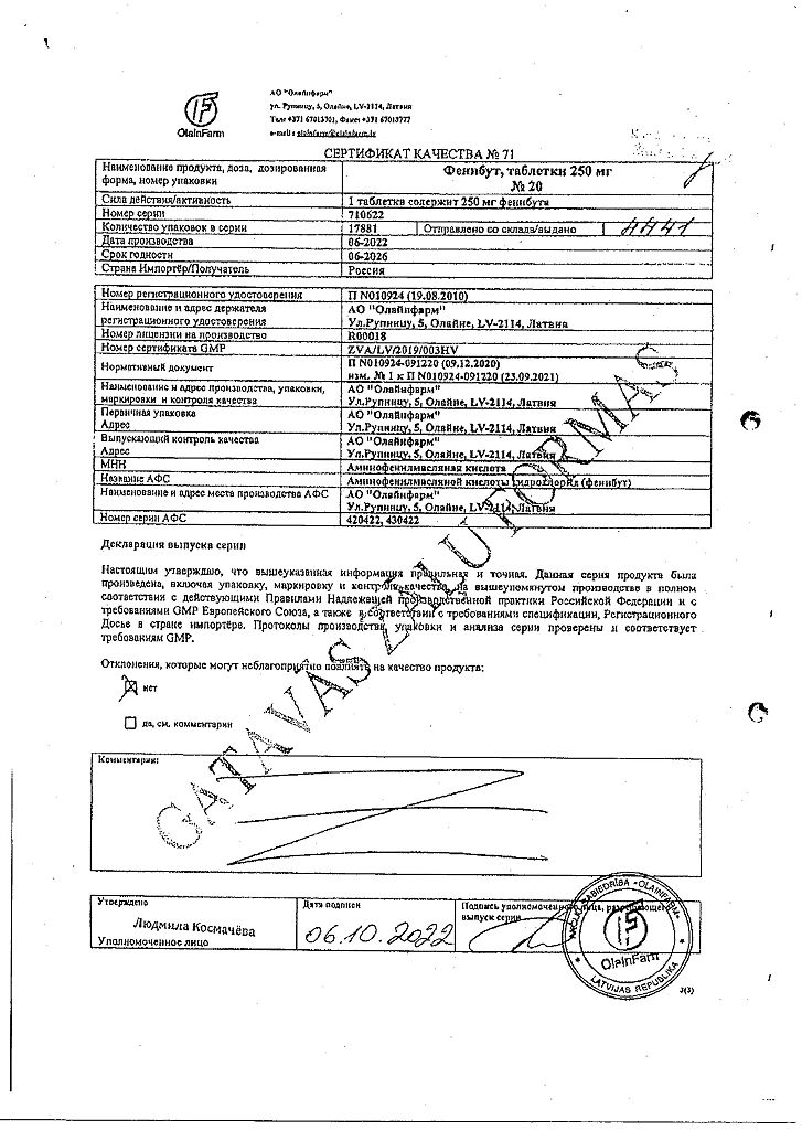 действующее вещество: γ-амино-β-фенилбутировой кислоты гидрохлорид 250 мг;