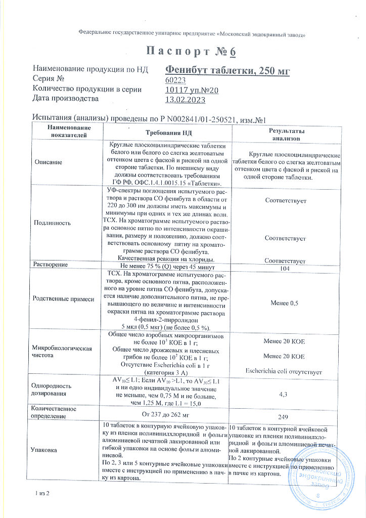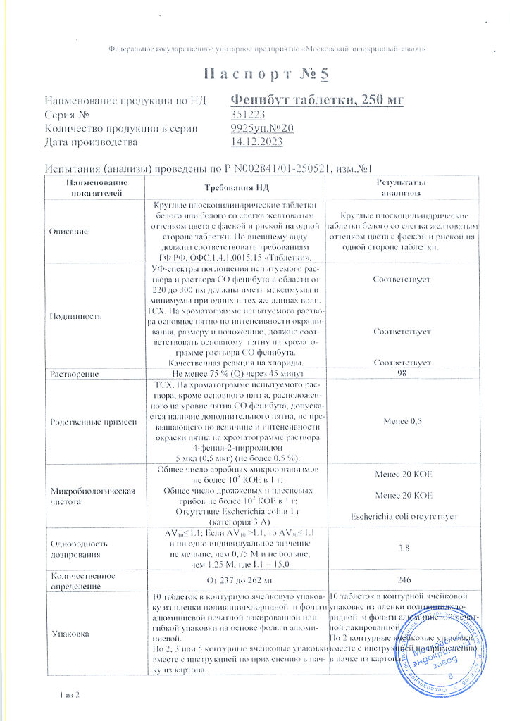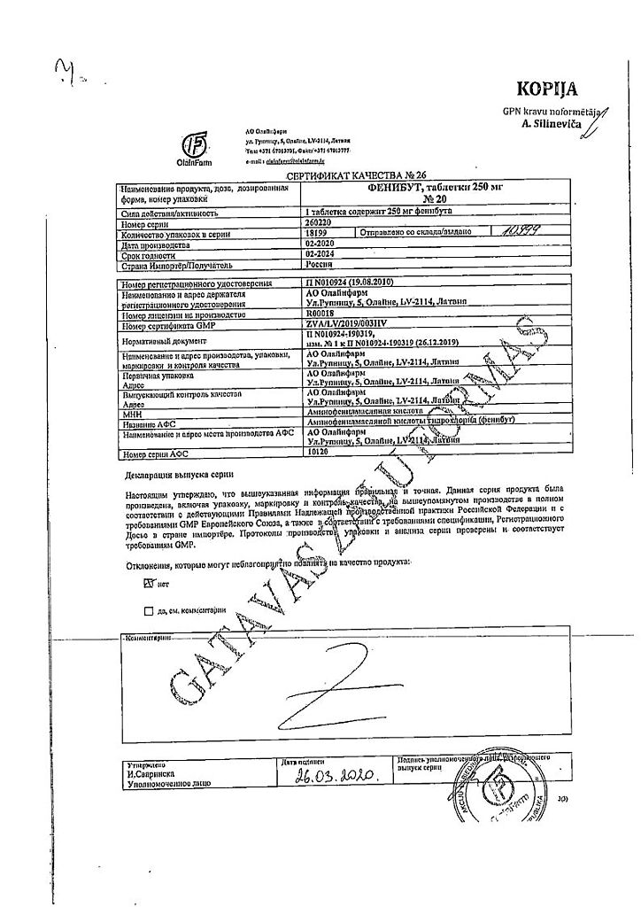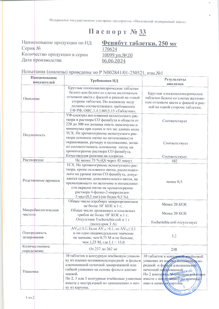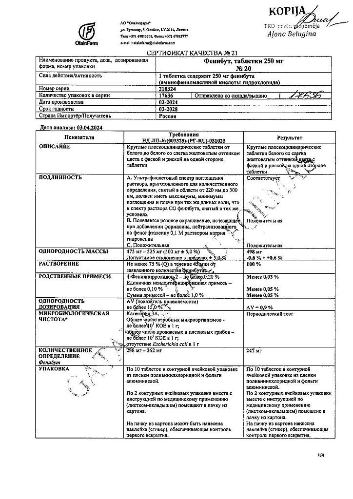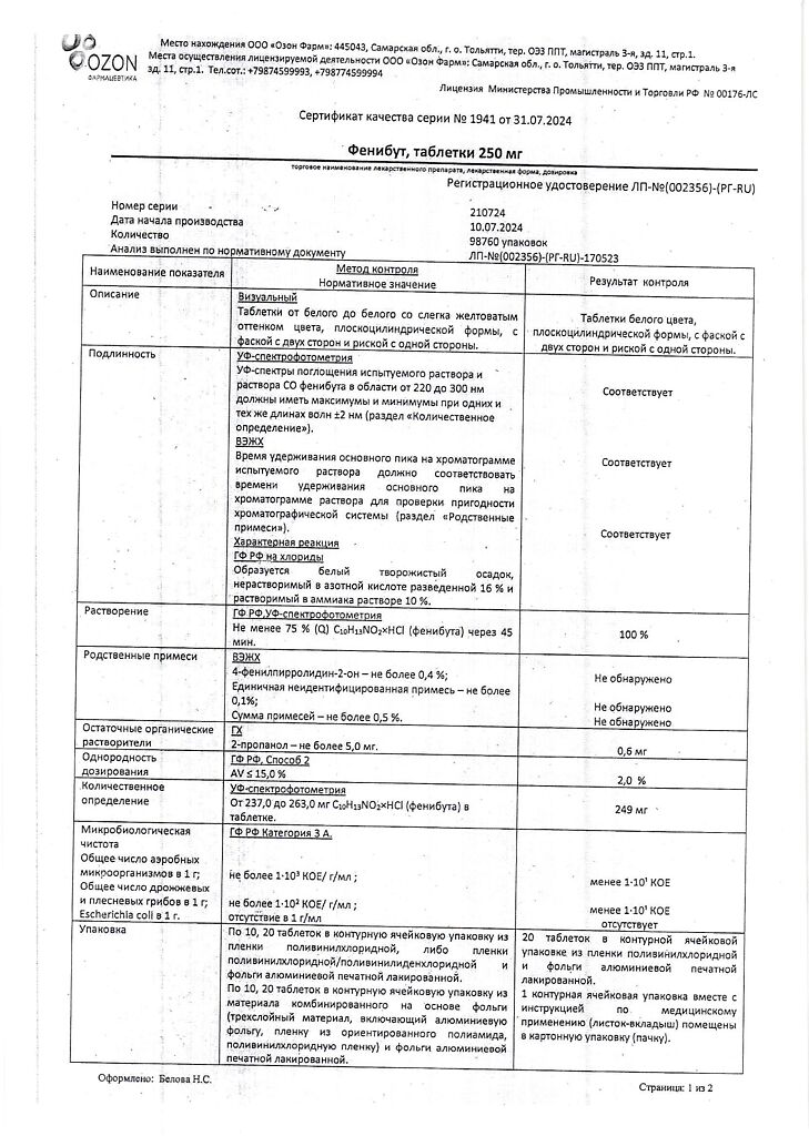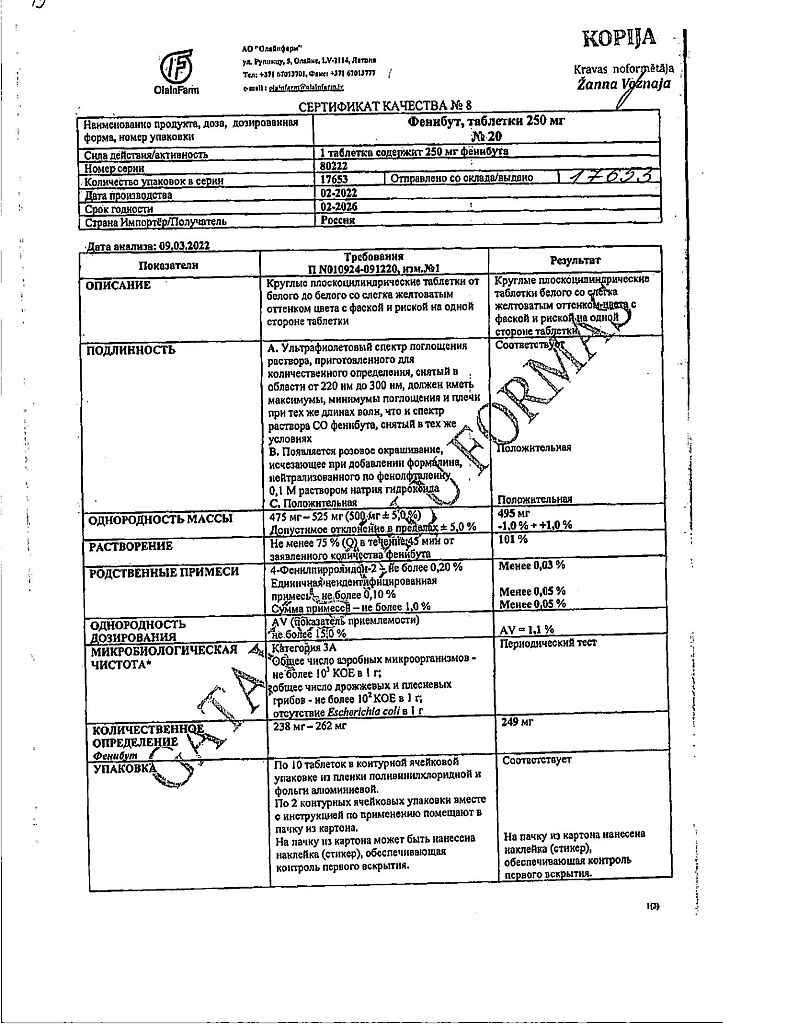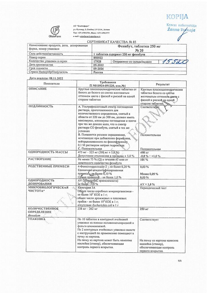 действующее вещество: γ-амино-β-фенилбутировой кислоты гидрохлорид 250 мг;