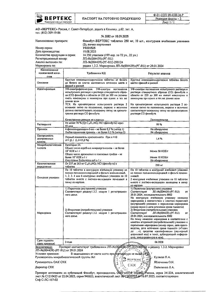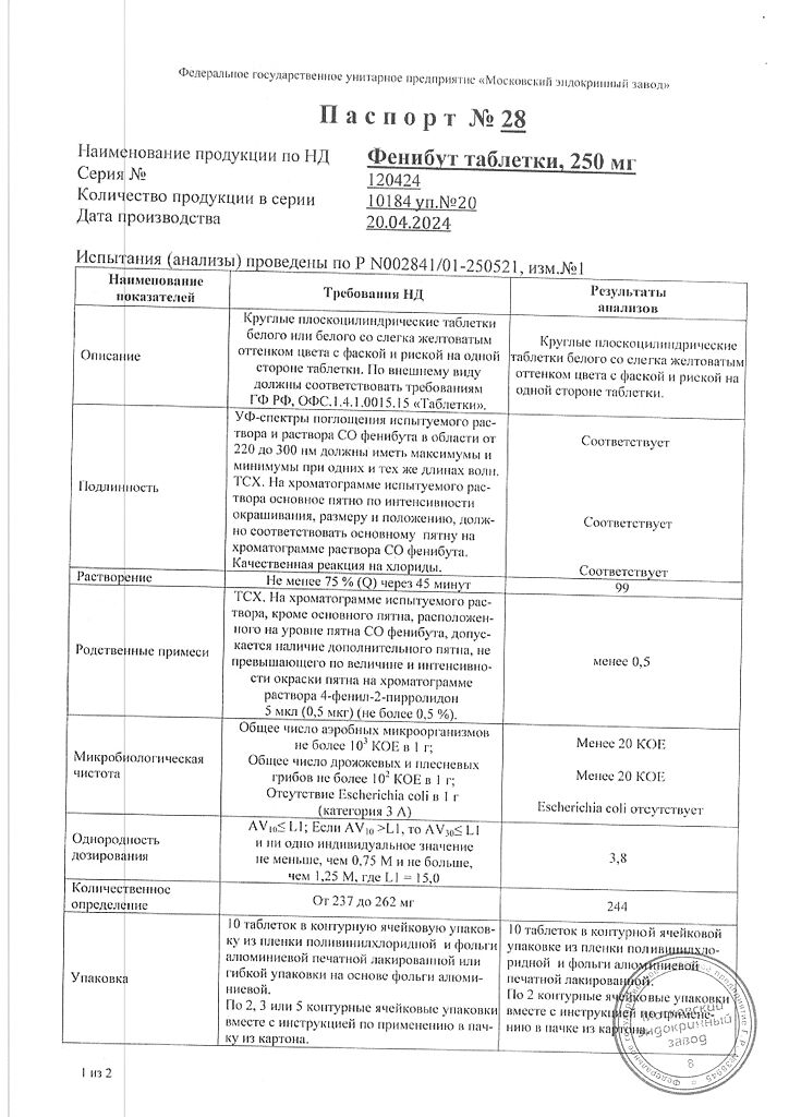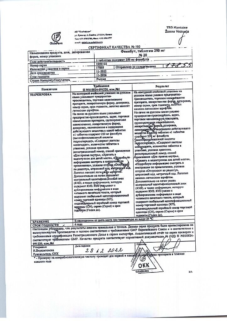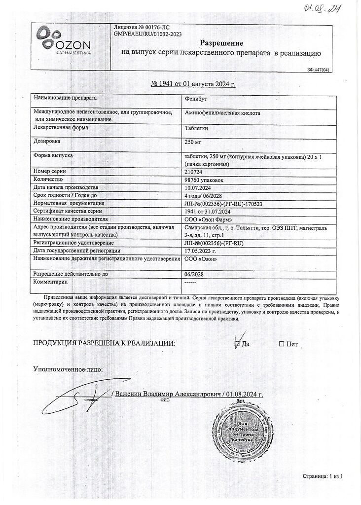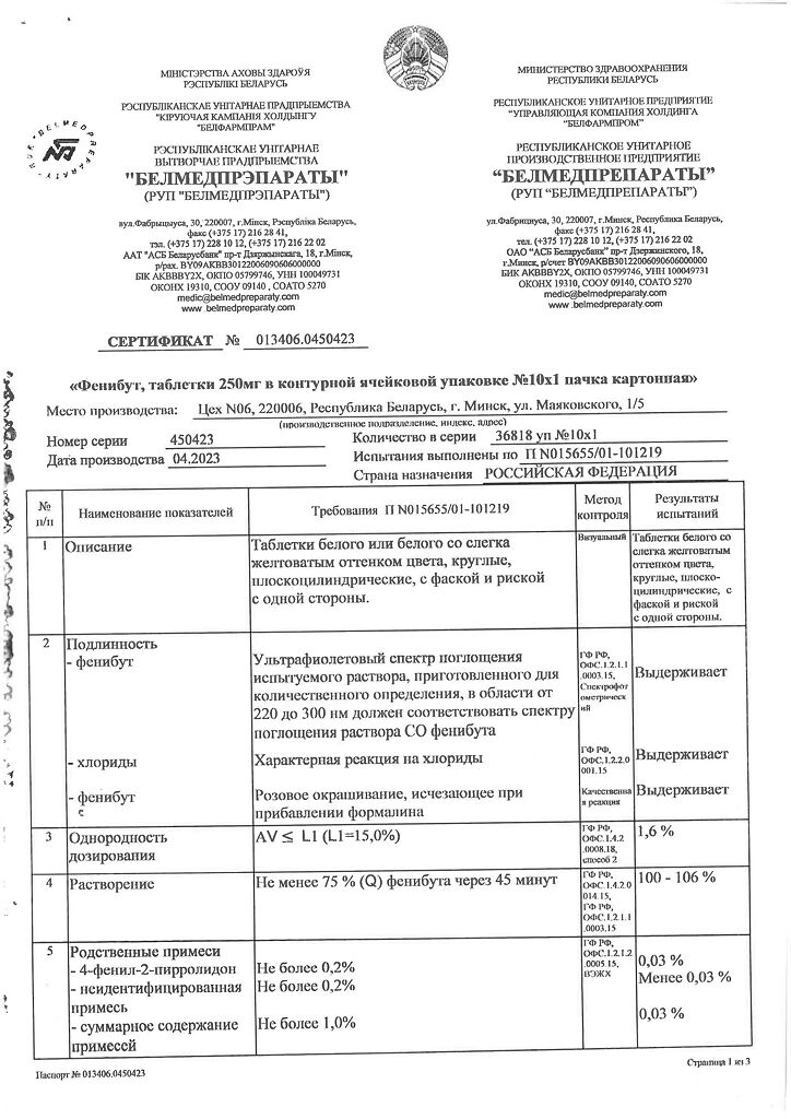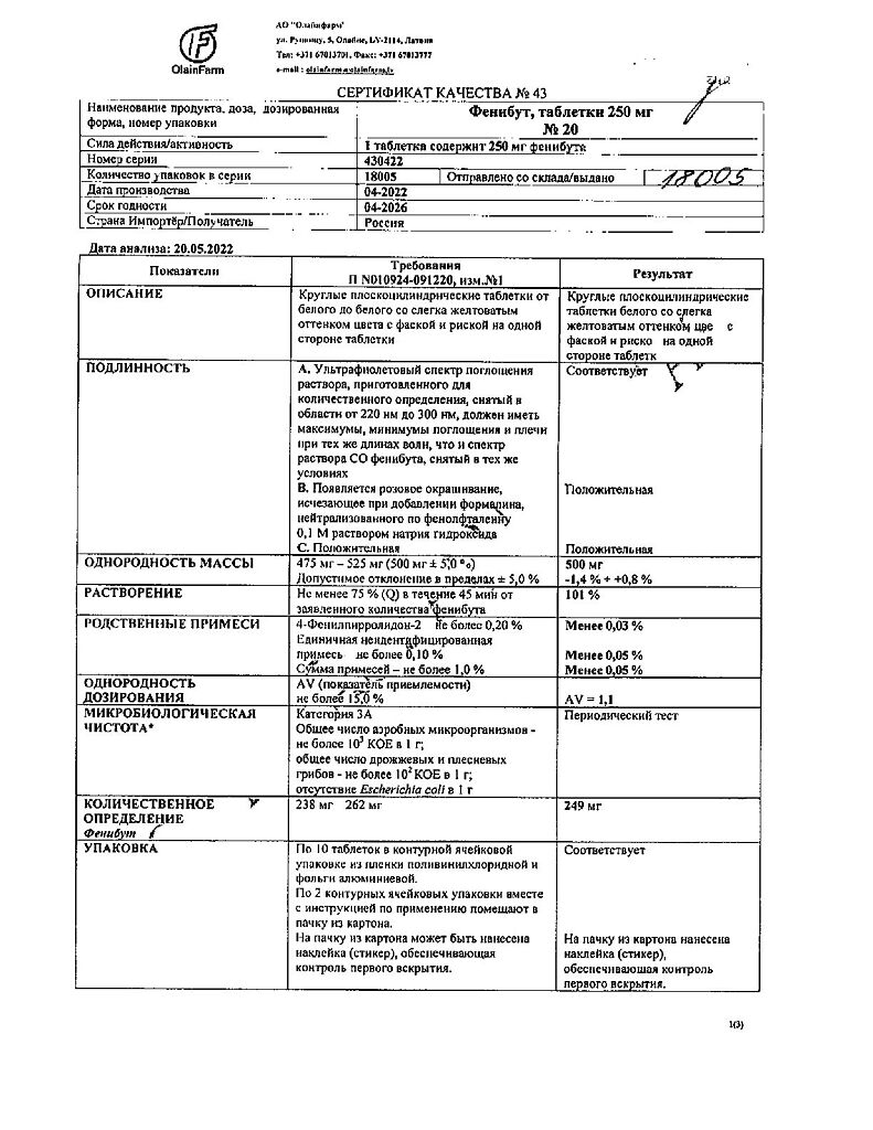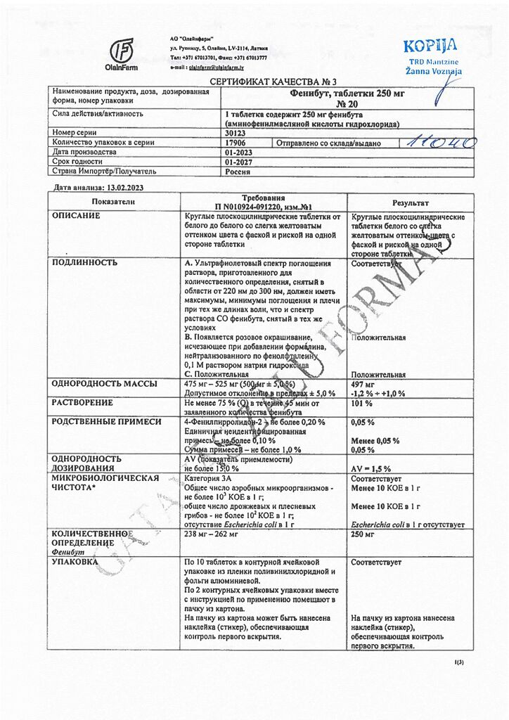 действующее вещество: γ-амино-β-фенилбутировой кислоты гидрохлорид 250 мг;