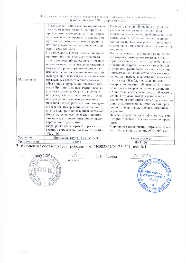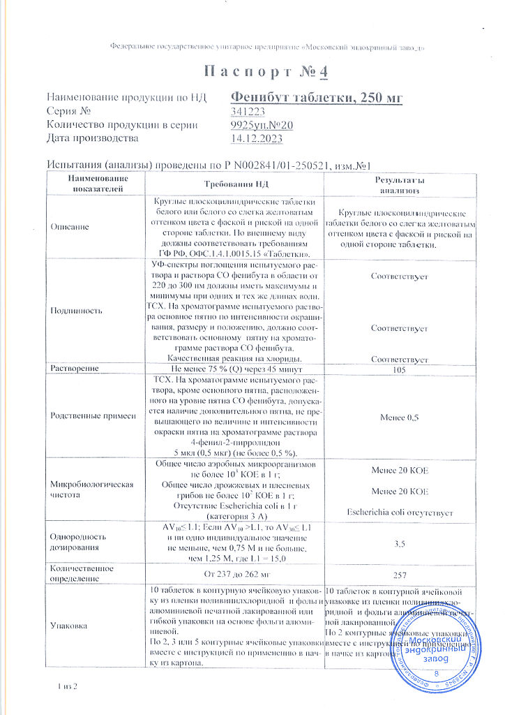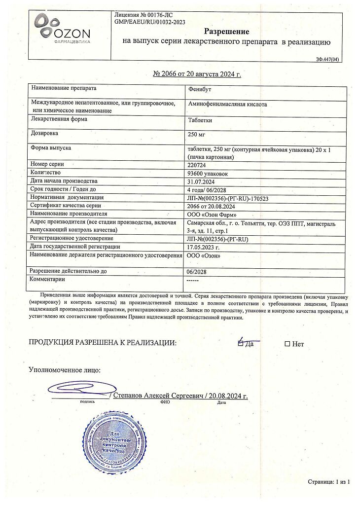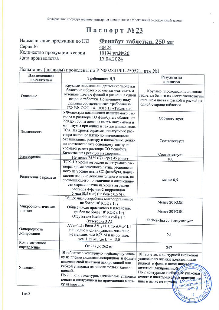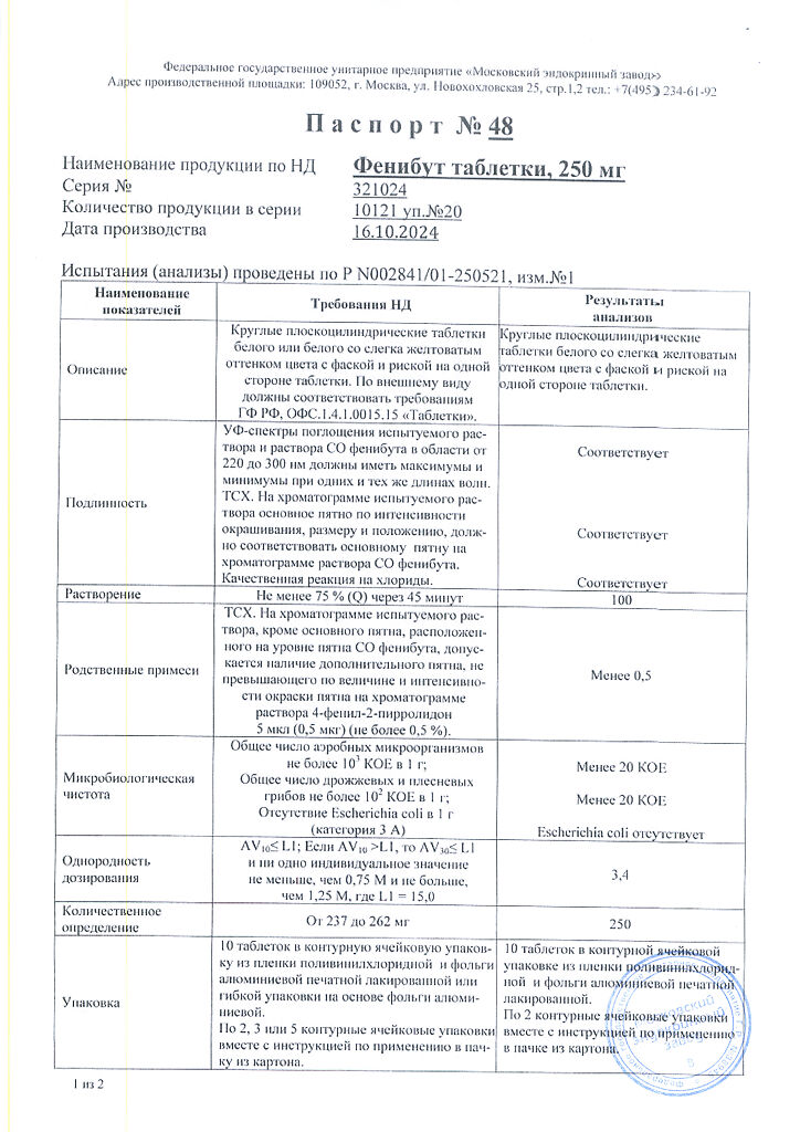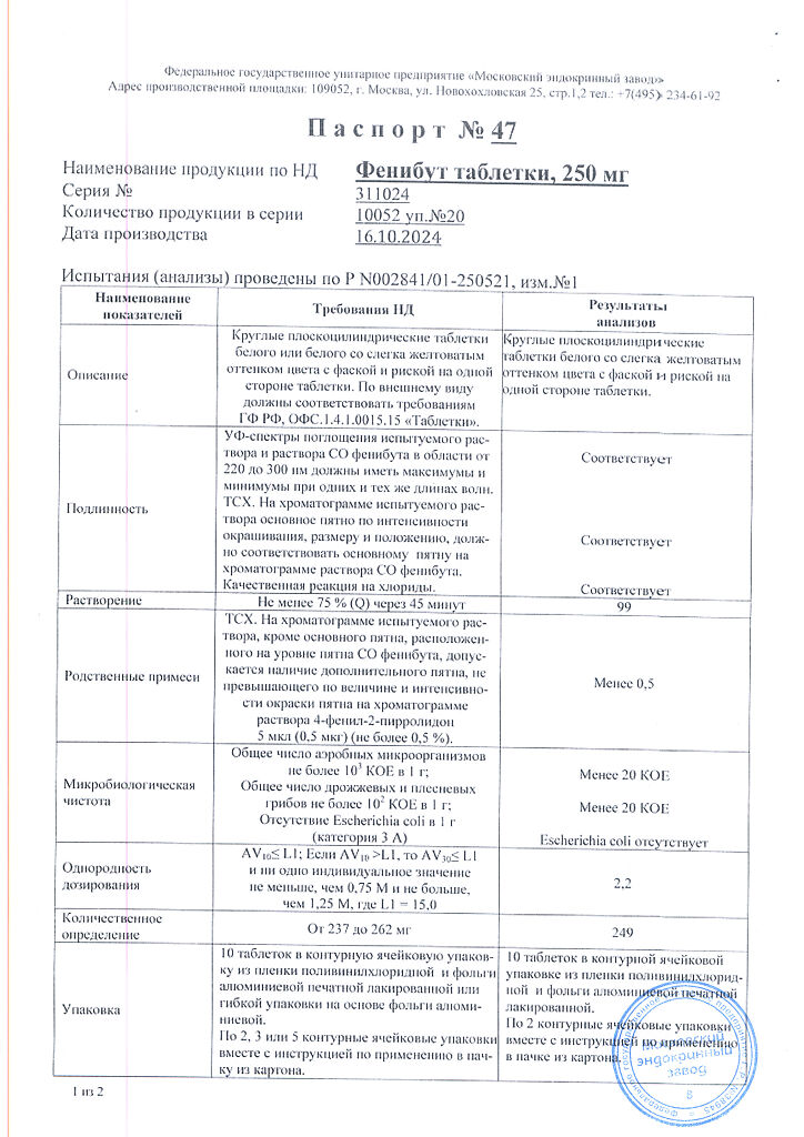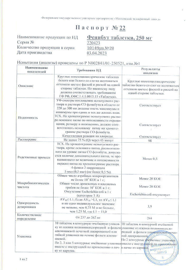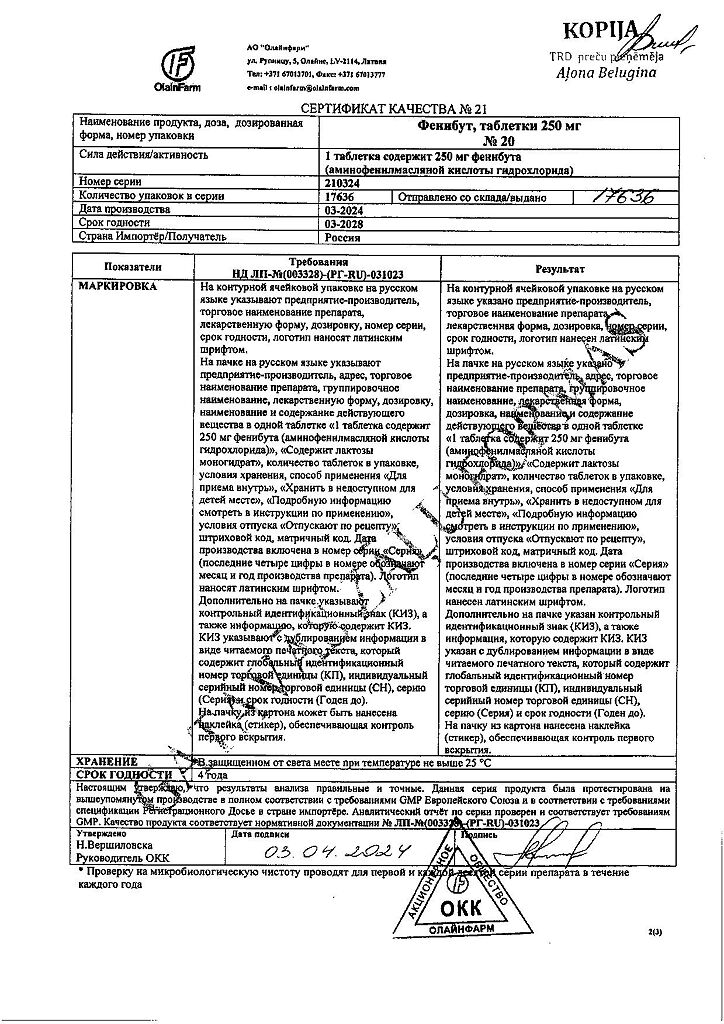 действующее вещество: γ-амино-β-фенилбутировой кислоты гидрохлорид 250 мг;