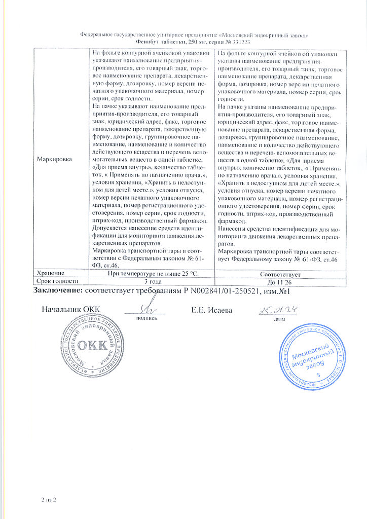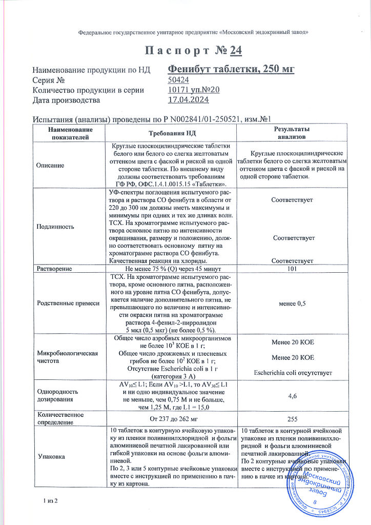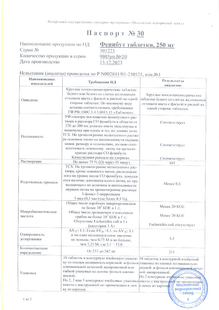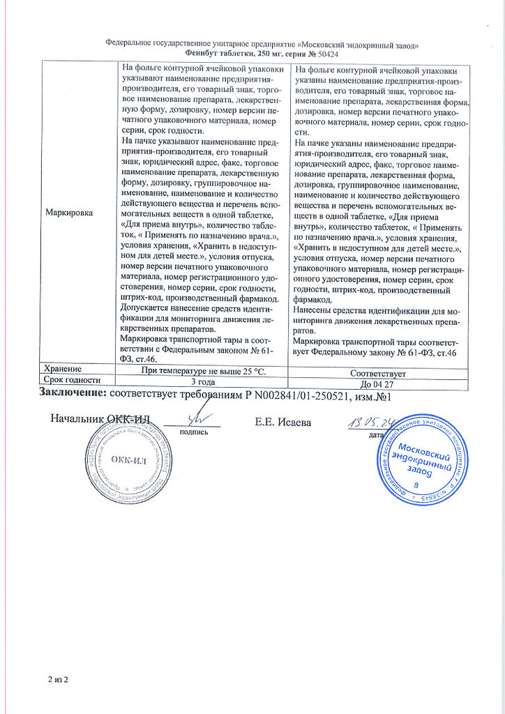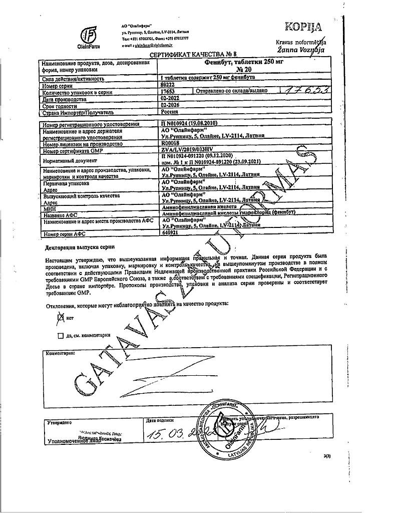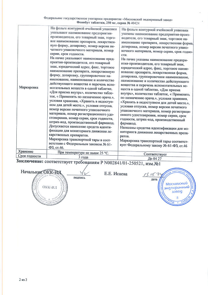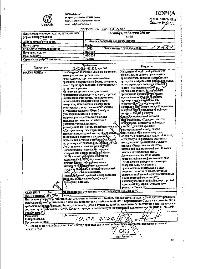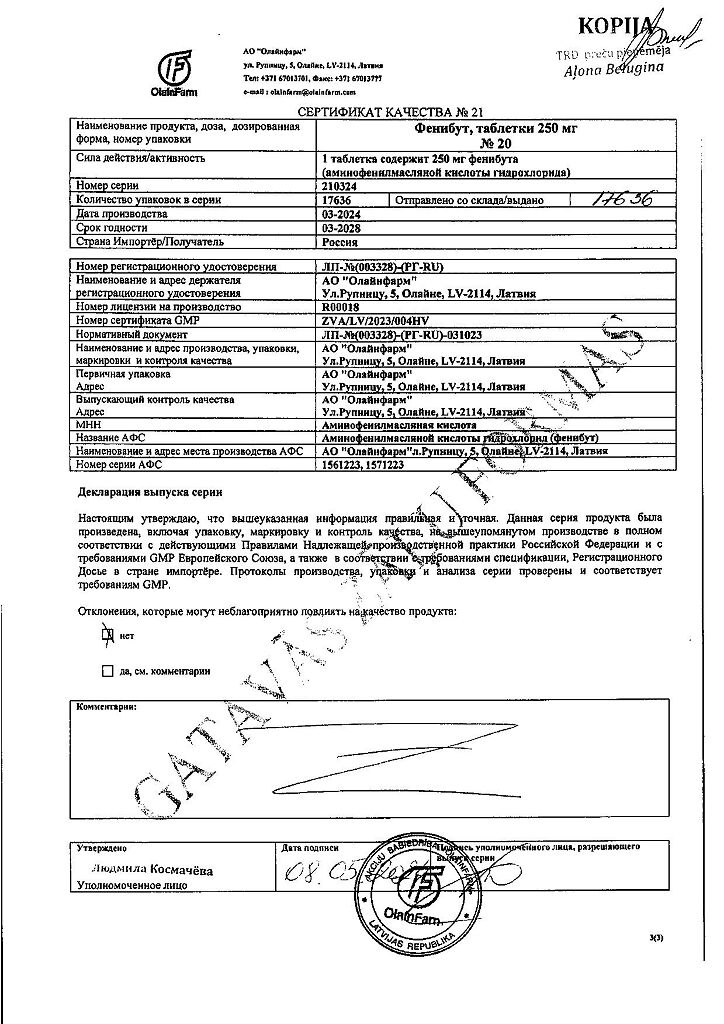 действующее вещество: γ-амино-β-фенилбутировой кислоты гидрохлорид 250 мг;