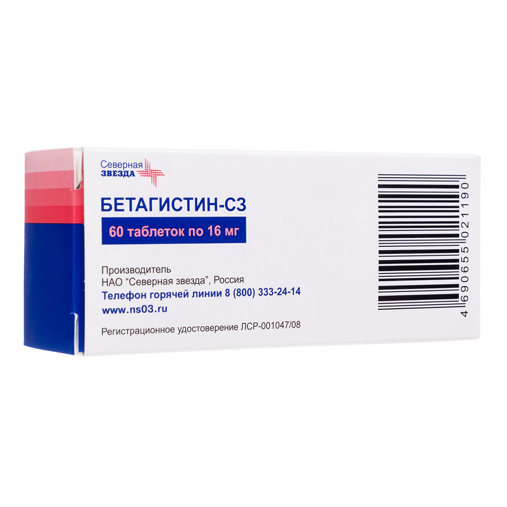 Действующее вещество: бетагистина дигидрохлорид 8, 16 и 24мг;