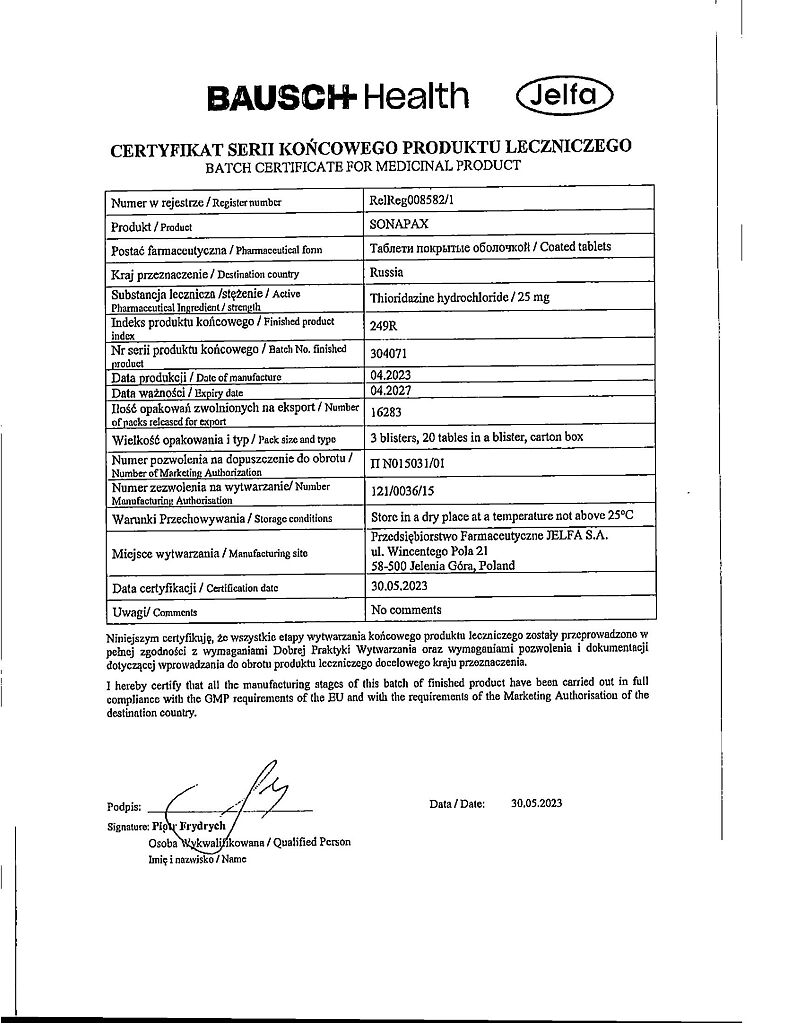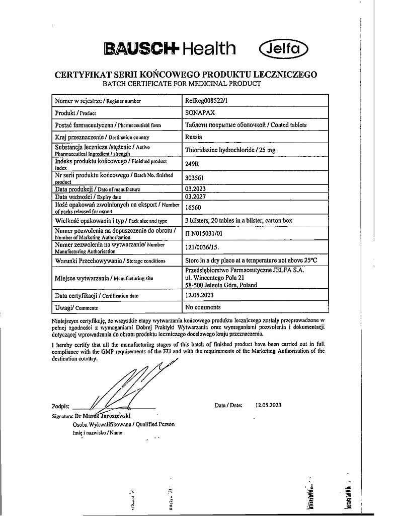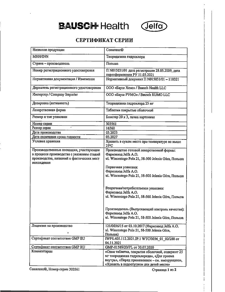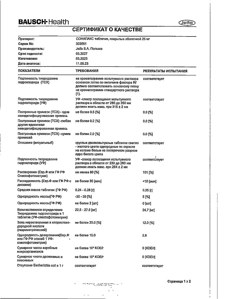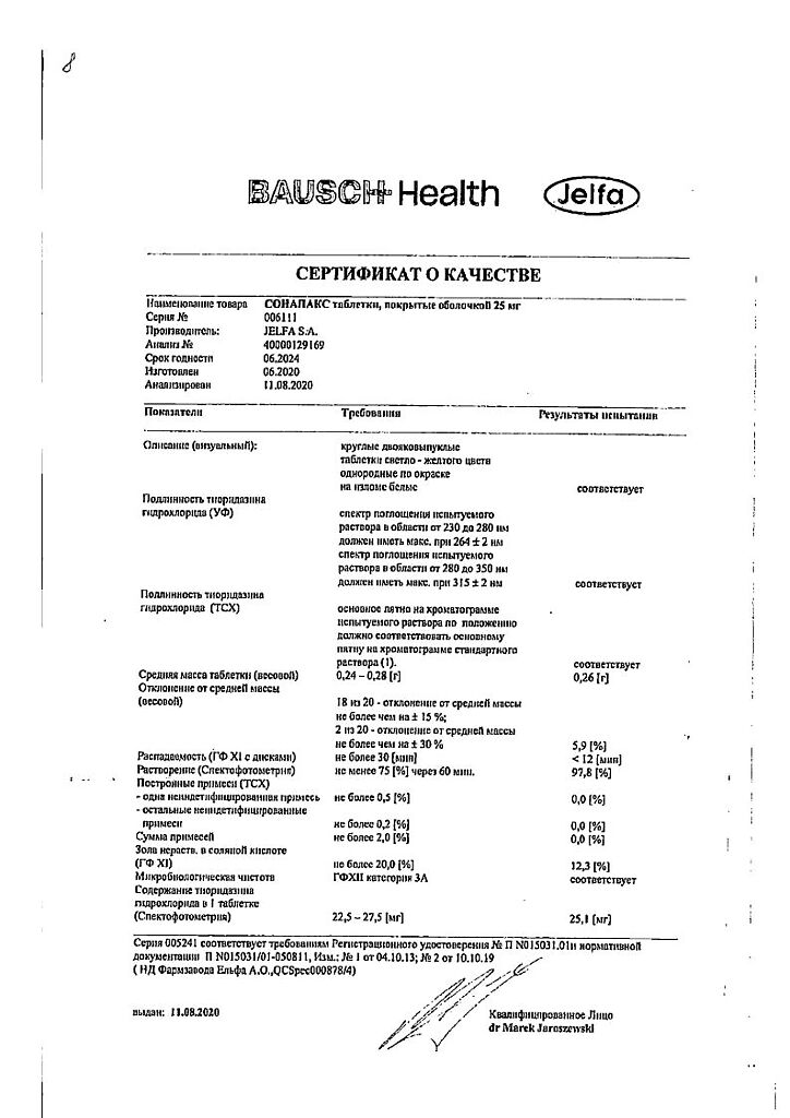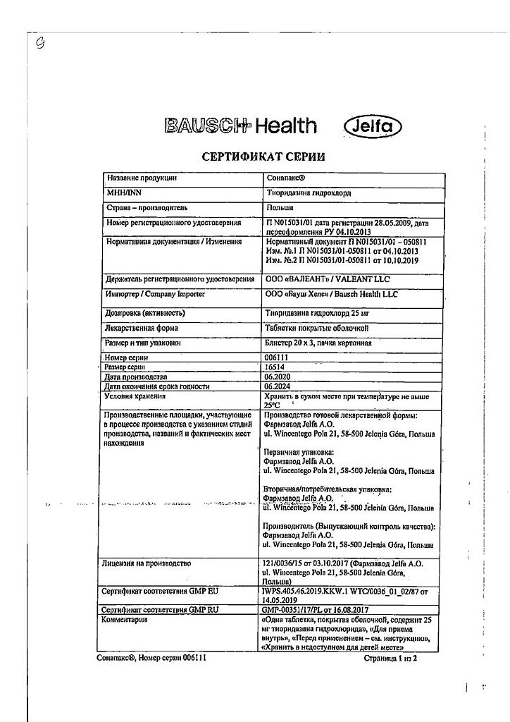 Влияние на способность управления автотранспортом и обслуживания машинного оборудования в движении: Сонапакс ослабляет двигательную координацию и снижает реакцию, особенно в начале лечения, поэтому в период лечения препаратом следует воздержаться от вождения транспортных средств и обслуживания движущихся механизмов.