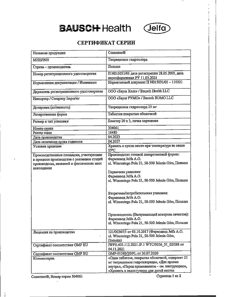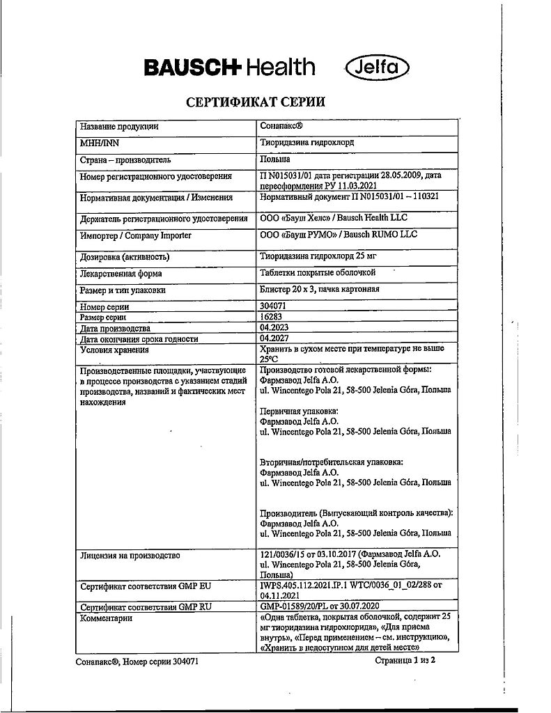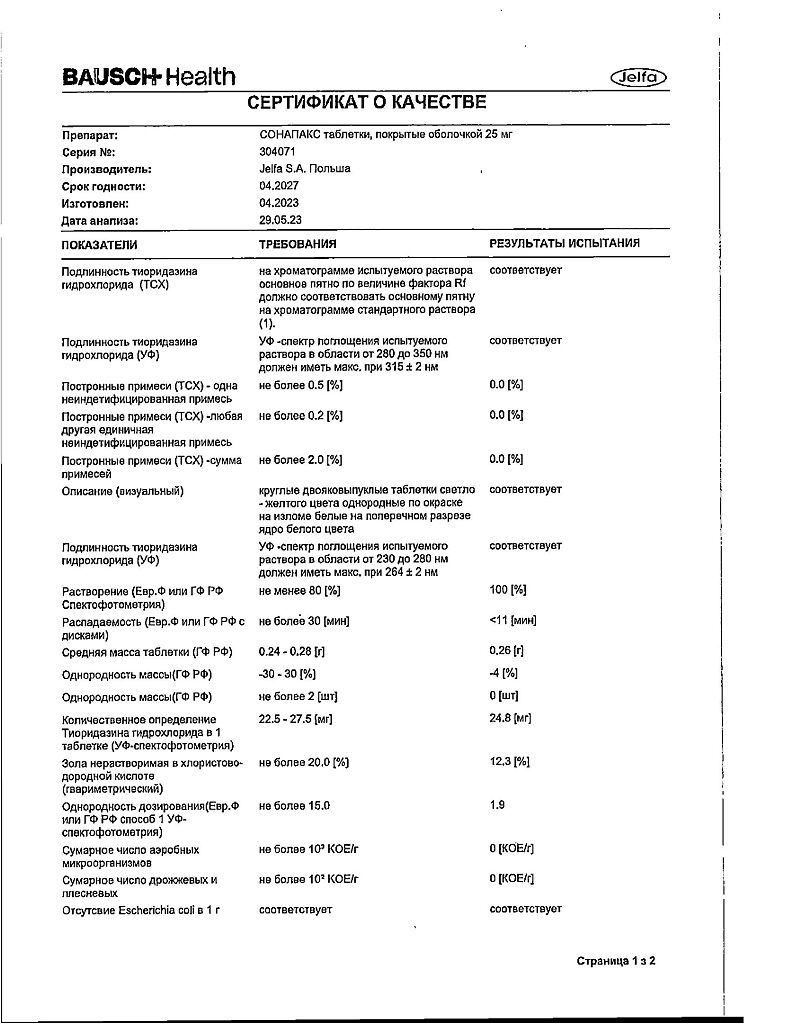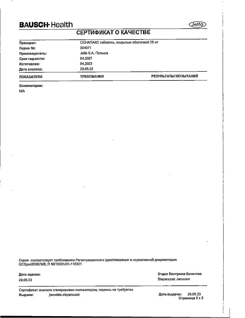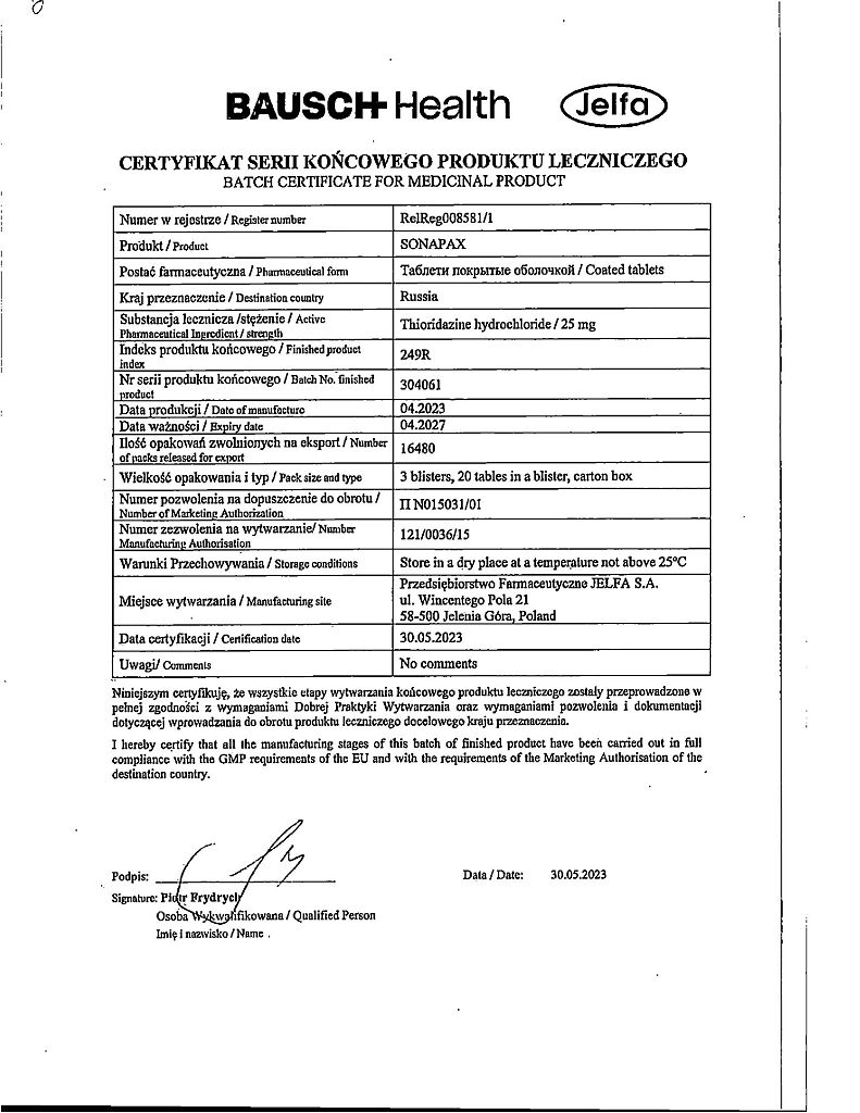 Влияние на способность управления автотранспортом и обслуживания машинного оборудования в движении: Сонапакс ослабляет двигательную координацию и снижает реакцию, особенно в начале лечения, поэтому в период лечения препаратом следует воздержаться от вождения транспортных средств и обслуживания движущихся механизмов.