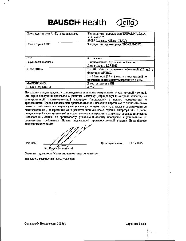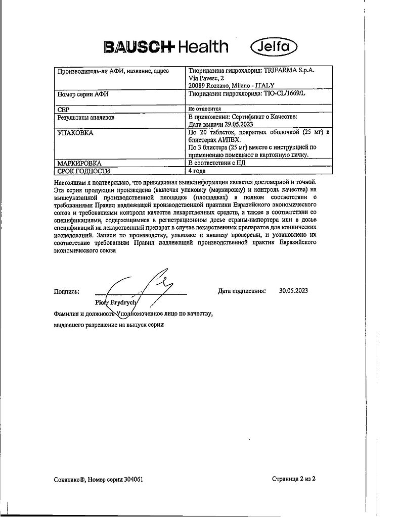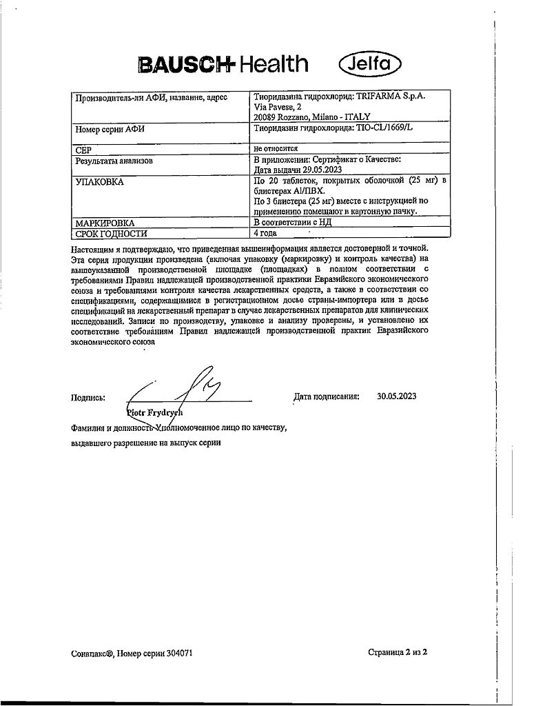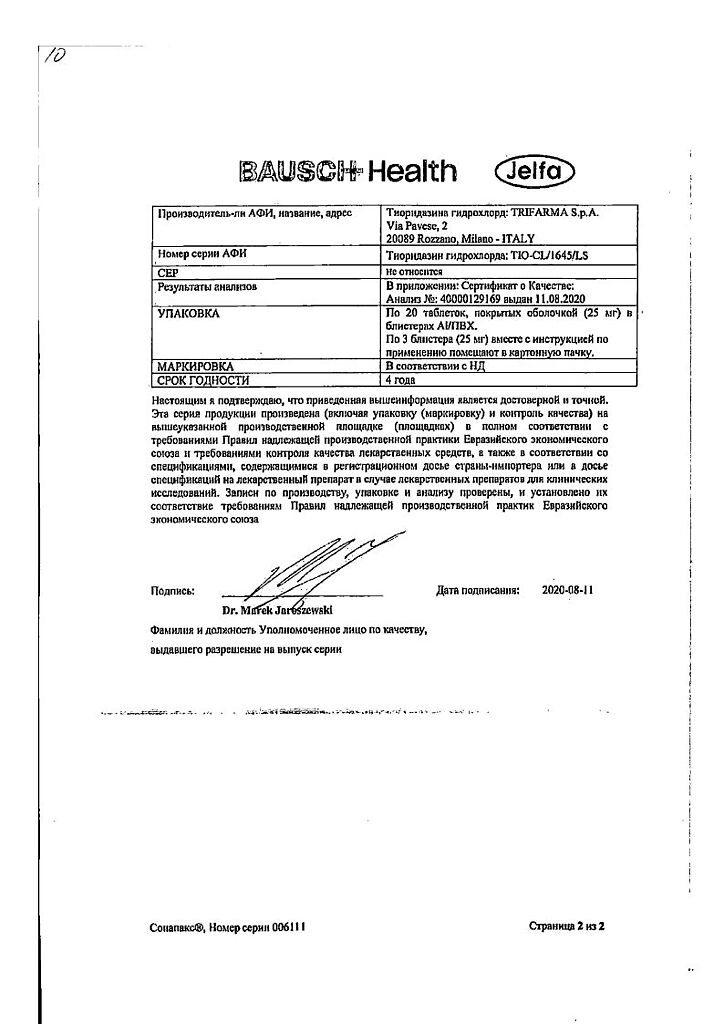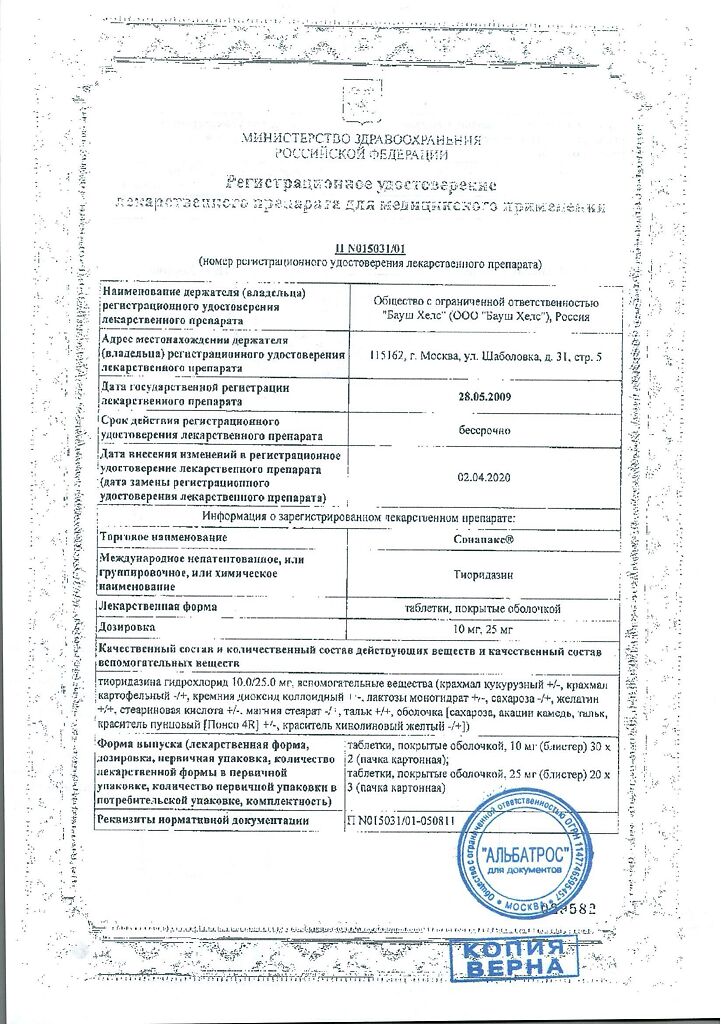 Действующее вещество : тиоридазина гидрохлорид - 10 и 25 мг