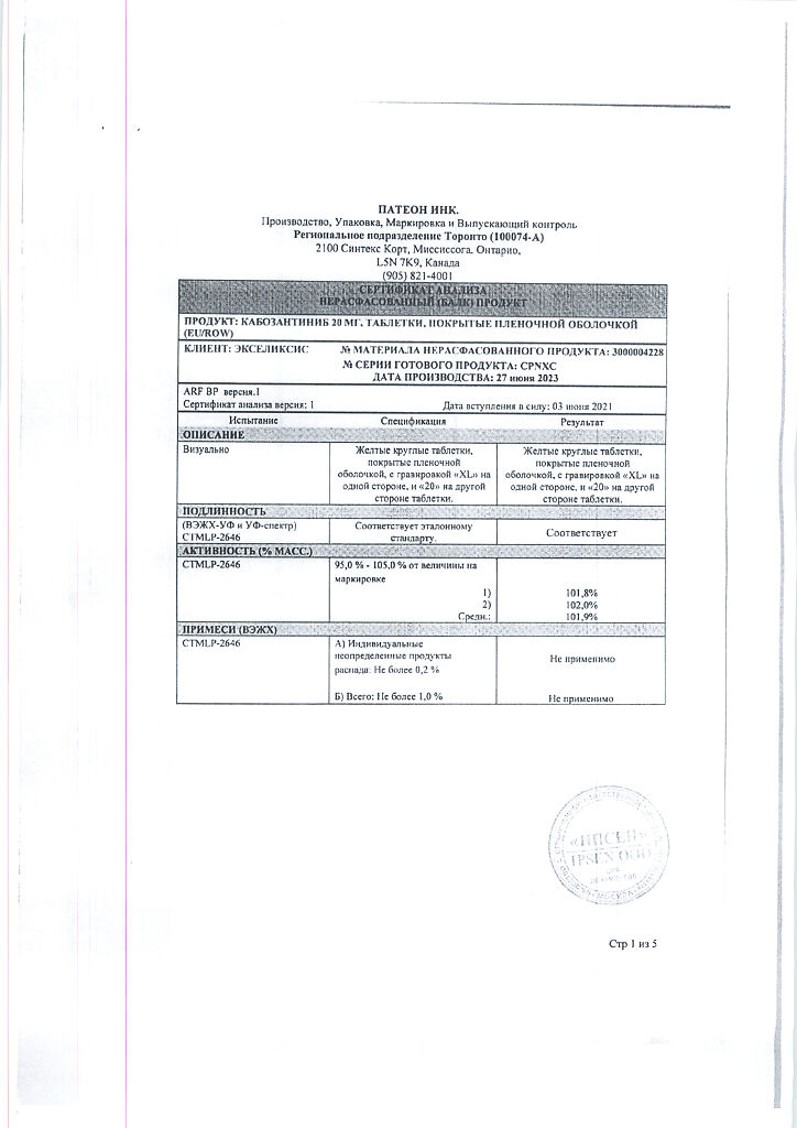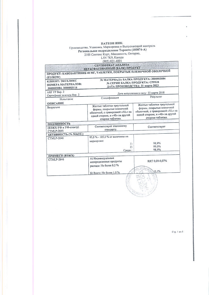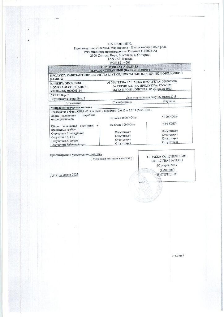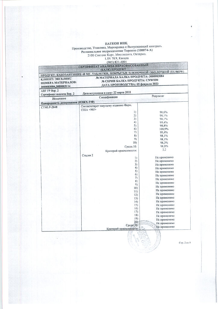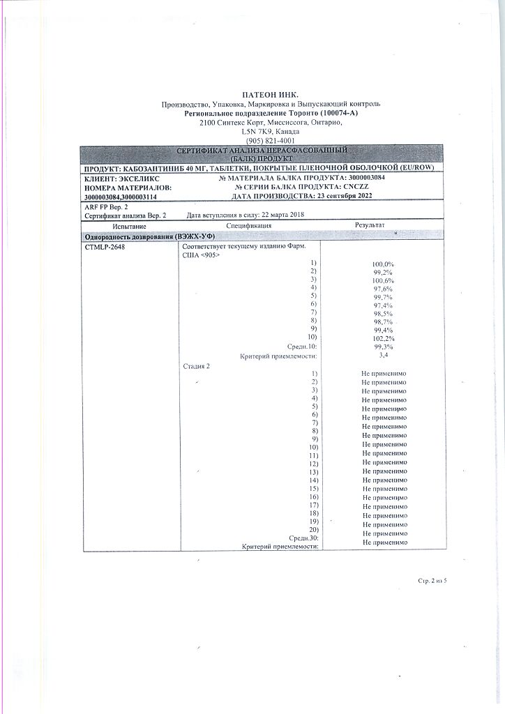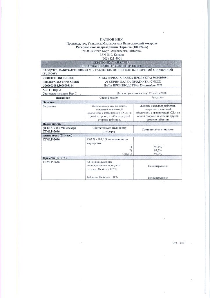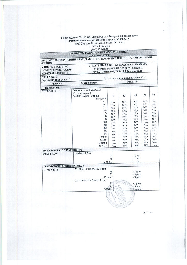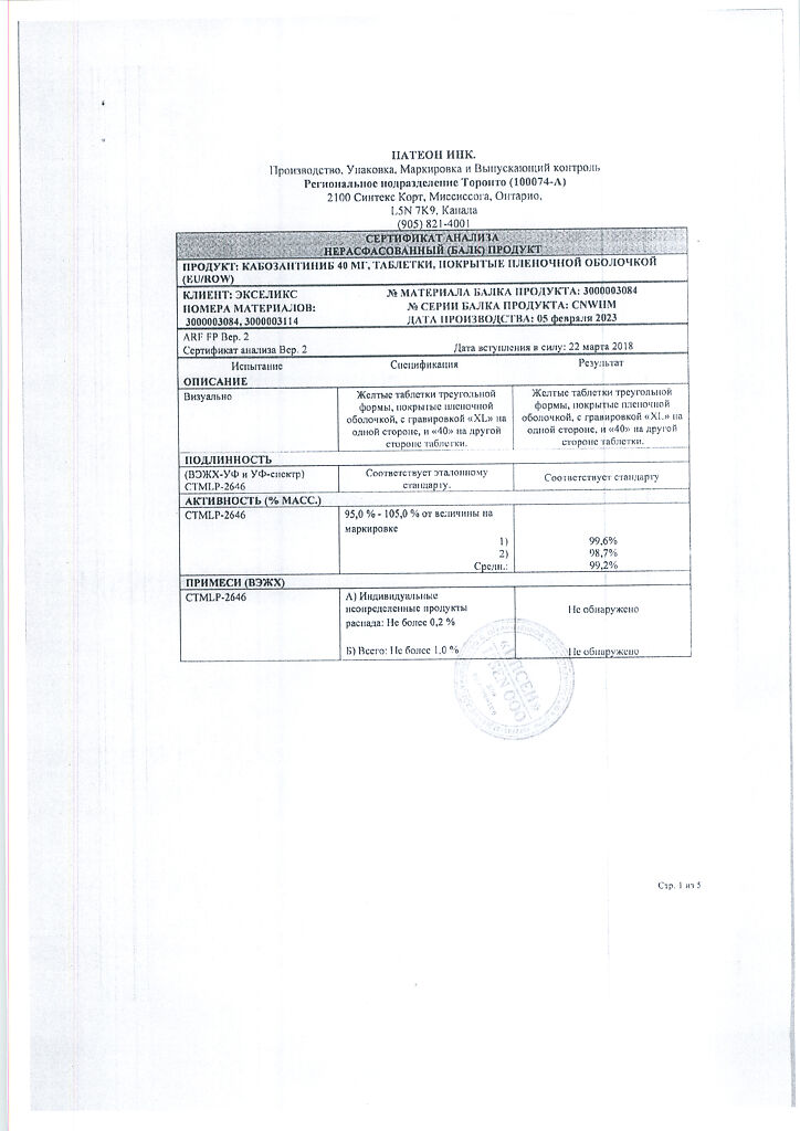 Экспозиция неконъюгированных метаболитов (XL184-N-оксида и продукта расщепления амида XL184), обладающих активностью менее 1% от активности исходного кабозантиниба, составляет менее 10% каждый от общей экспозиции препарата в плазме крови.