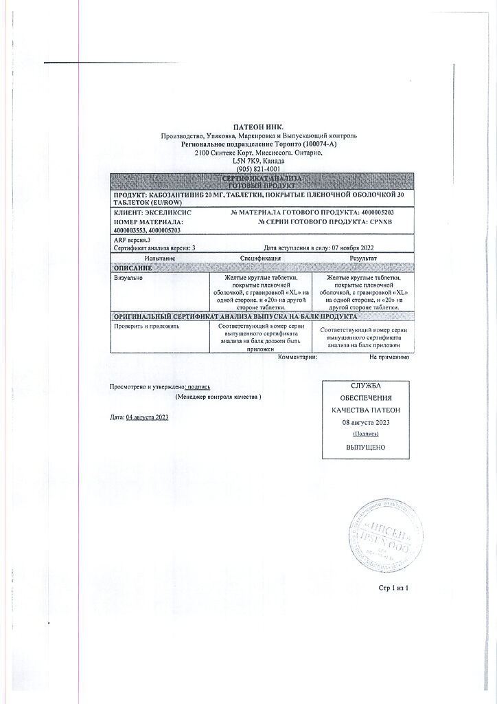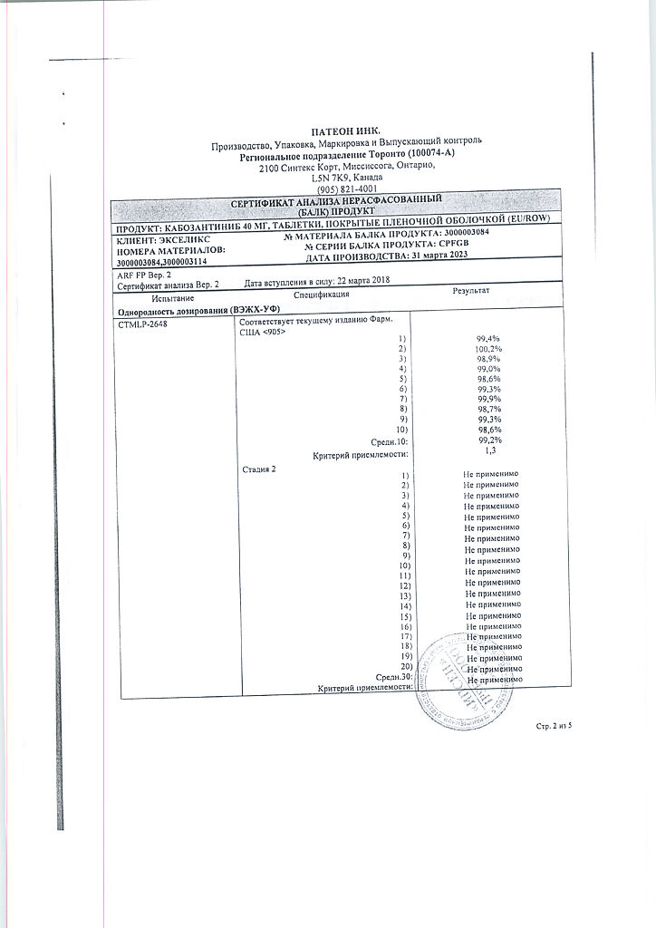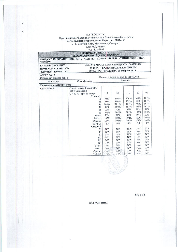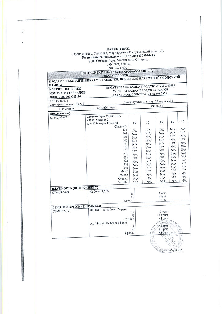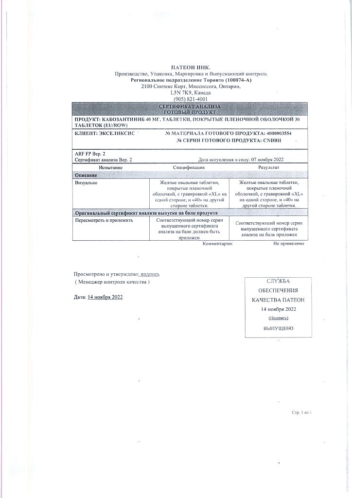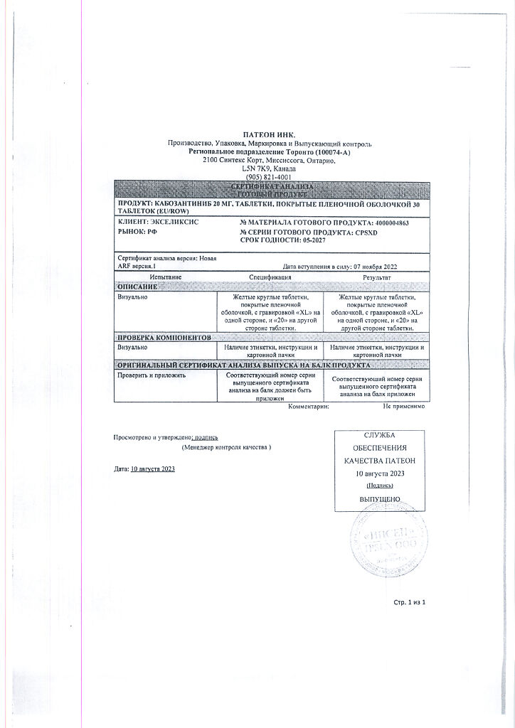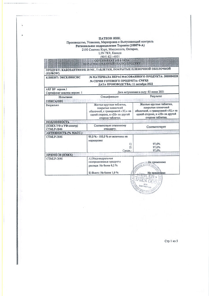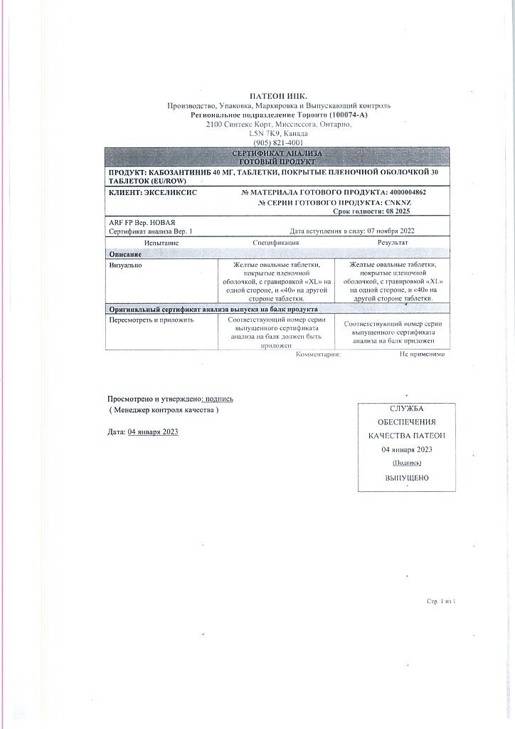 Экспозиция неконъюгированных метаболитов (XL184-N-оксида и продукта расщепления амида XL184), обладающих активностью менее 1% от активности исходного кабозантиниба, составляет менее 10% каждый от общей экспозиции препарата в плазме крови.