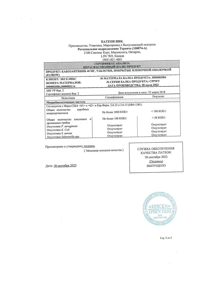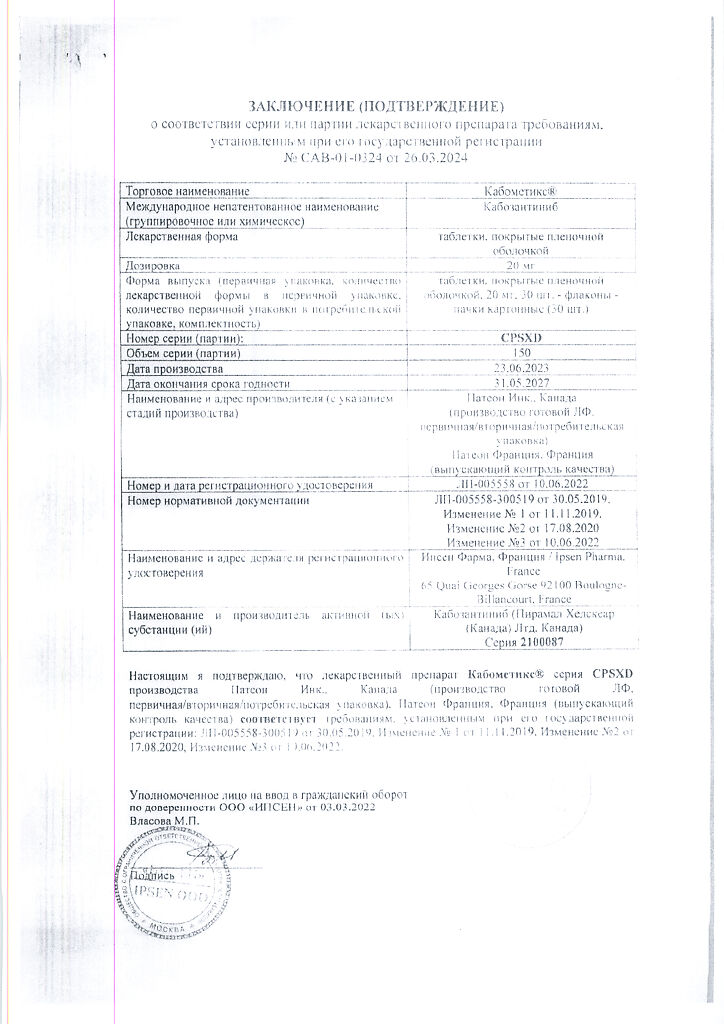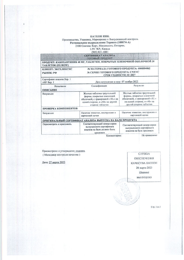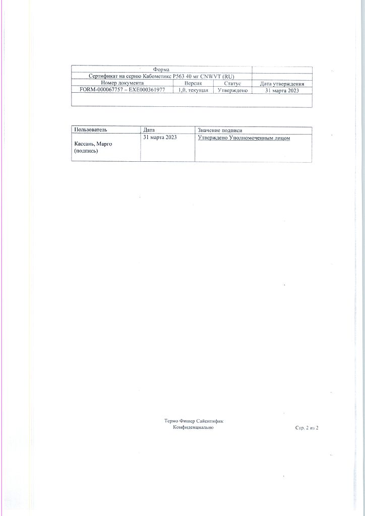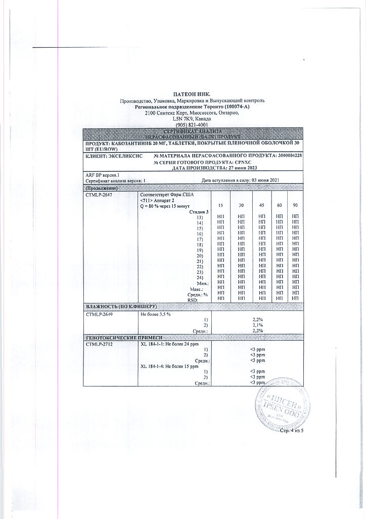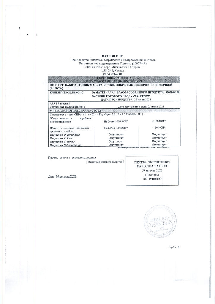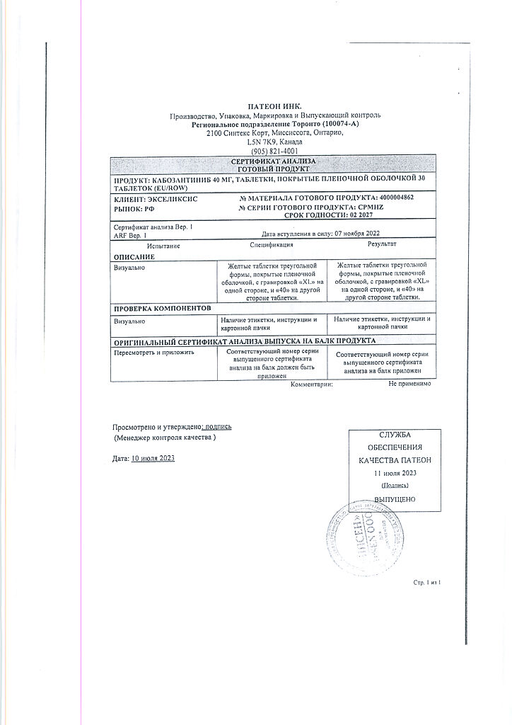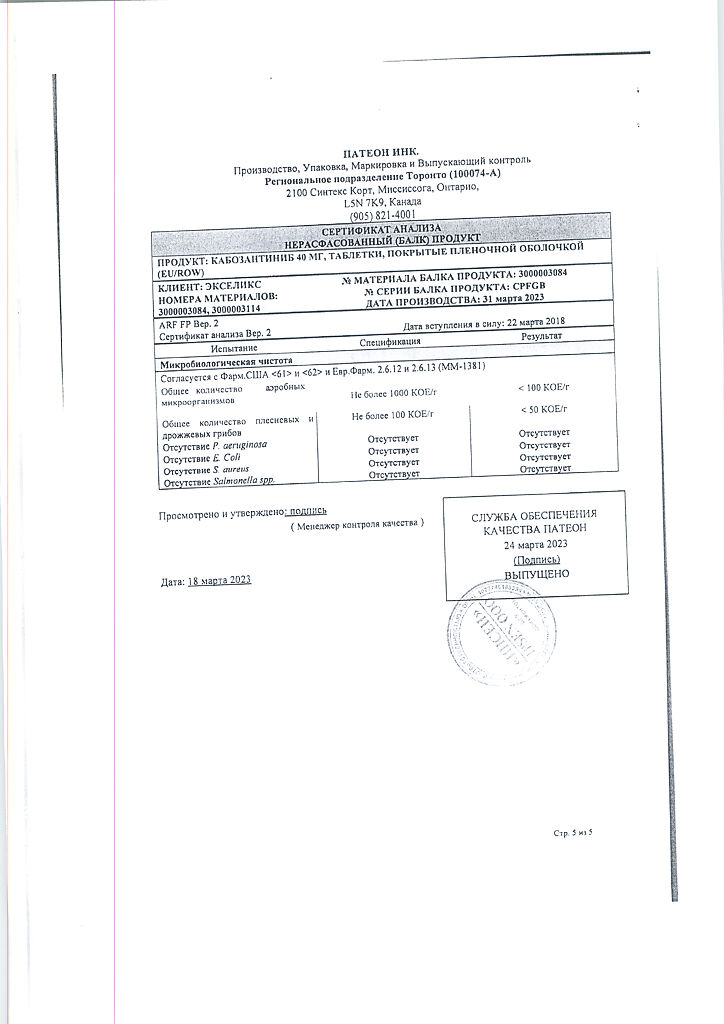 Экспозиция неконъюгированных метаболитов (XL184-N-оксида и продукта расщепления амида XL184), обладающих активностью менее 1% от активности исходного кабозантиниба, составляет менее 10% каждый от общей экспозиции препарата в плазме крови.