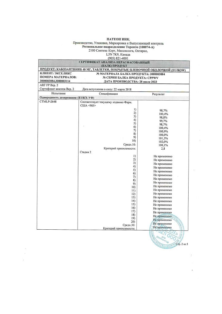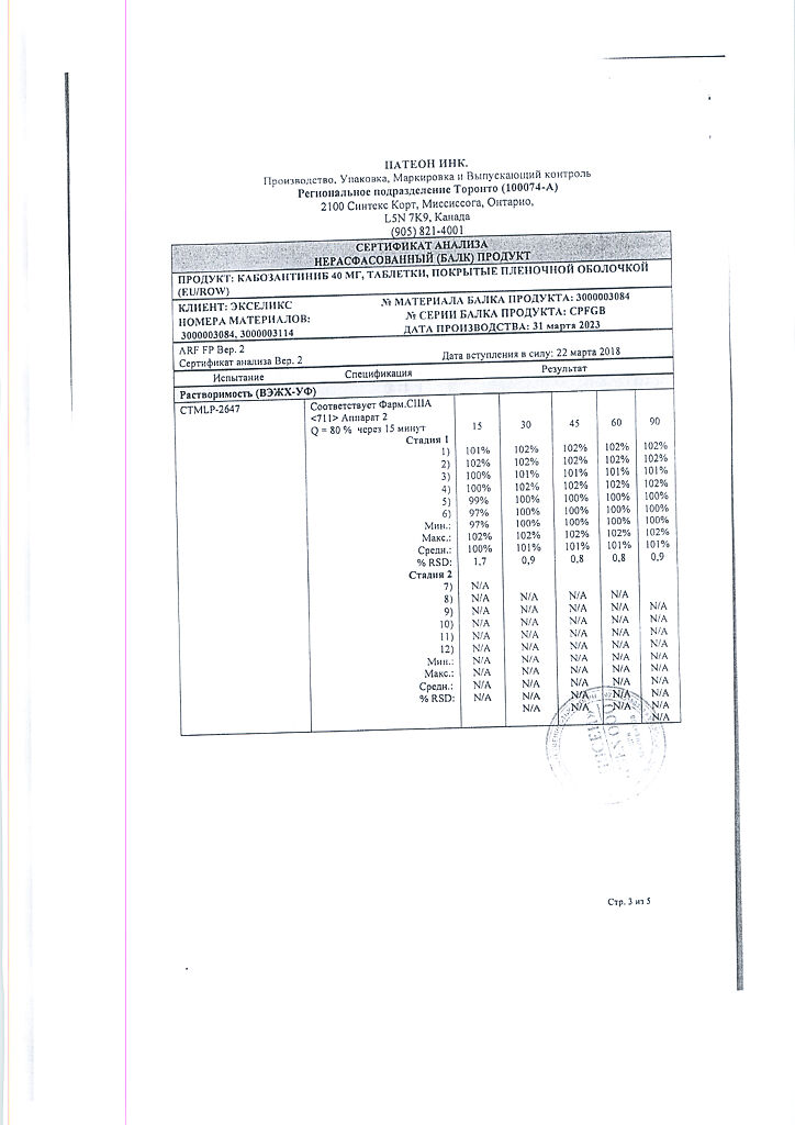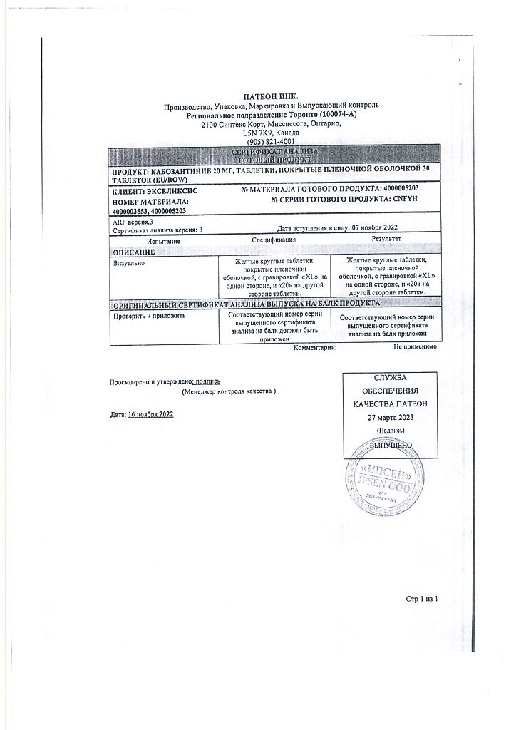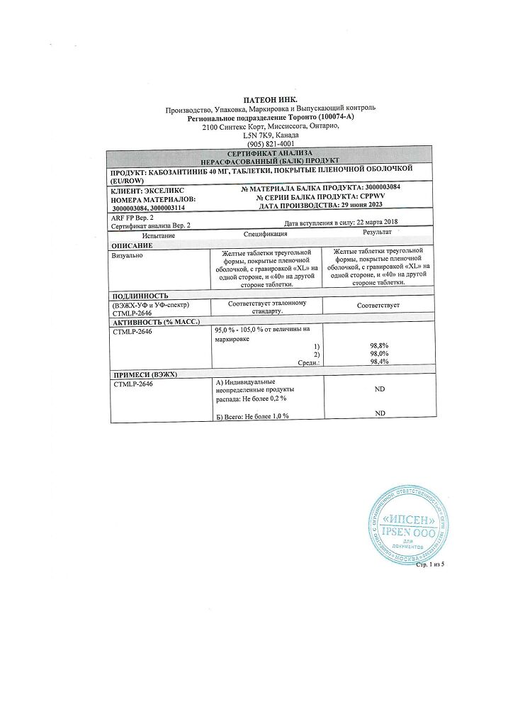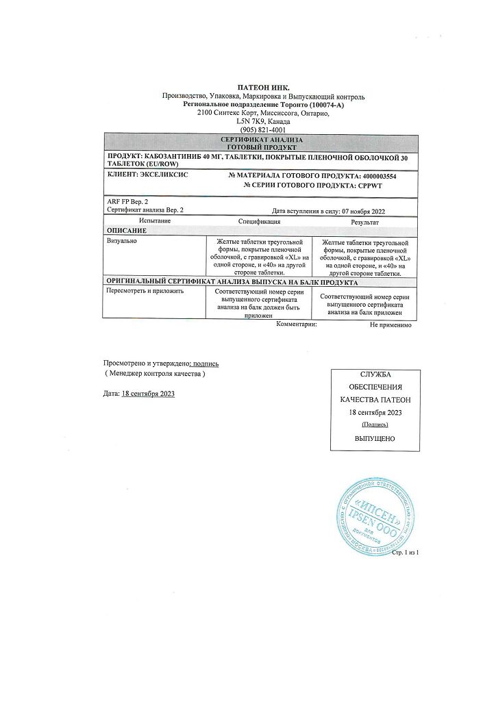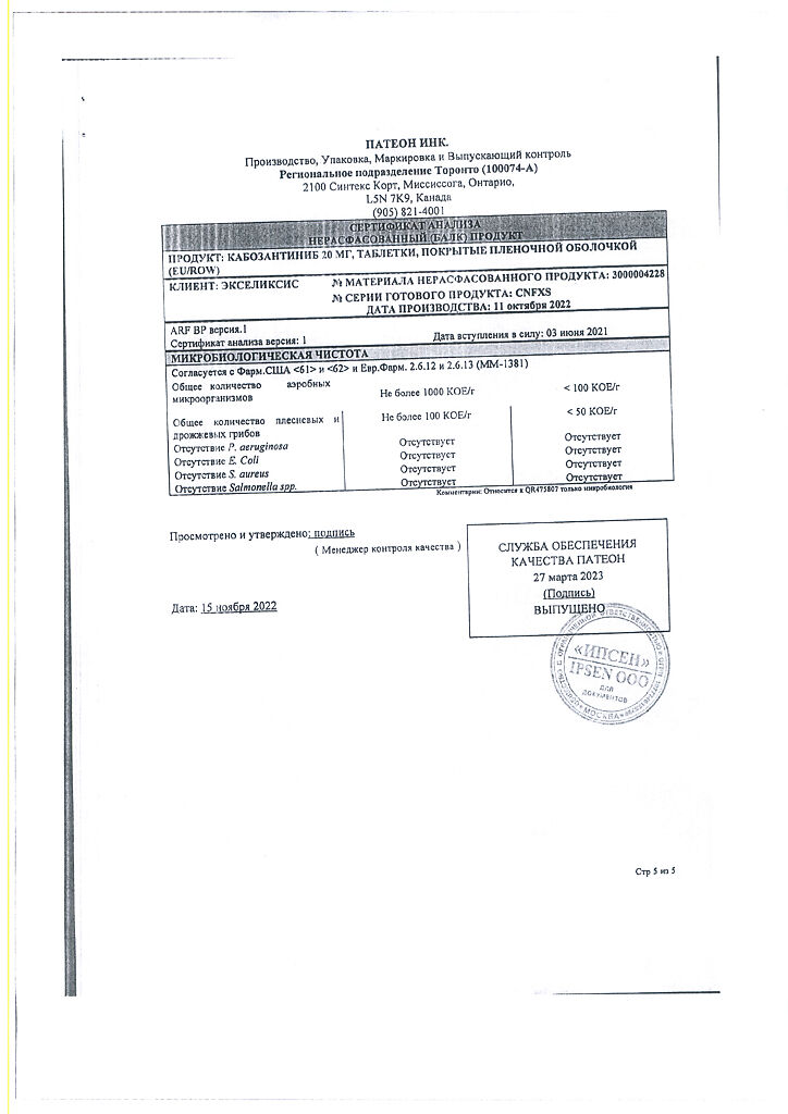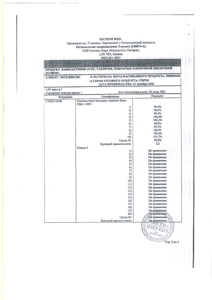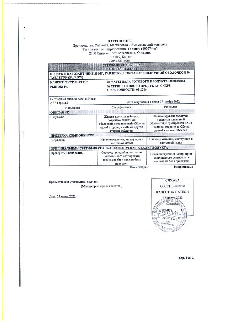 Экспозиция неконъюгированных метаболитов (XL184-N-оксида и продукта расщепления амида XL184), обладающих активностью менее 1% от активности исходного кабозантиниба, составляет менее 10% каждый от общей экспозиции препарата в плазме крови.