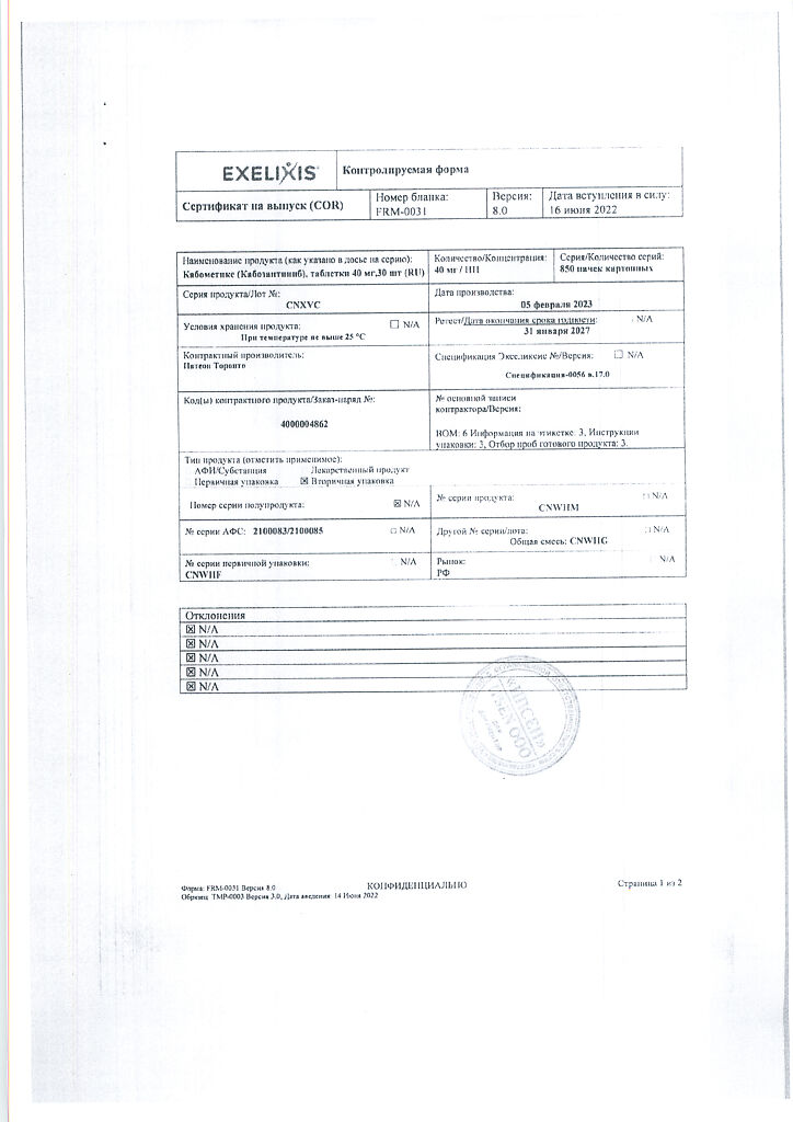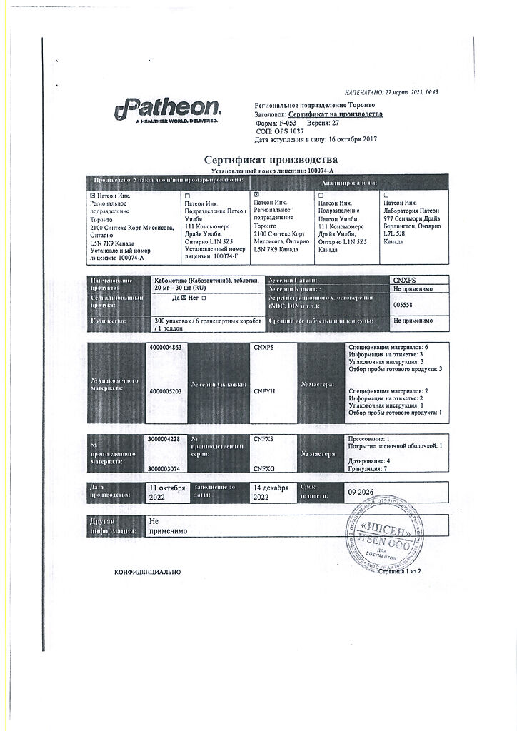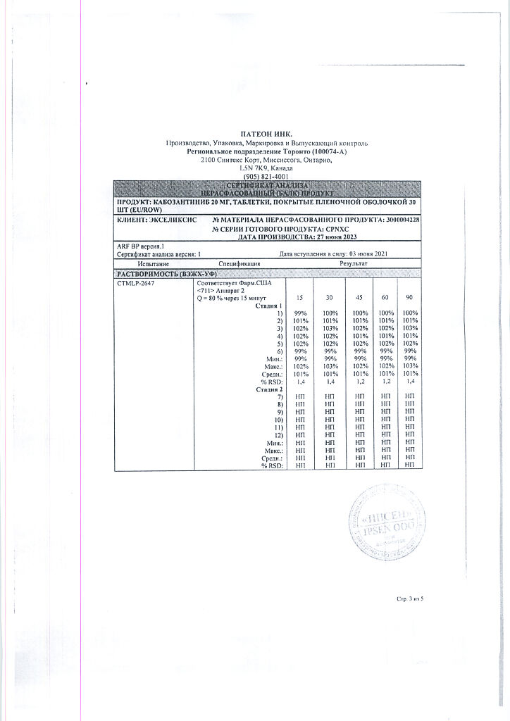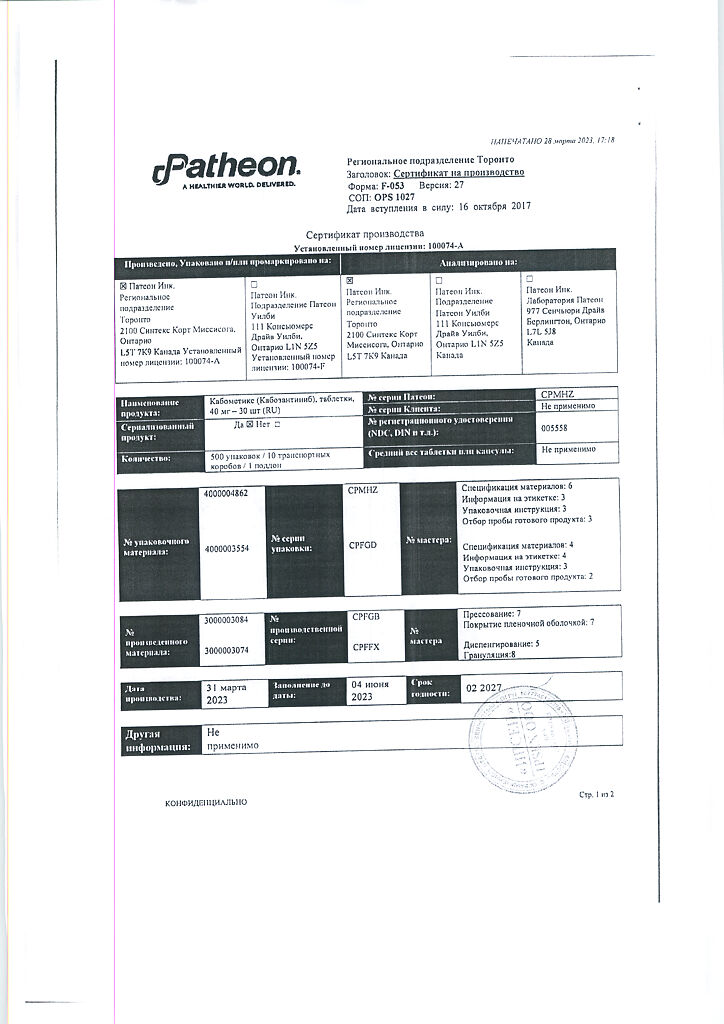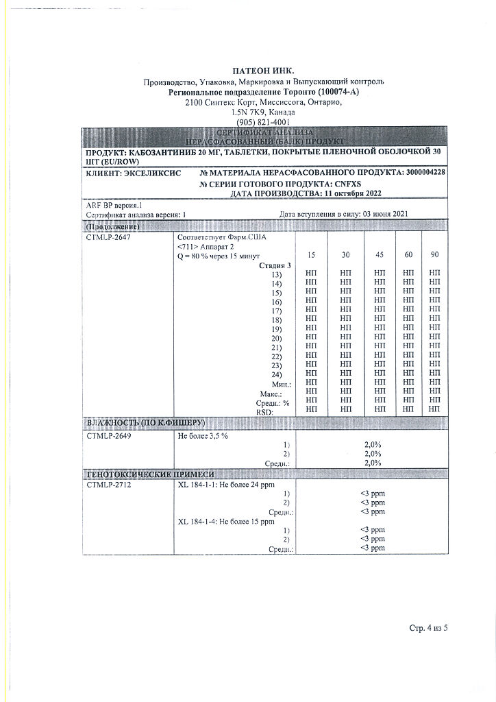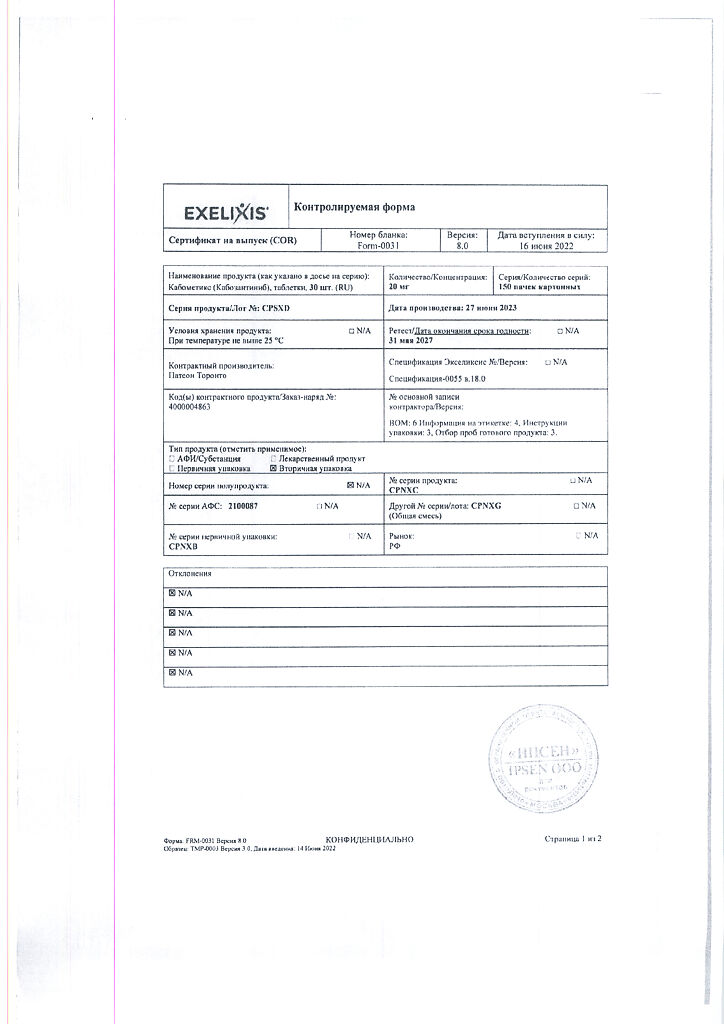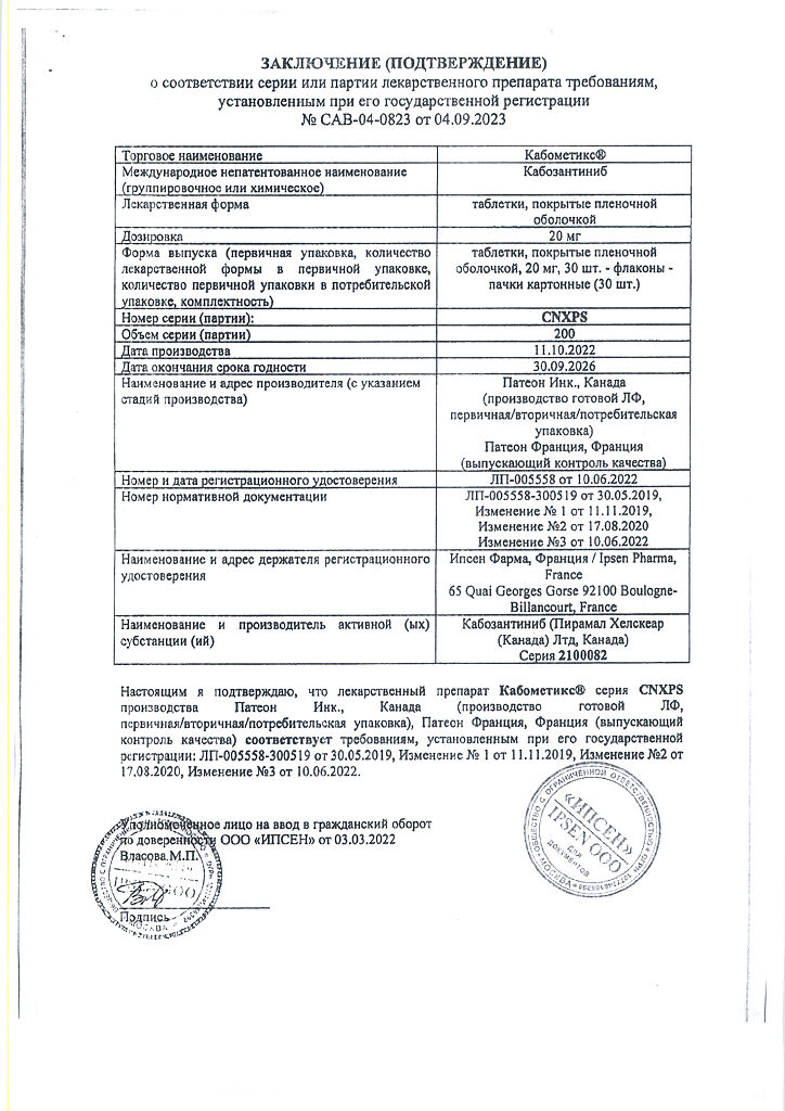 Влияние на способность управлять транспортными средствами, механизмамиКабозантиниб оказывает незначительное влияние на способность управлять транспортными средствами и механизмами. Побочные реакции, такие как усталость и слабость, были связаны с кабозантинибом. Поэтому следует соблюдать осторожность при вождении или эксплуатации механизмов.