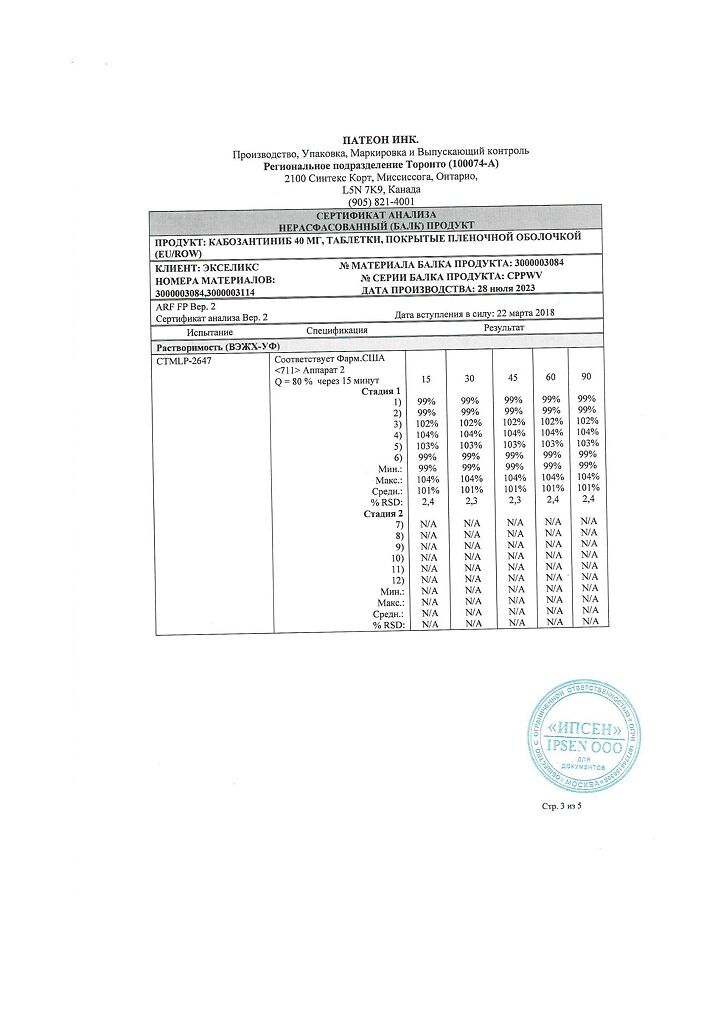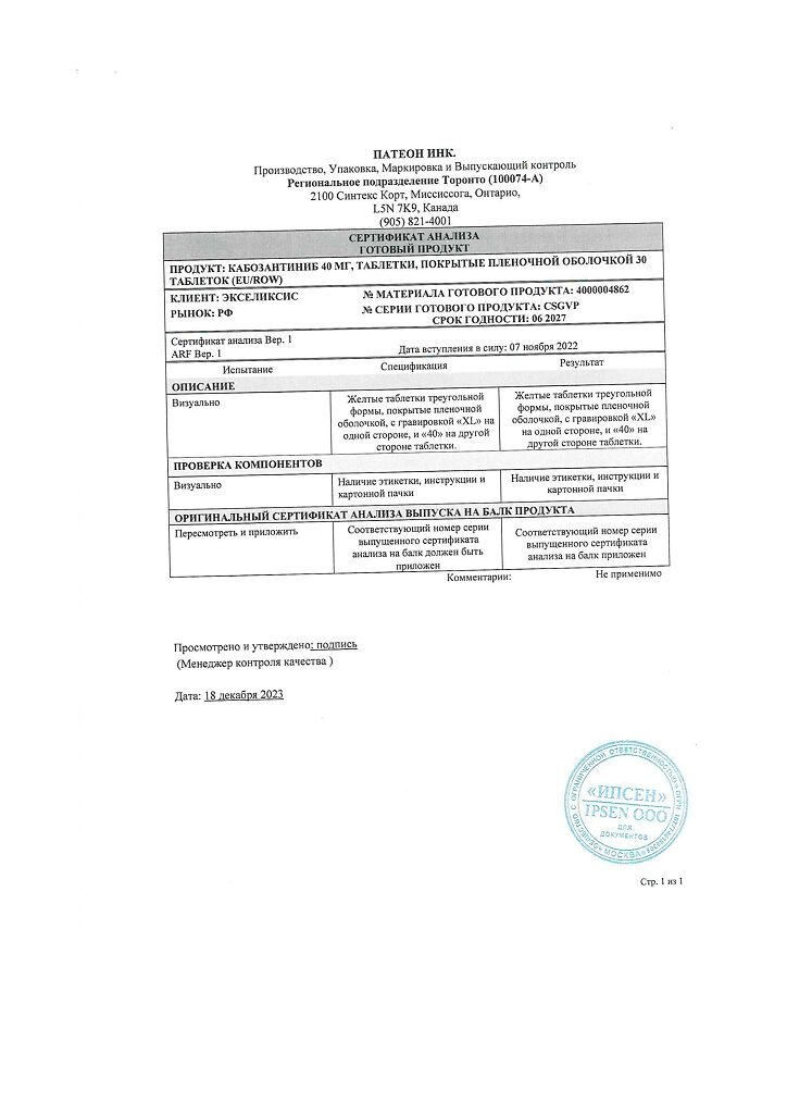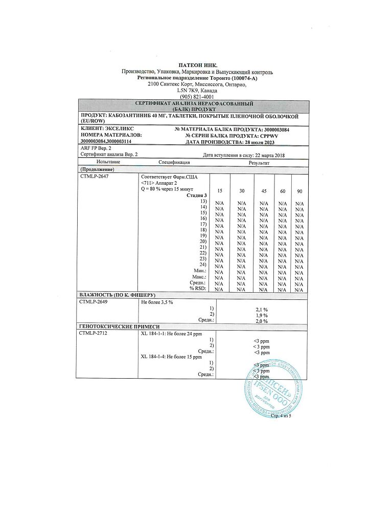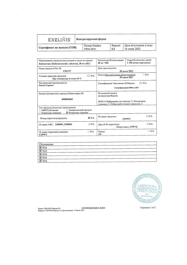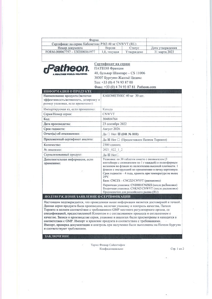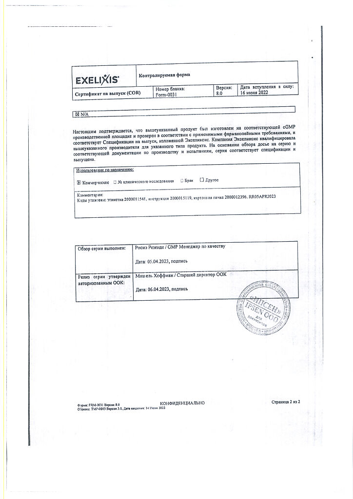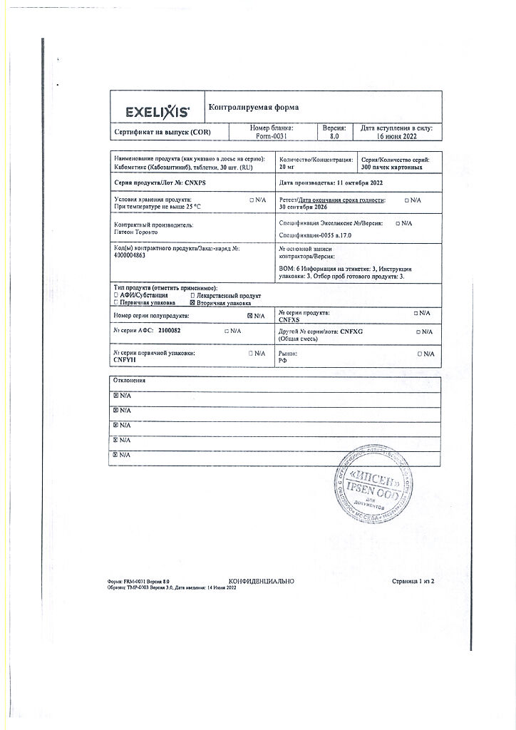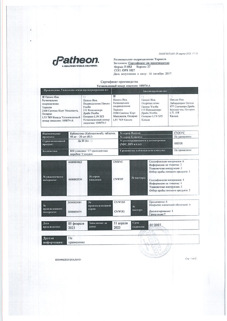 Влияние на способность управлять транспортными средствами, механизмамиКабозантиниб оказывает незначительное влияние на способность управлять транспортными средствами и механизмами. Побочные реакции, такие как усталость и слабость, были связаны с кабозантинибом. Поэтому следует соблюдать осторожность при вождении или эксплуатации механизмов.