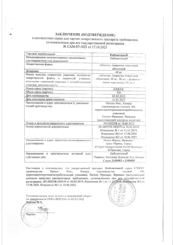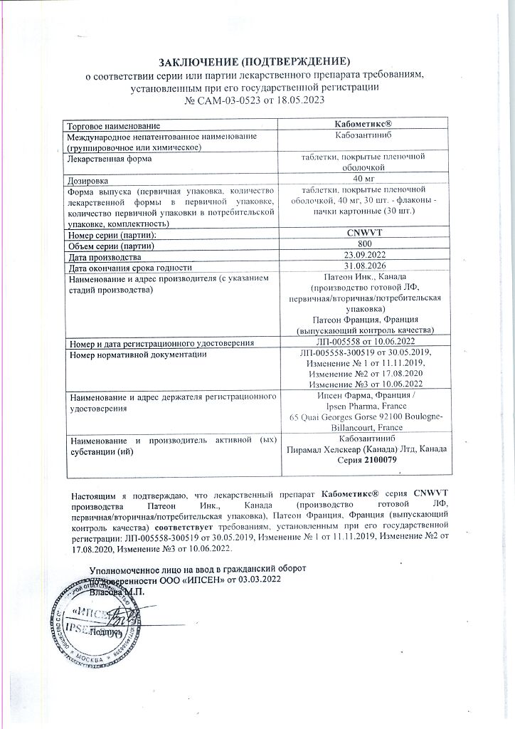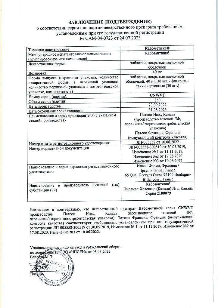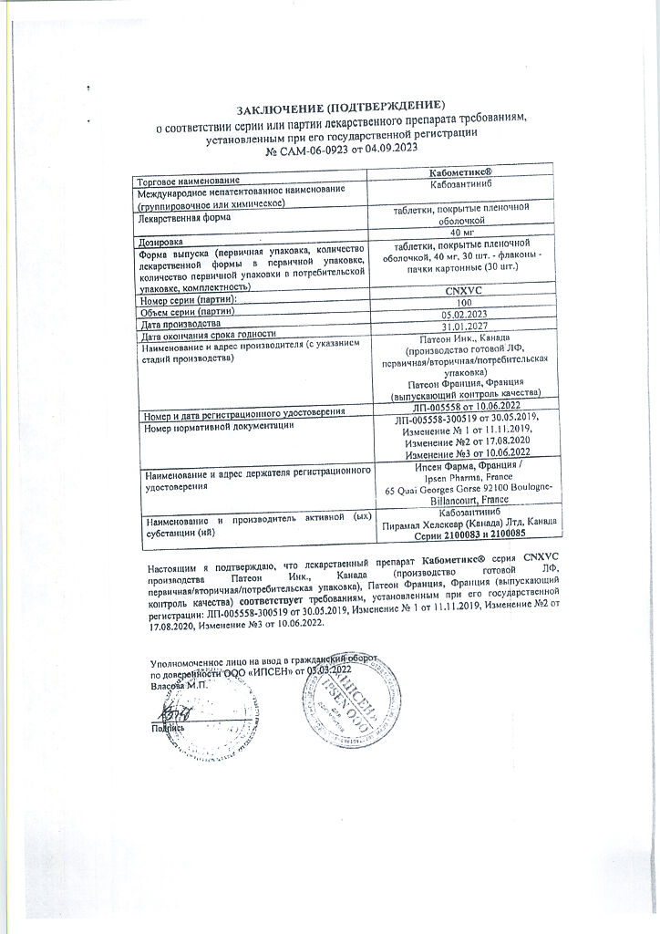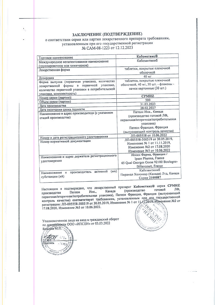 Терапия препаратом Кабометикс® должна проводиться врачом, имеющим опыт применения противоопухолевых лекарственных препаратов.