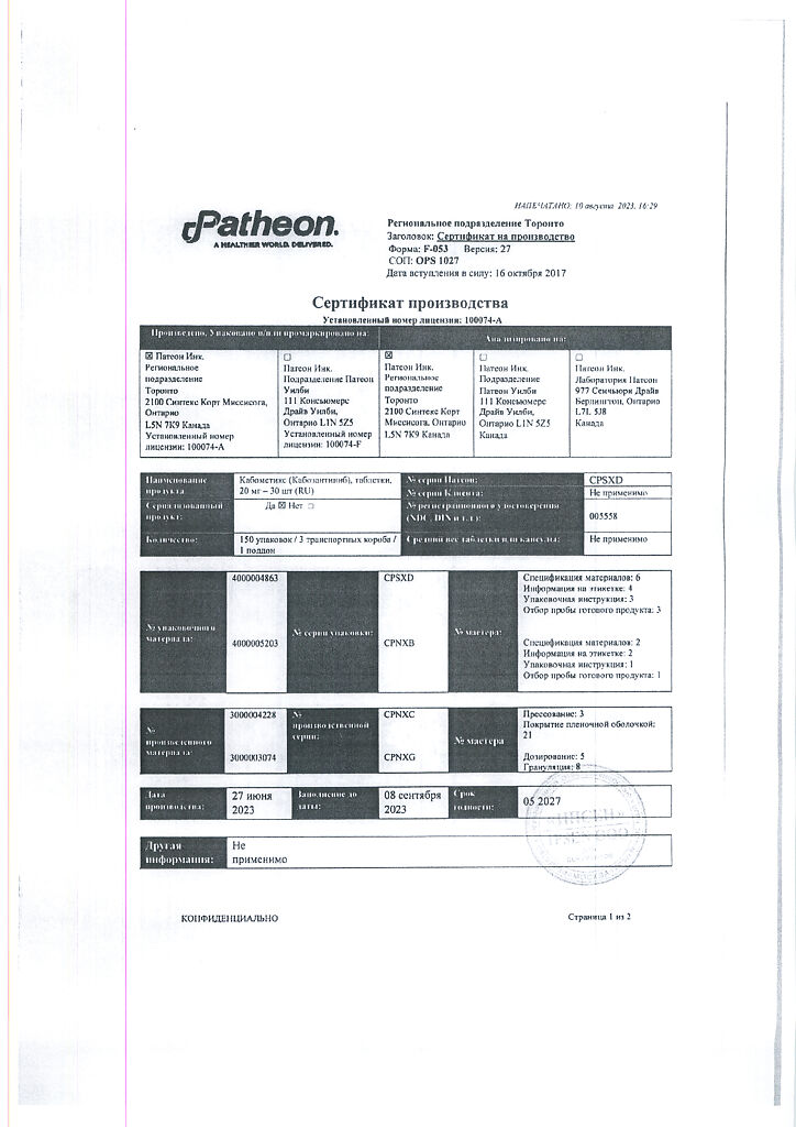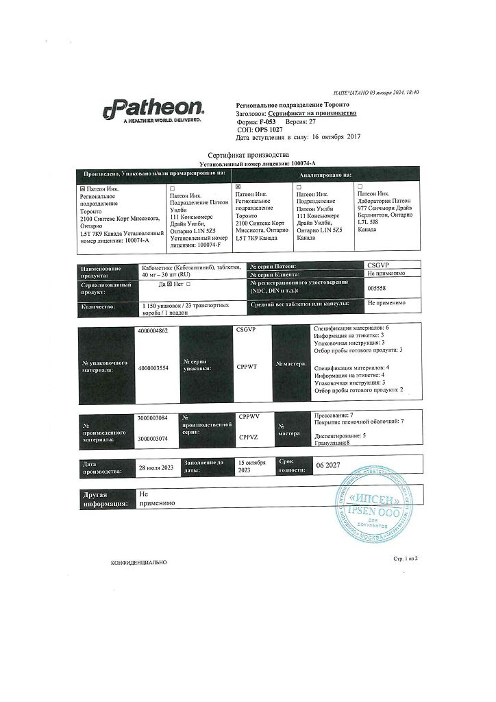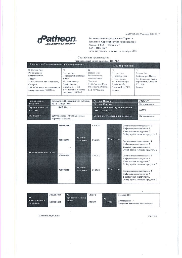Таблетки следует проглатывать целиком, не разламывать. Следует воздержаться от приема пищи как минимум за 2 часа до приема и 1 час после приема препарата Кабометикс®.