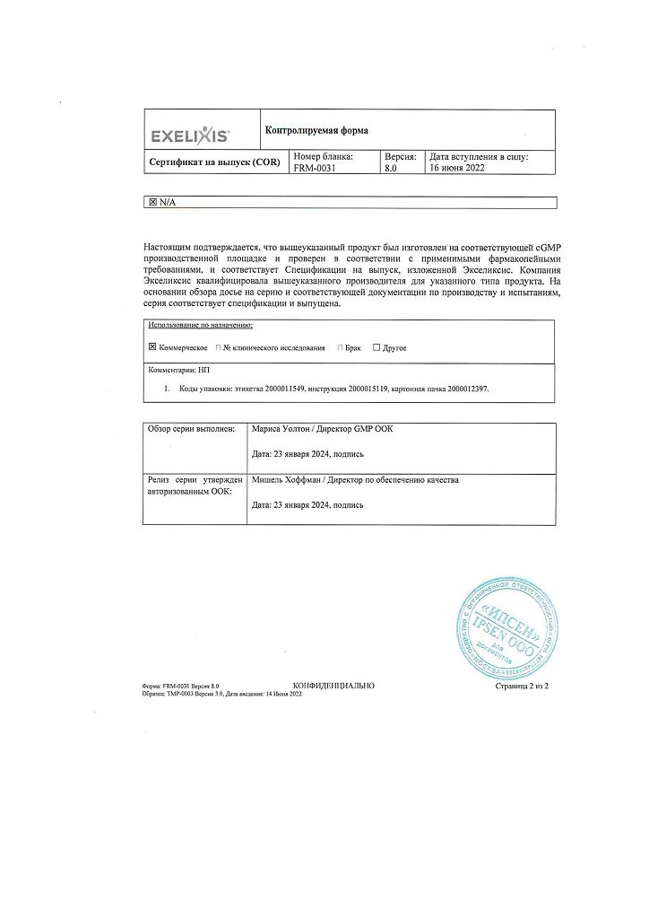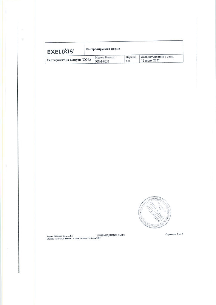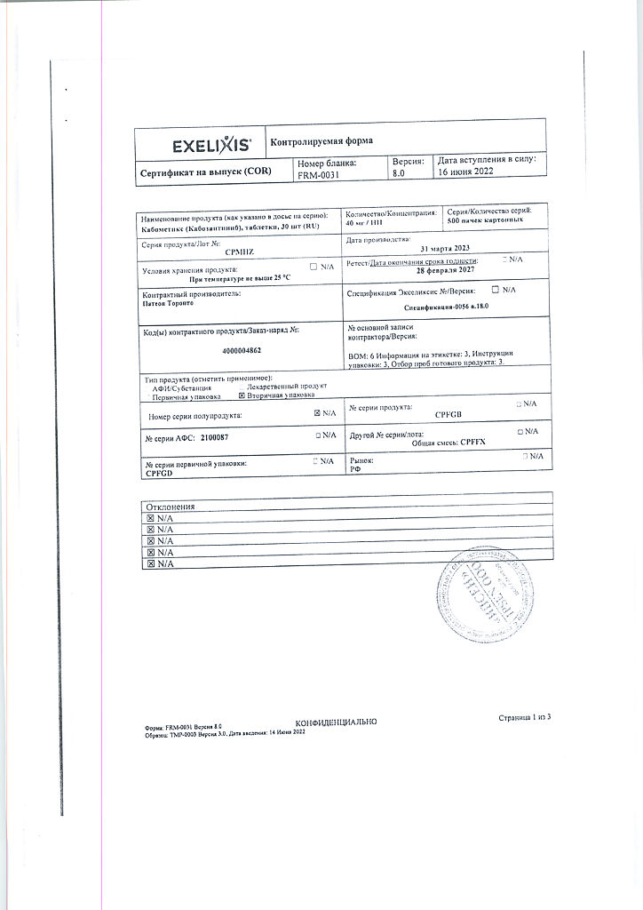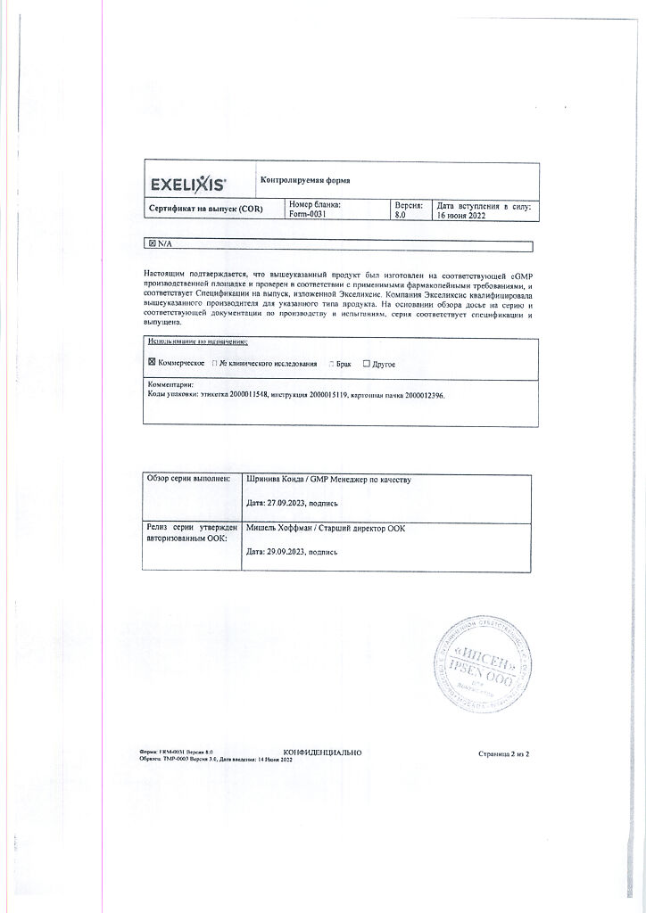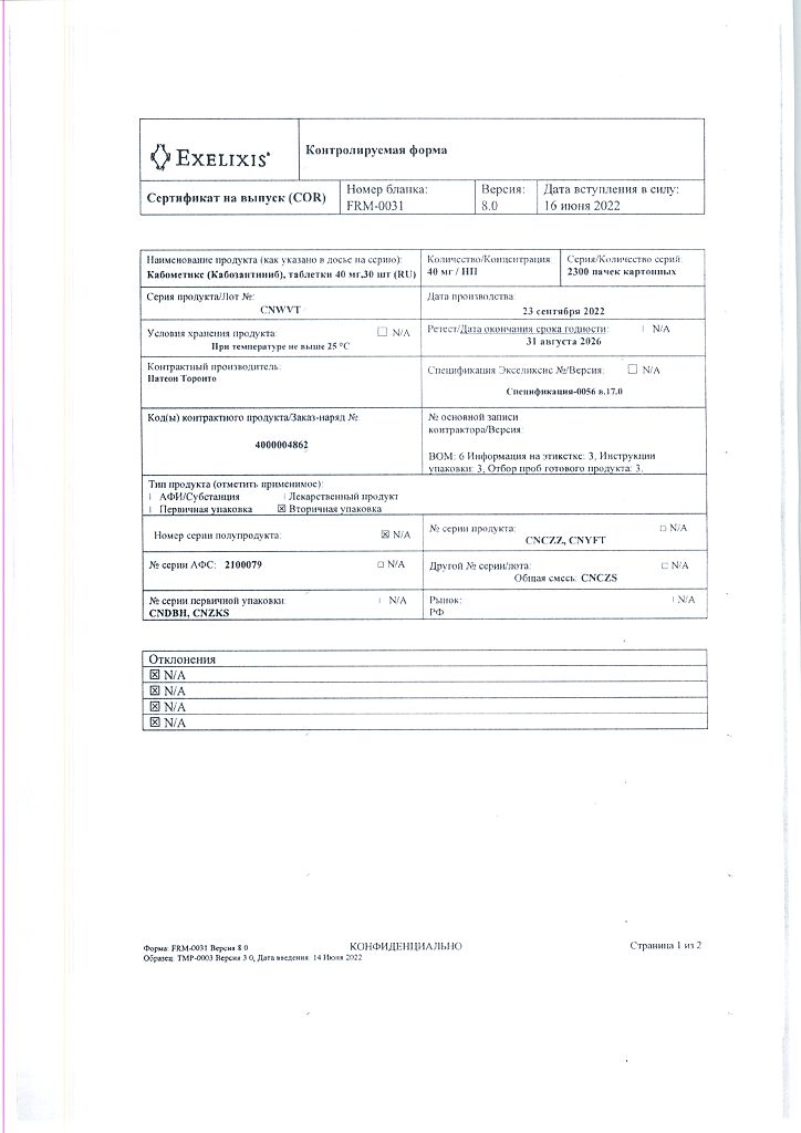 Средний клиренс (CL/F) в равновесном состоянии составил 2,2 л/час. После однократного приема радиоактивно меченного [14С]-кабозантиниба здоровыми добровольцами, уровень выделенной радиоактивности в течение 48 часов составил около 81% от общей введенной радиоактивности, из них 54% выделилось с калом и 27% с мочой.