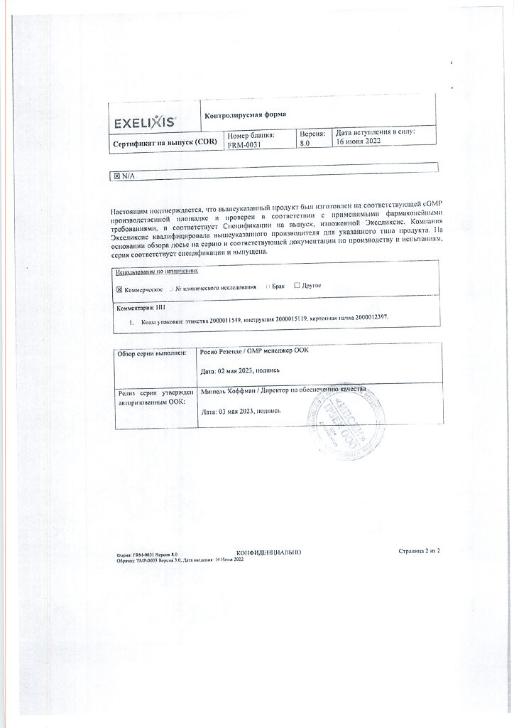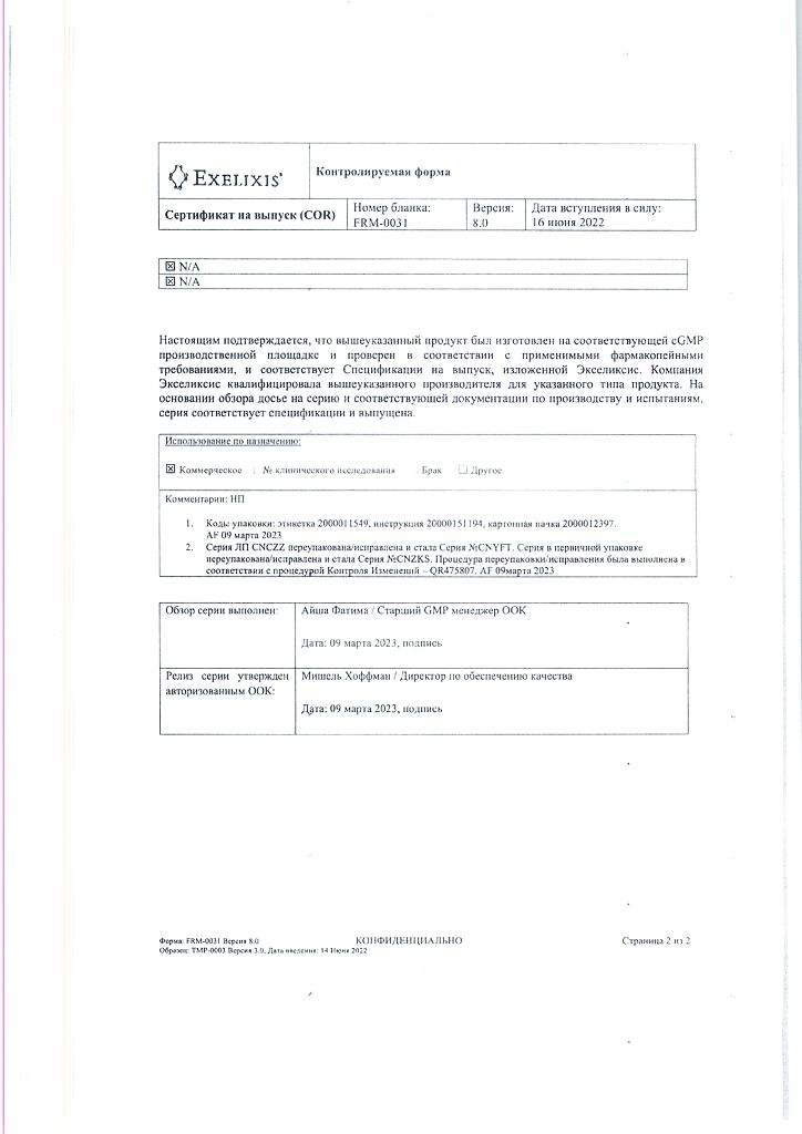 Данные in vitro демонстрируют, что кабозантиниб является субстратом MRP2. Поэтому совместное применение кабозантиниба с ингибиторами MRP2 может привести к повышению концентрации кабозантиниба в плазме крови.