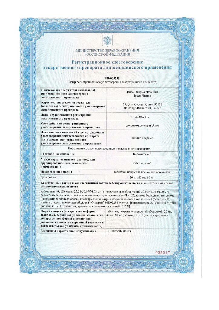 Кабозантиниб это небольшая молекула, ингибитор различных рецепторных тирозинкиназ, участвующих в процессе роста опухоли, ангиогенеза, ремоделировании костной ткани, формирования лекарственной устойчивости и образования метастазов.