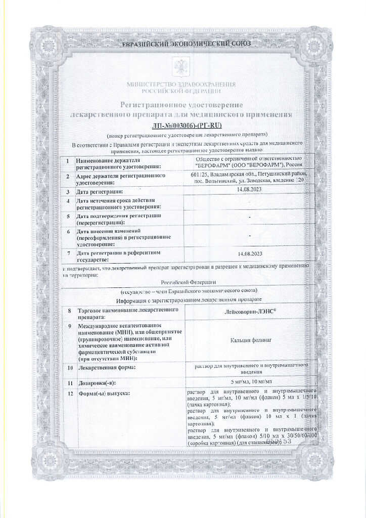 При нормальном выведении метотрексата (уровень метотрексата в плазме приблизительно 10 мкМ через 24 ч после введения, 1 мкМ через 48 ч и менее 0,2 мкМ через 72 ч) кальция фолинат применяют в дозе 15 мг (приблизительно 10 мг/м2) внутрь, в/в или в/м каждые 6 ч в течение 60 ч (10 доз, начиная через 24 ч после начала введения метотрексата).