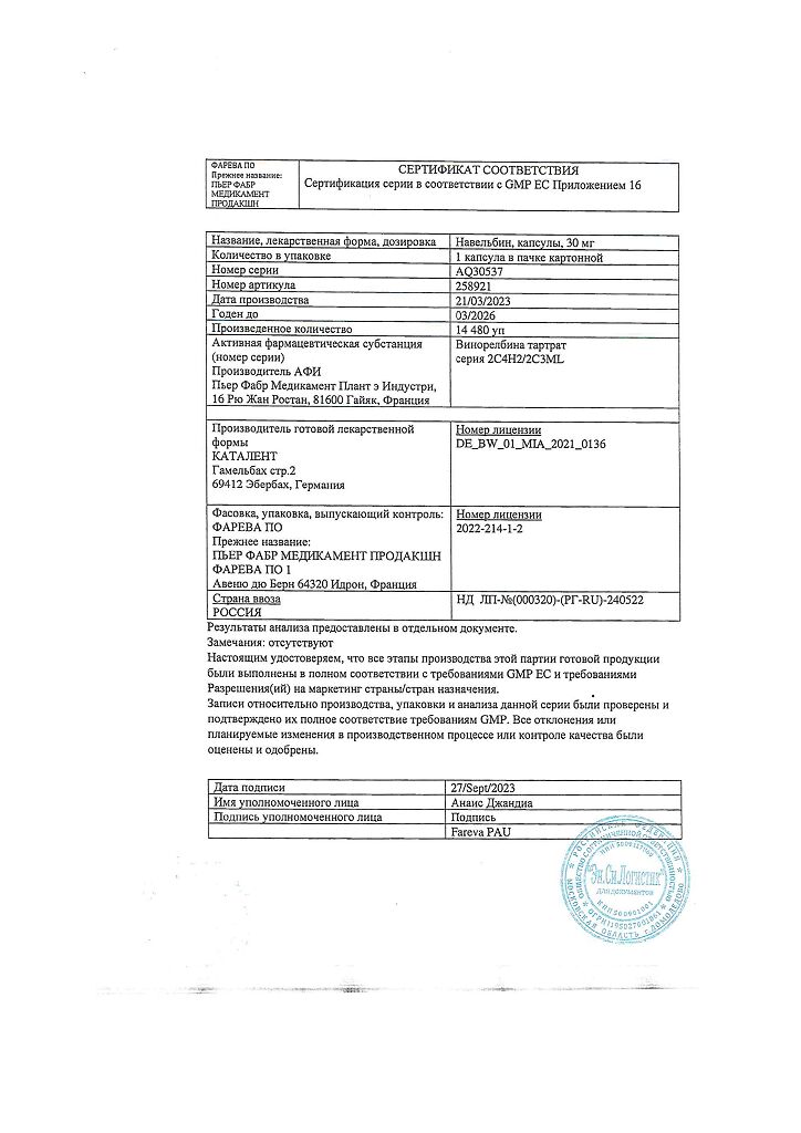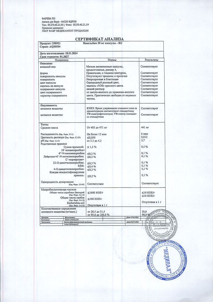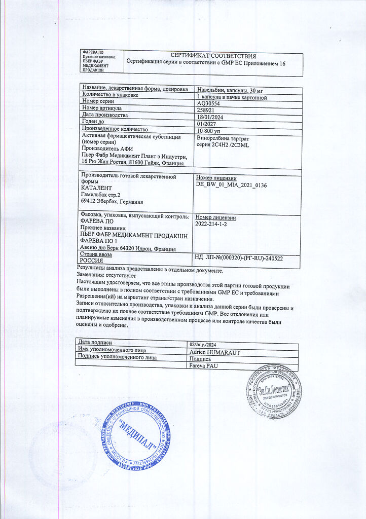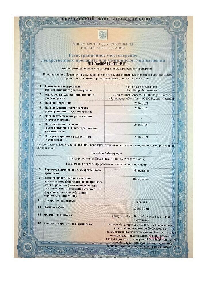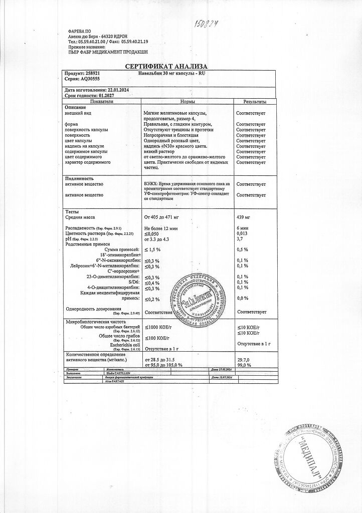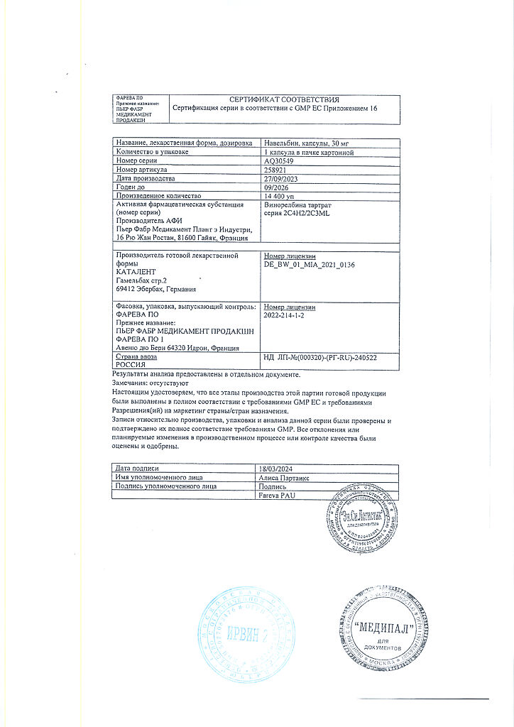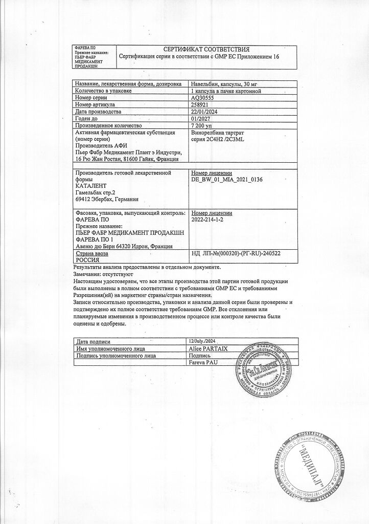 Действующие вещества: винорелбина тартрат 41,55 мг, что соответствует содержанию винорелбина 30 мг.