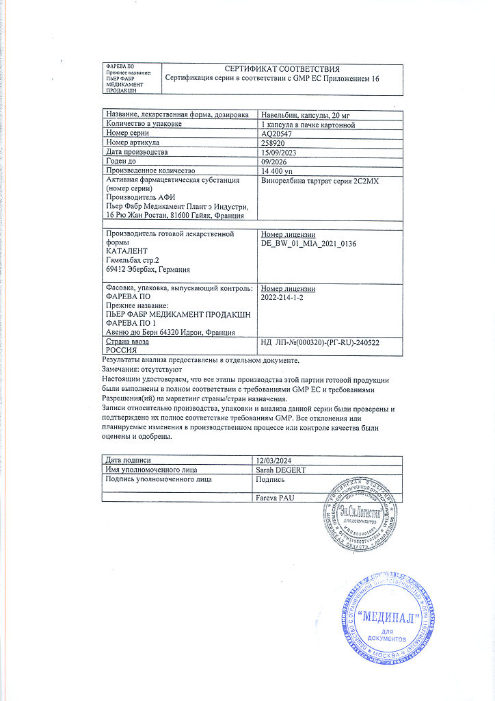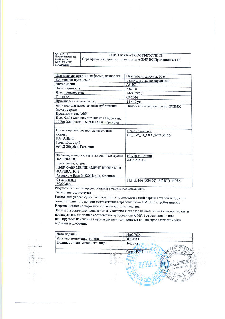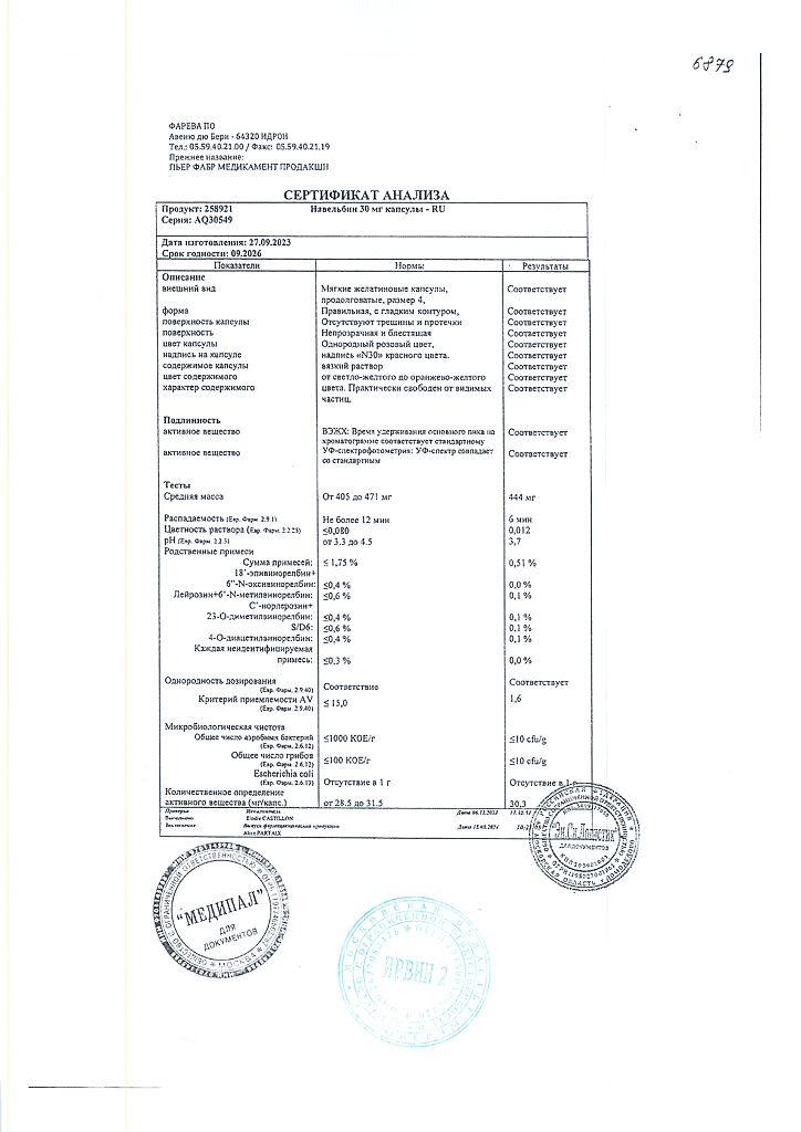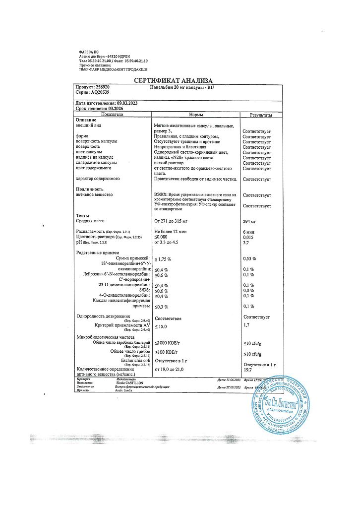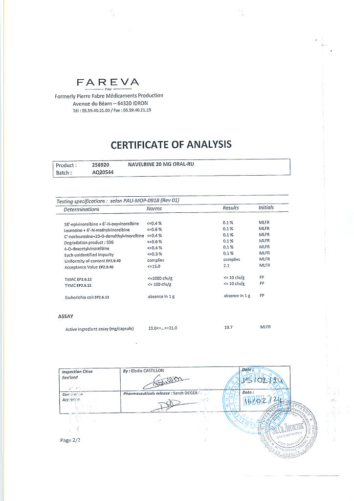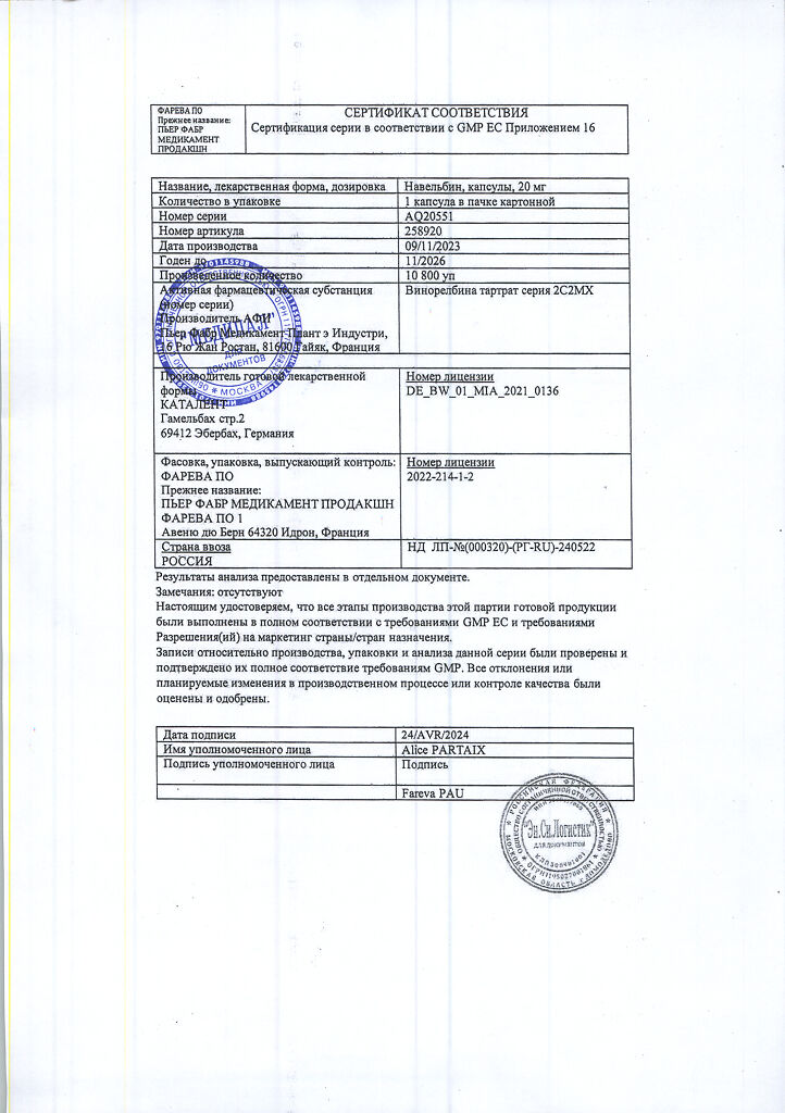 Применение Навельбина внутрь в дозах 60 мг/м2 и 80 мг/м2 соответствует в/в введению Навельбина в дозах 25 мг/м2 и 30 мг/м2 .
