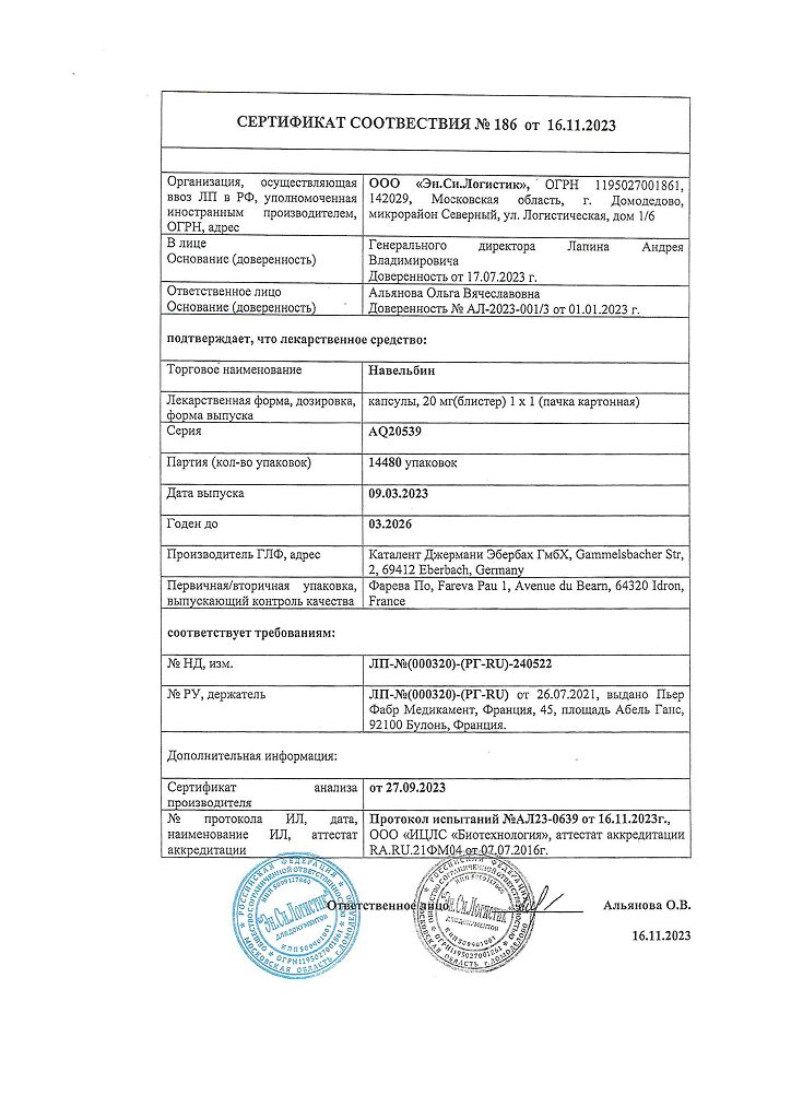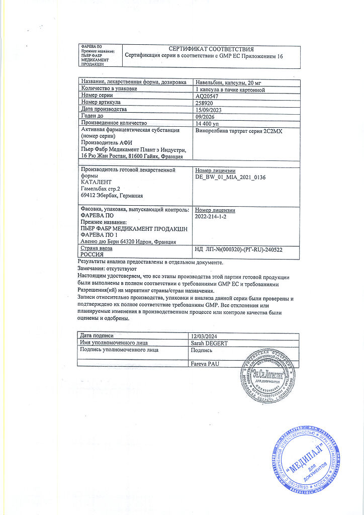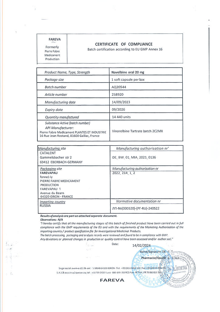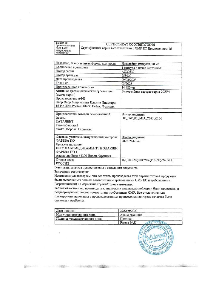 Действующие вещества: винорелбина тартрат 13,85 мг, что соответствует содержанию винорелбина основания 10 мг.