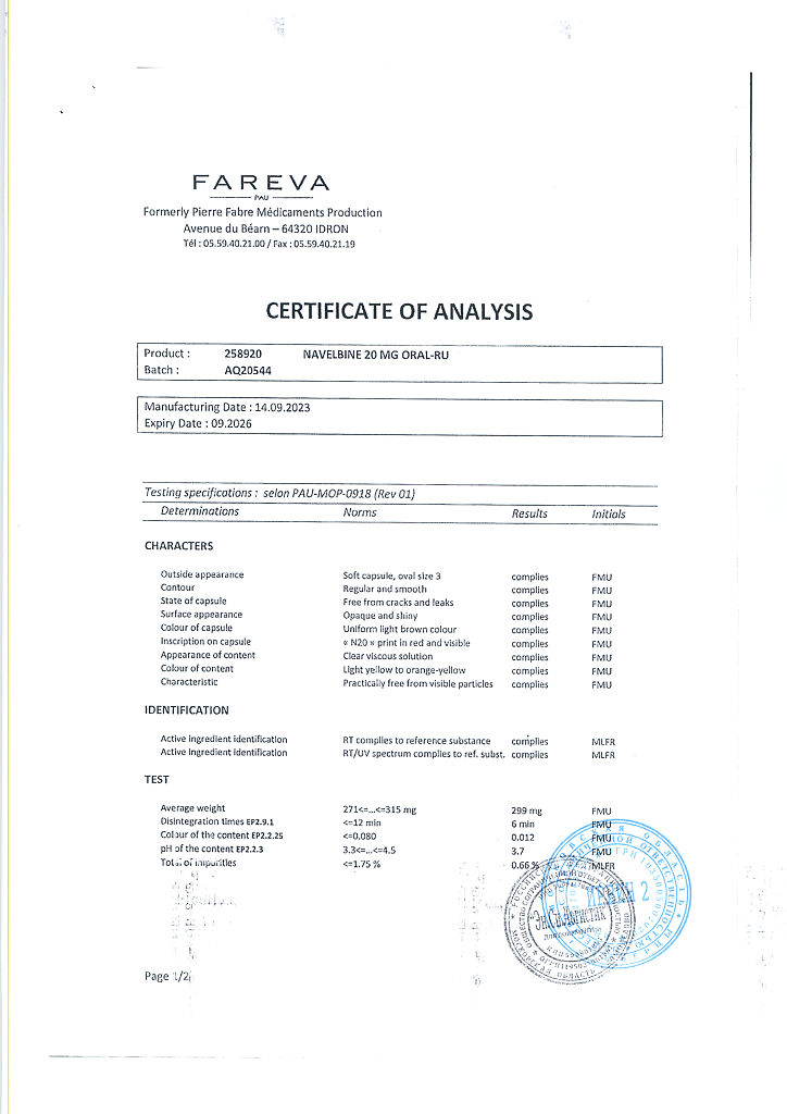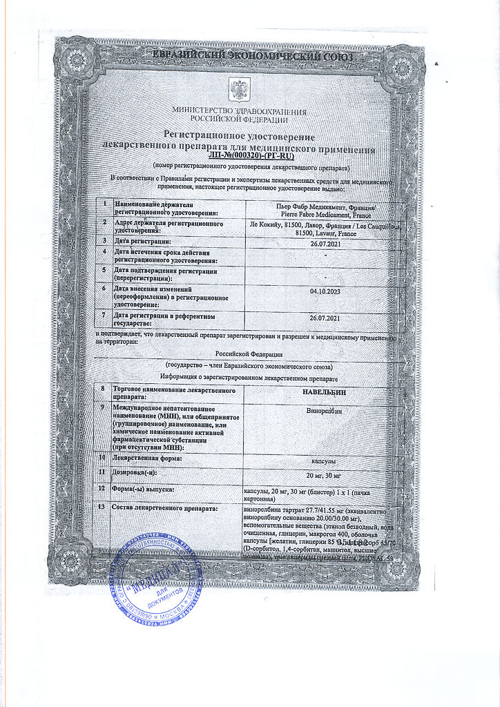 После приема внутрь быстро абсорбируется из ЖКТ. Сmax винорелбина достигается через 1,5-3 ч. Абсолютная биодоступность в среднем составляет 40%. Прием пищи не влияет на степень всасывания.