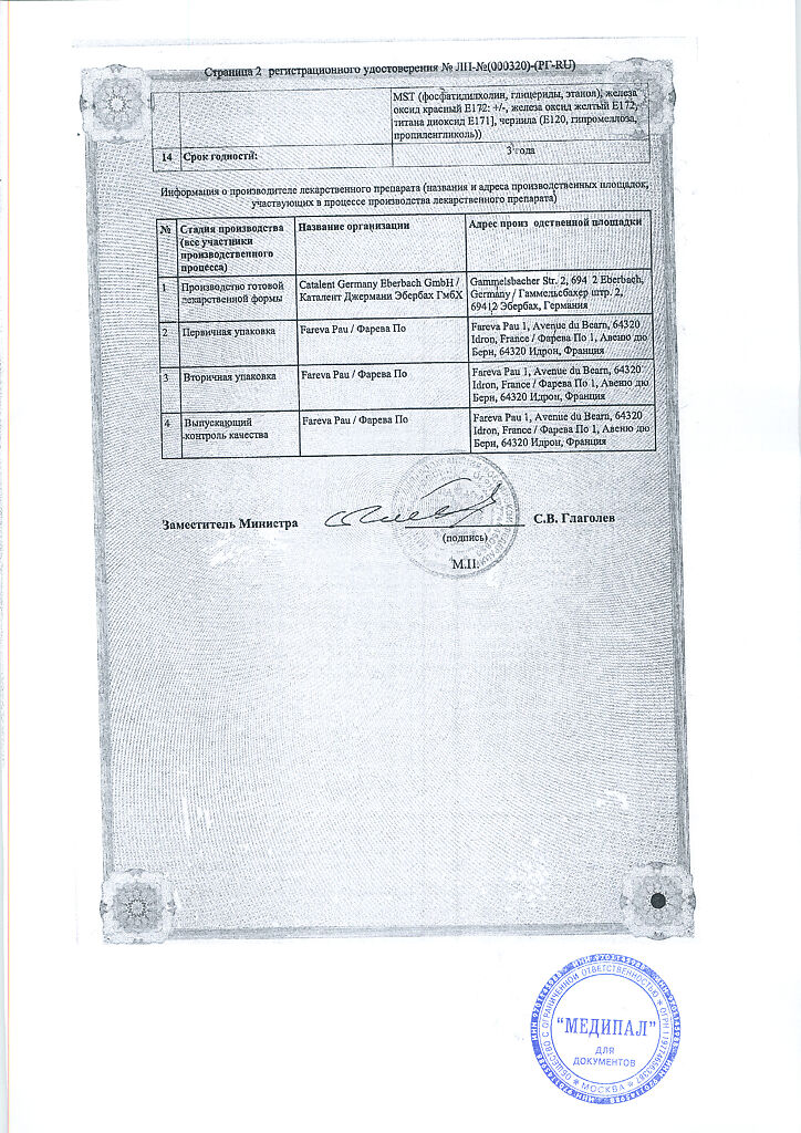 Состав оболочки капсулы: желатин, глицерол 85%, анидрисорб 85/70 (Д-сорбитол, 1,4-сорбитан, маннитол, высшие полиолы), среднецепочечные триглицериды PHOSAL 53 MST (фосфатидилхолин, глицериды, этанол), железа оксид красный (Е172), титана диоксид (Е171).