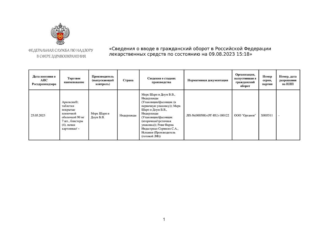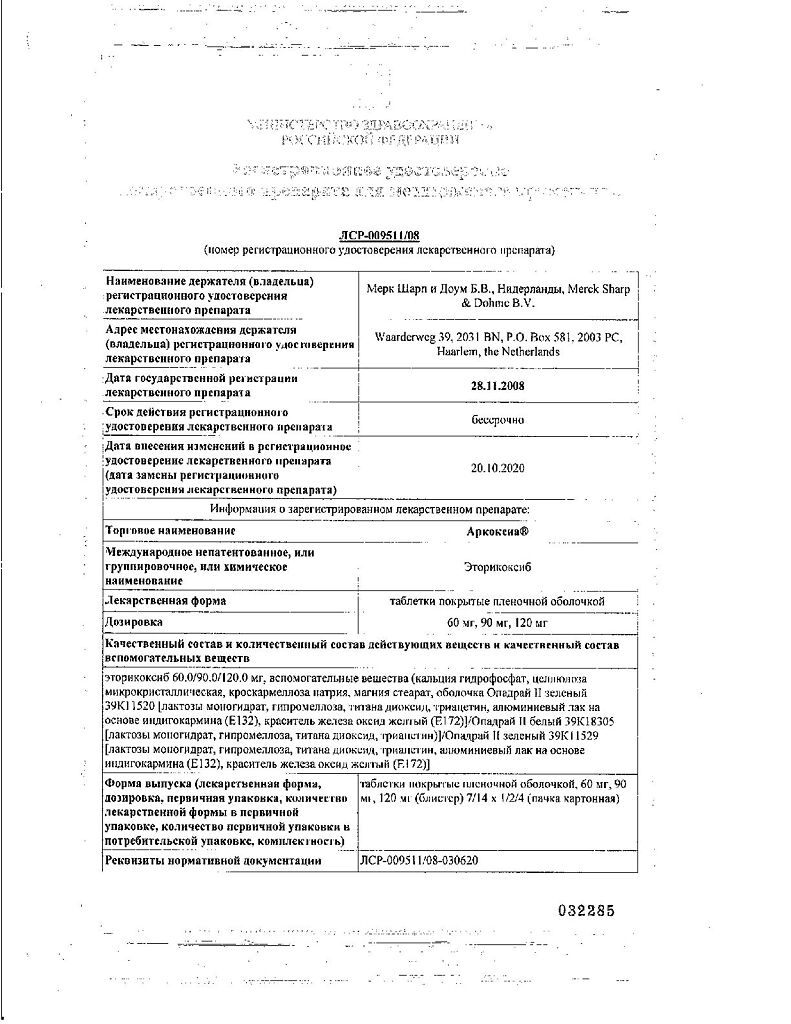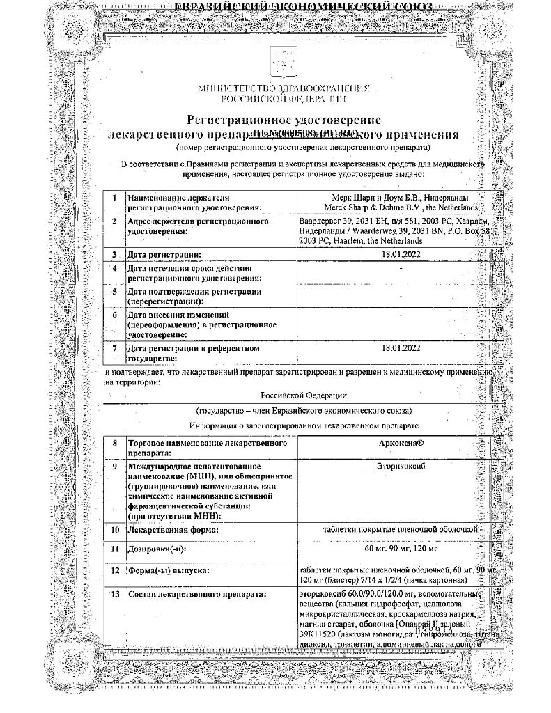 Таблетки, покрытые пленочной оболочкой зеленого (белого или светло-зеленого) цвета, двояковыпуклые, яблоковидной формы, с тиснением ARCOXIA 60 (90 или 120) на одной стороне, и с тиснением 200 (202 или 204) на другой.