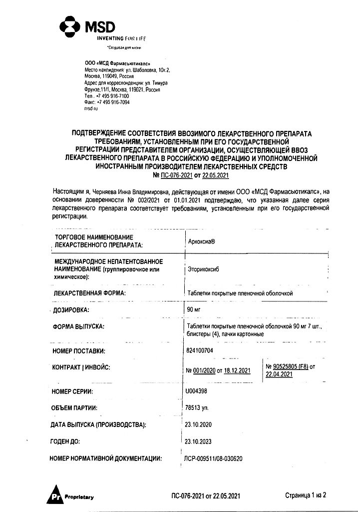 Фармдействие: Аркоксиа - НПВС. Селективный ингибитор ЦОГ-2, в терапевтических концентрациях блокирует образование простагландинов и оказывает противовоспалительное, анальгезирующее и жаропонижающее действие. Селективное угнетение ЦОГ-2 сопровождается уменьшением выраженности клинических симптомов, связанных с воспалительным процессом, при этом отсутствует влияние на функцию тромбоцитов и слизистую оболочку ЖКТ.